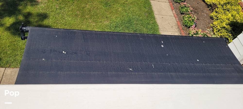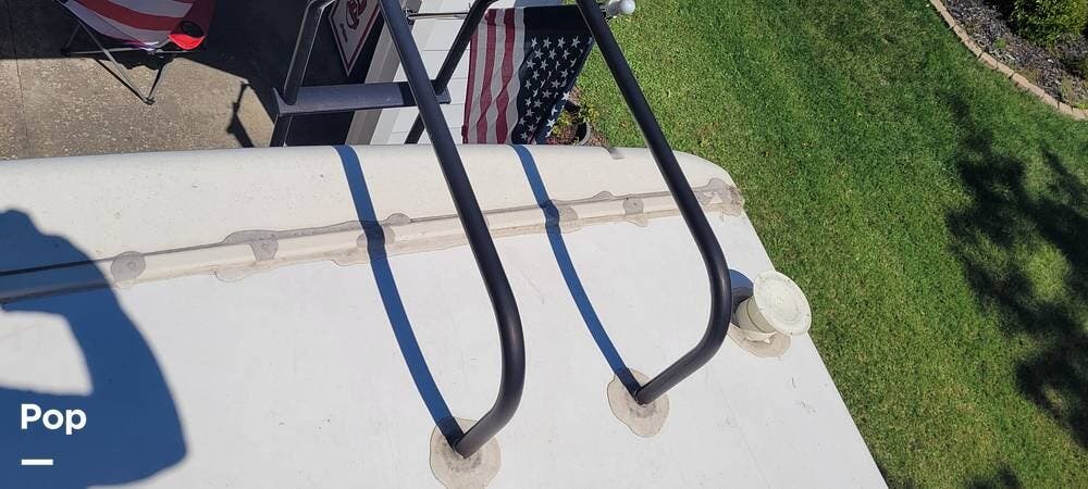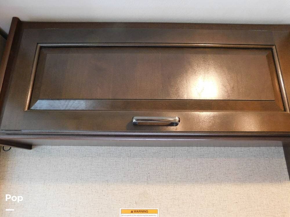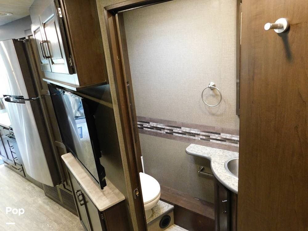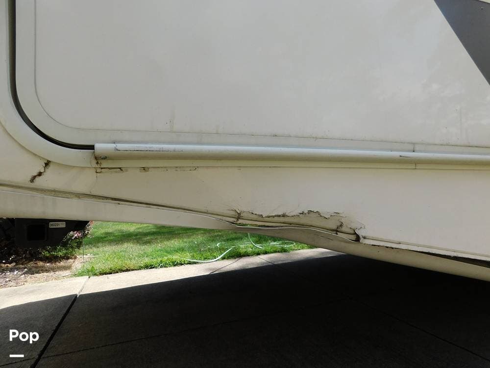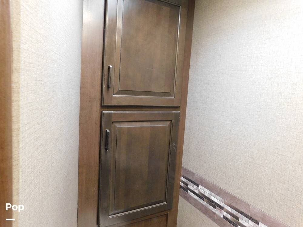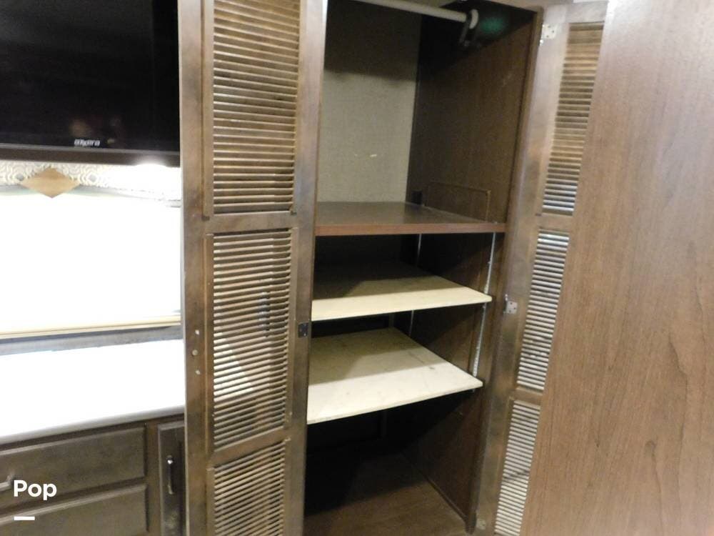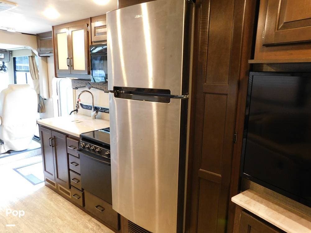 This motorhome measures approximately 36 feet in length, offering a spacious interior with two slide-outs that expand the living area and bedroom, enhancing the overall sense of space.