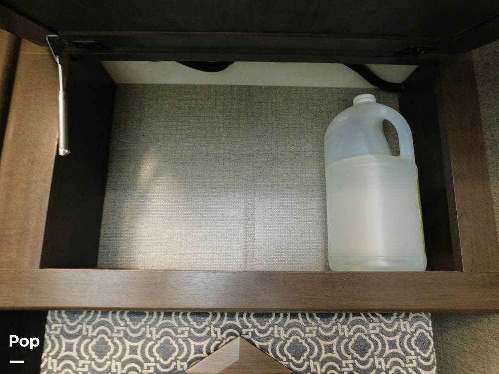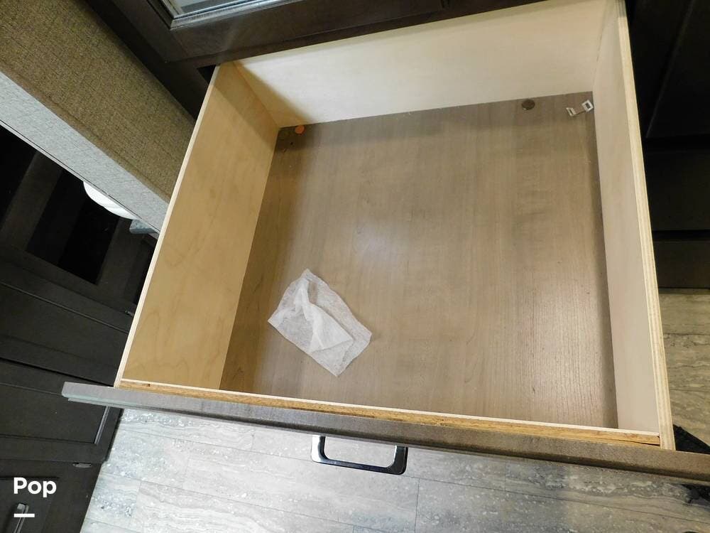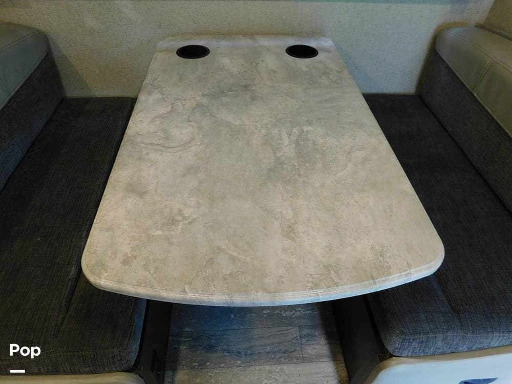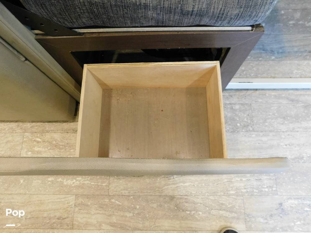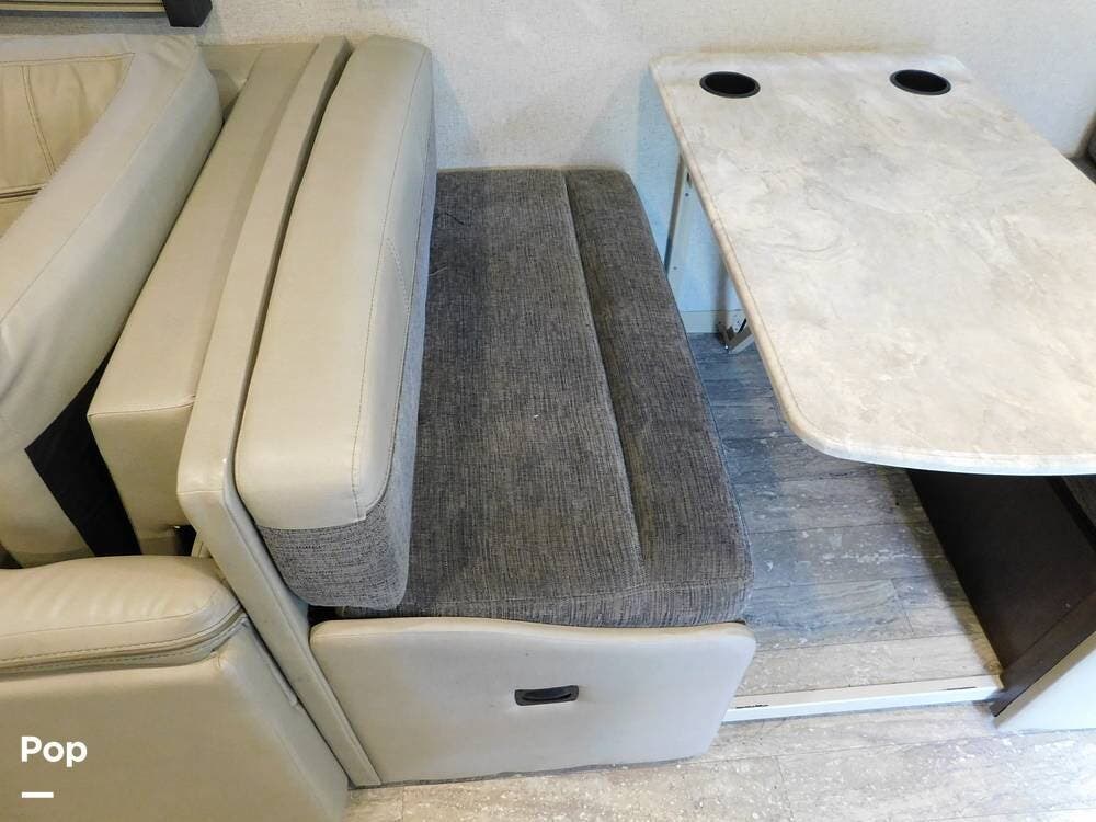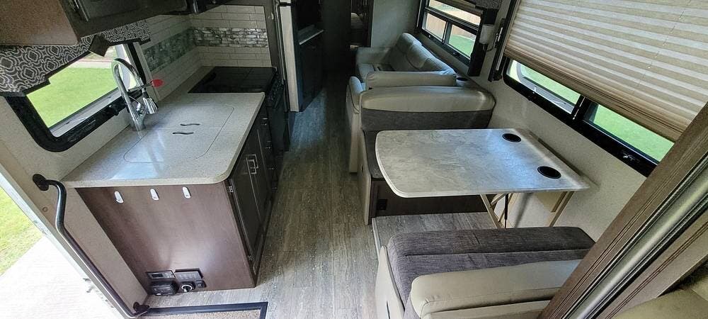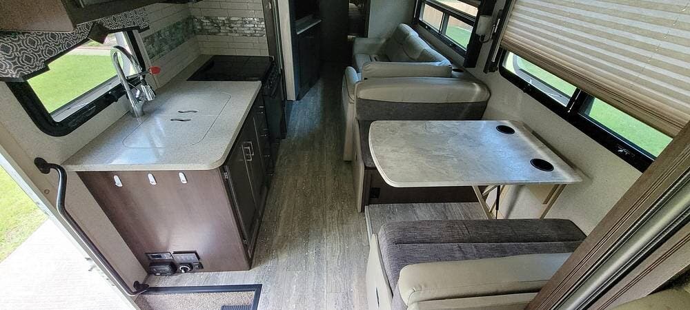 The main living area is thoughtfully designed with residential amenities, including a dream dinette and an L-shaped expanding sofa, both of which can convert into sleeping spaces for guests. Large panoramic windows allow for ample natural light, while roller shades offer privacy and comfort. Up front, it features reclining/swivel captain's chairs, a stow-away coffee table, and a drop-down, hide-away overhead bunk.