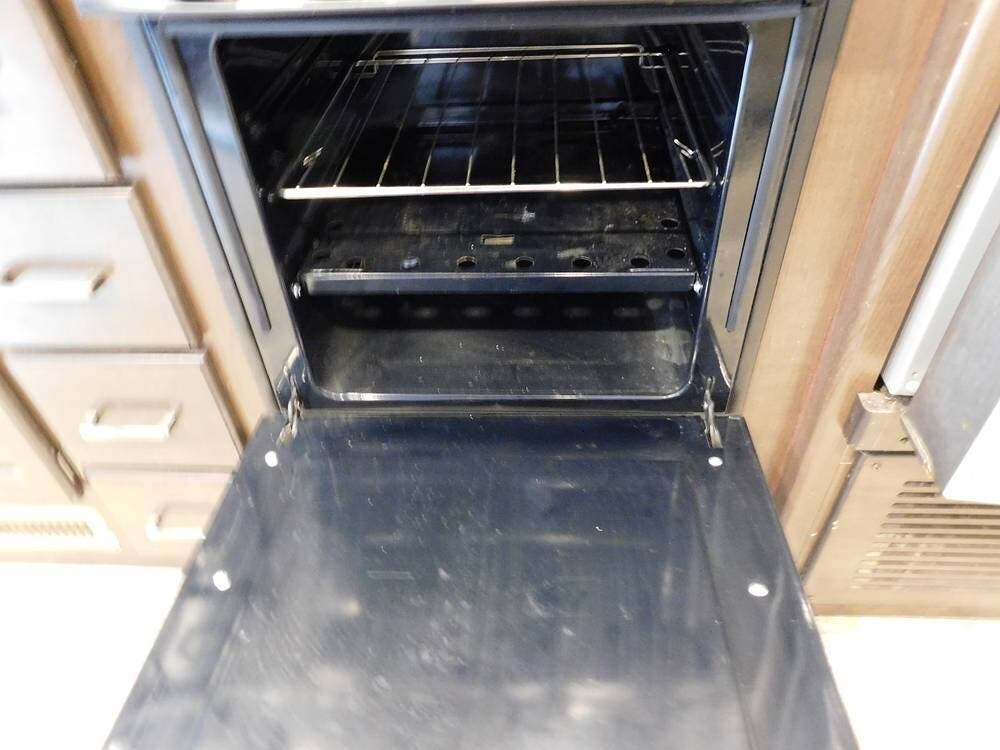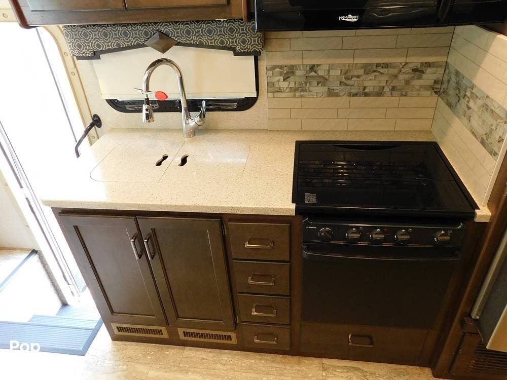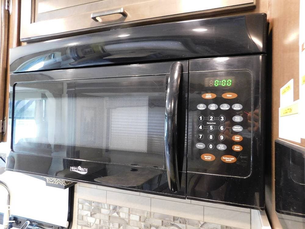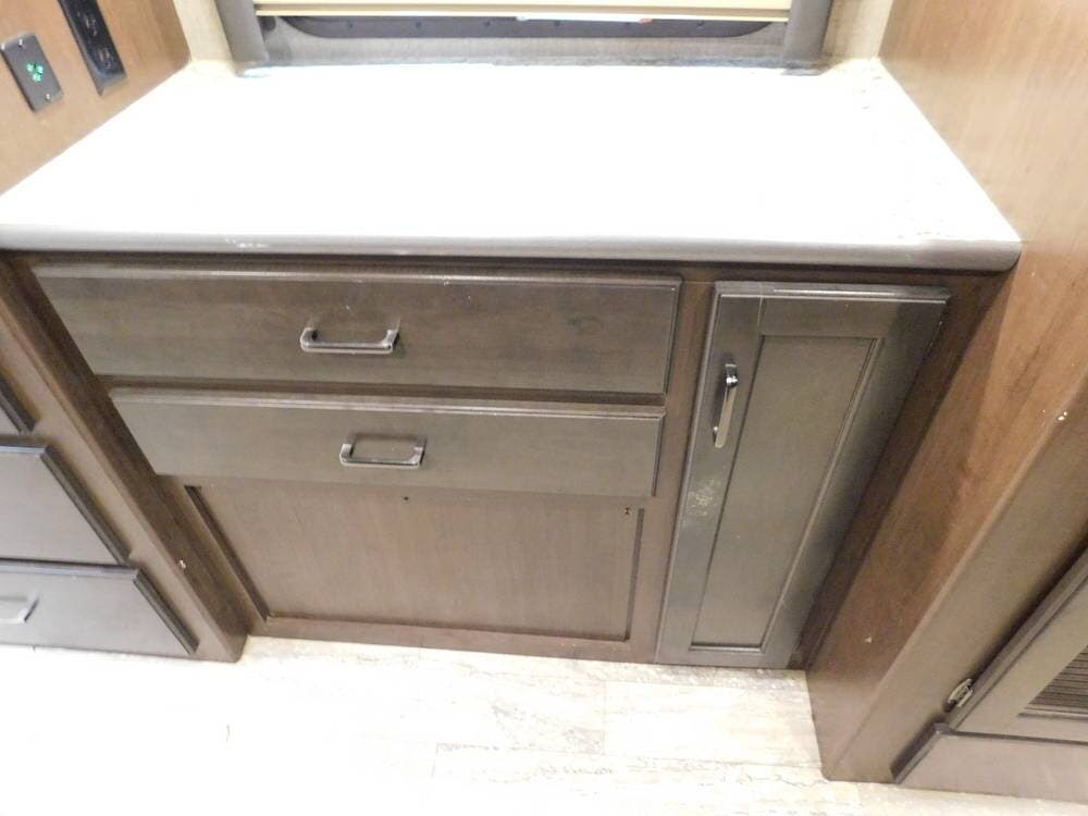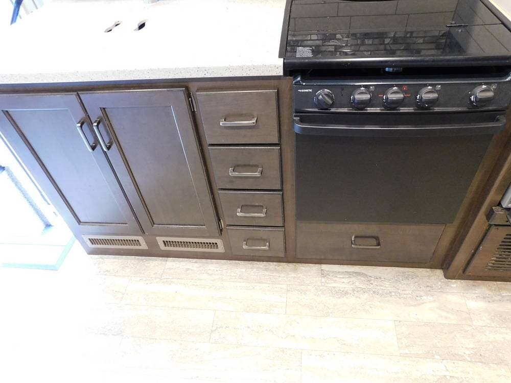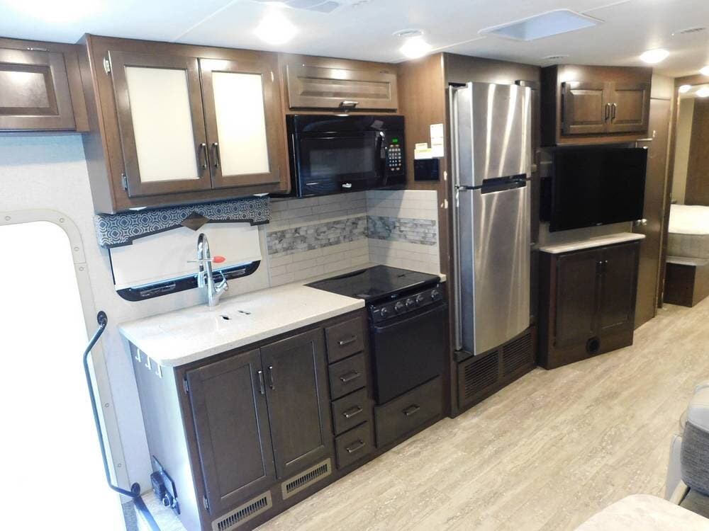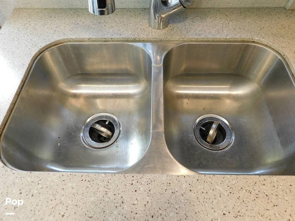 The kitchen in the Hurricane 35M is designed for convenience and style, featuring solid surface countertops, a residential-size refrigerator with ice maker, a three-burner gas cooktop with oven, and a microwave. There is abundant storage throughout, including overhead cabinets and a pantry, making it easy to bring along all the necessary cookware, utensils, and supplies for extended trips. The double-basin stainless steel sink, paired with a pull-down faucet, enhances the functionality and ease of meal preparation.