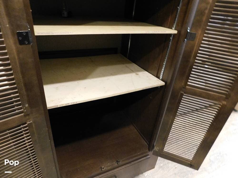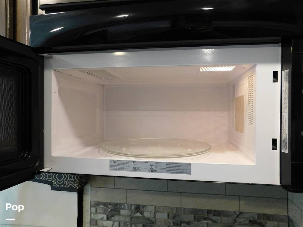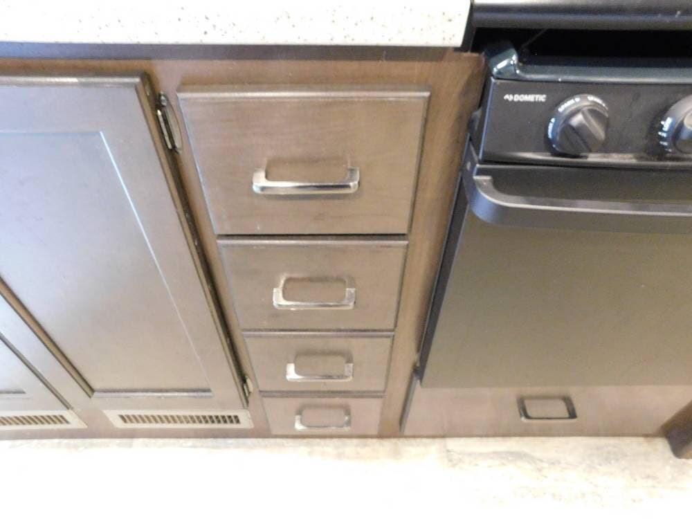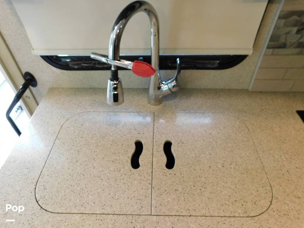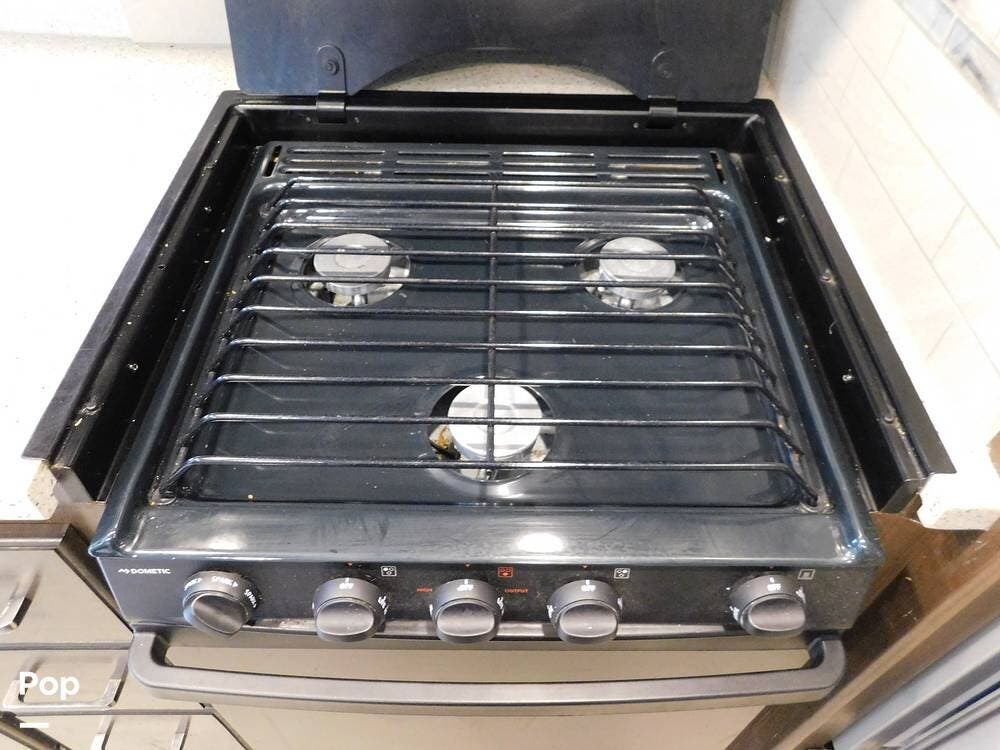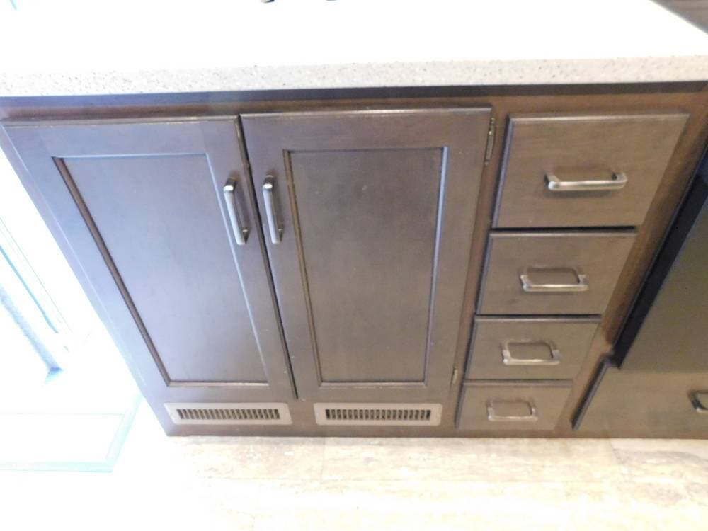 The kitchen in the Hurricane 35M is designed for convenience and style, featuring solid surface countertops, a residential-size refrigerator with ice maker, a three-burner gas cooktop with oven, and a microwave. There is abundant storage throughout, including overhead cabinets and a pantry, making it easy to bring along all the necessary cookware, utensils, and supplies for extended trips. The double-basin stainless steel sink, paired with a pull-down faucet, enhances the functionality and ease of meal preparation.