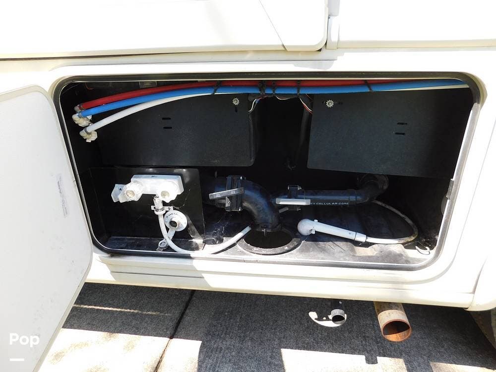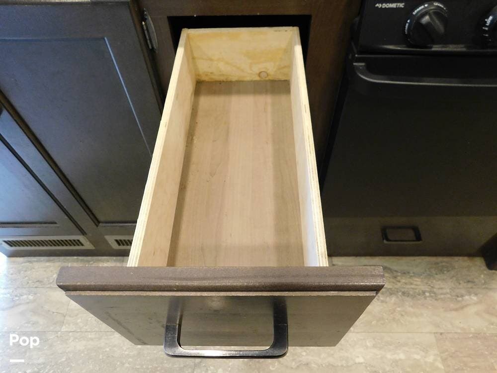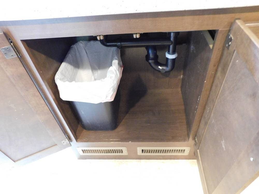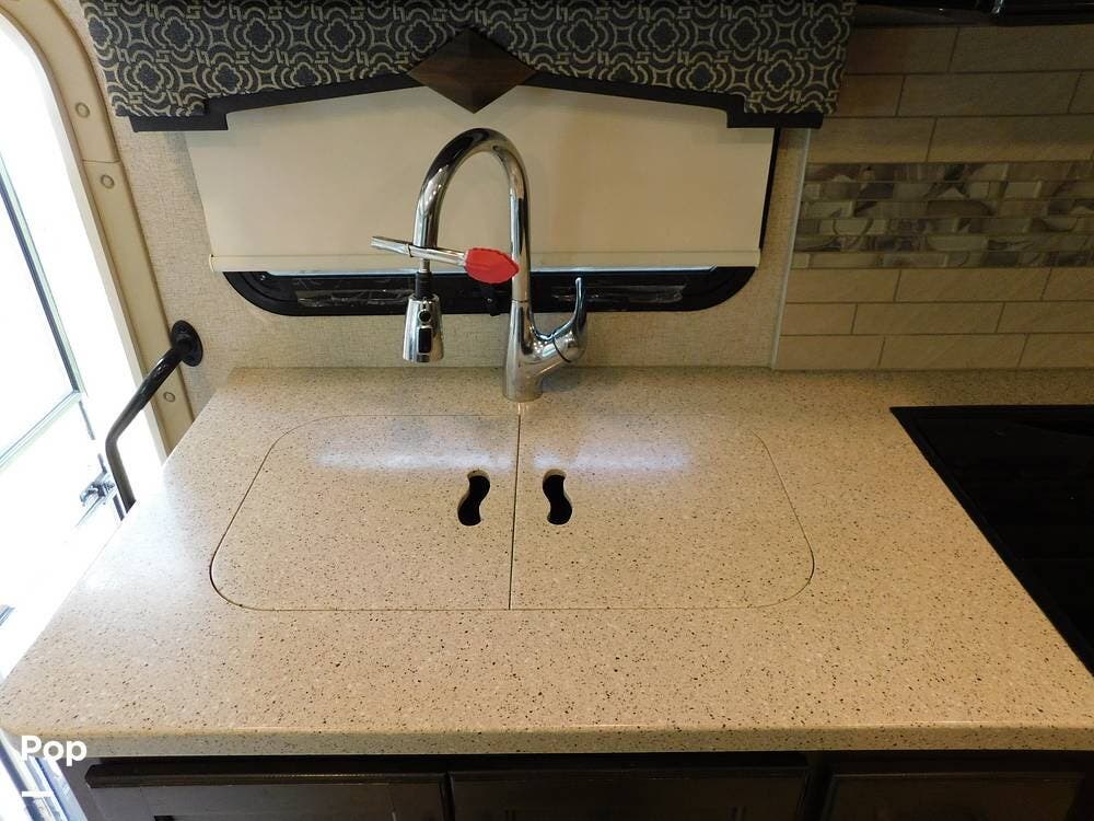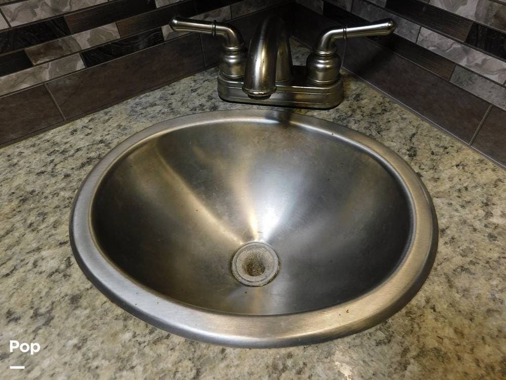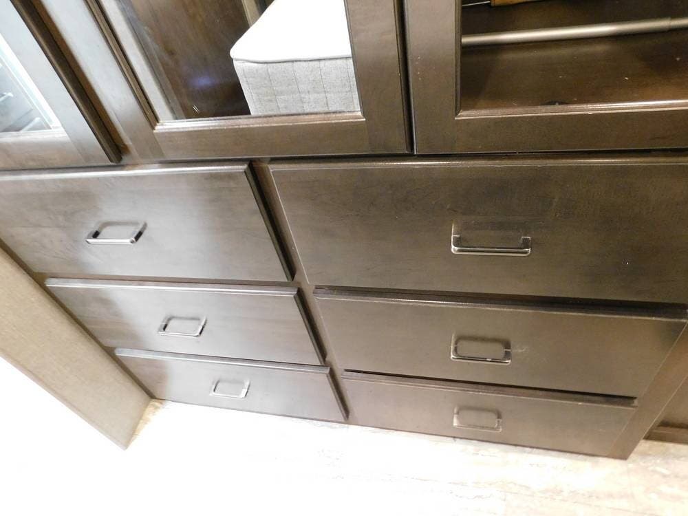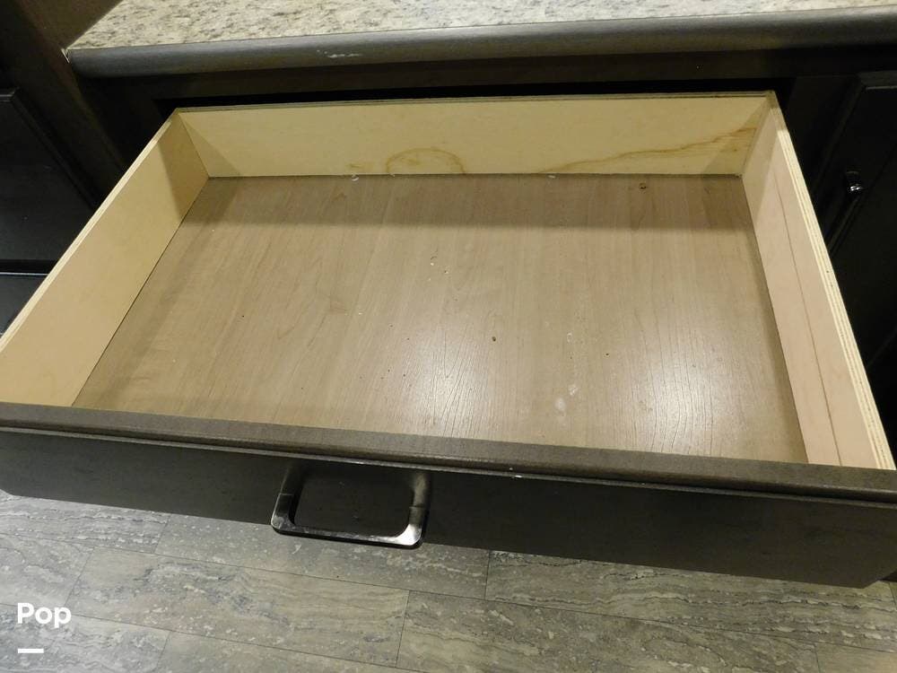 The kitchen in the Hurricane 35M is designed for convenience and style, featuring solid surface countertops, a residential-size refrigerator with ice maker, a three-burner gas cooktop with oven, and a microwave. There is abundant storage throughout, including overhead cabinets and a pantry, making it easy to bring along all the necessary cookware, utensils, and supplies for extended trips. The double-basin stainless steel sink, paired with a pull-down faucet, enhances the functionality and ease of meal preparation.