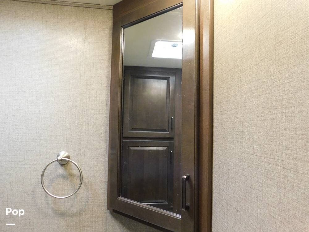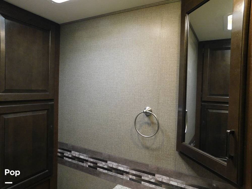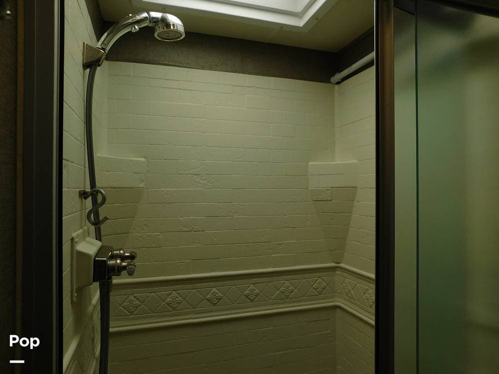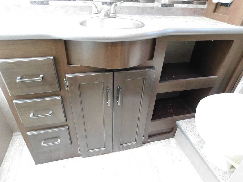 One of the highlights of the 35M floor plan is its dual-bathroom setup. The coach features a full bathroom located at the rear, accessible from the rear bedroom. This bathroom includes a shower with glass doors, a porcelain toilet, a sink, and ample cabinet space. Additionally, a convenient half bath is located mid-ship for guests and daytime use.