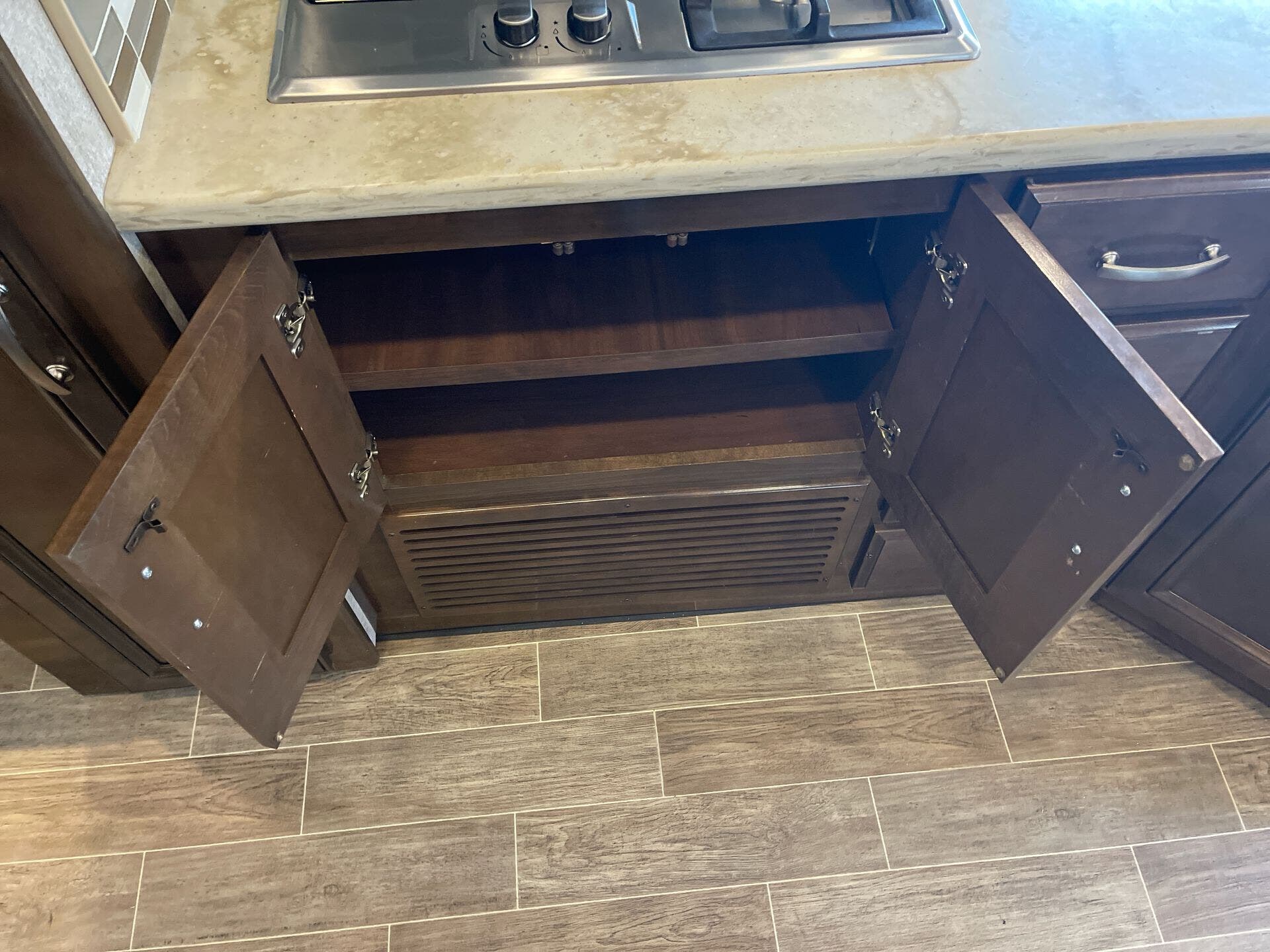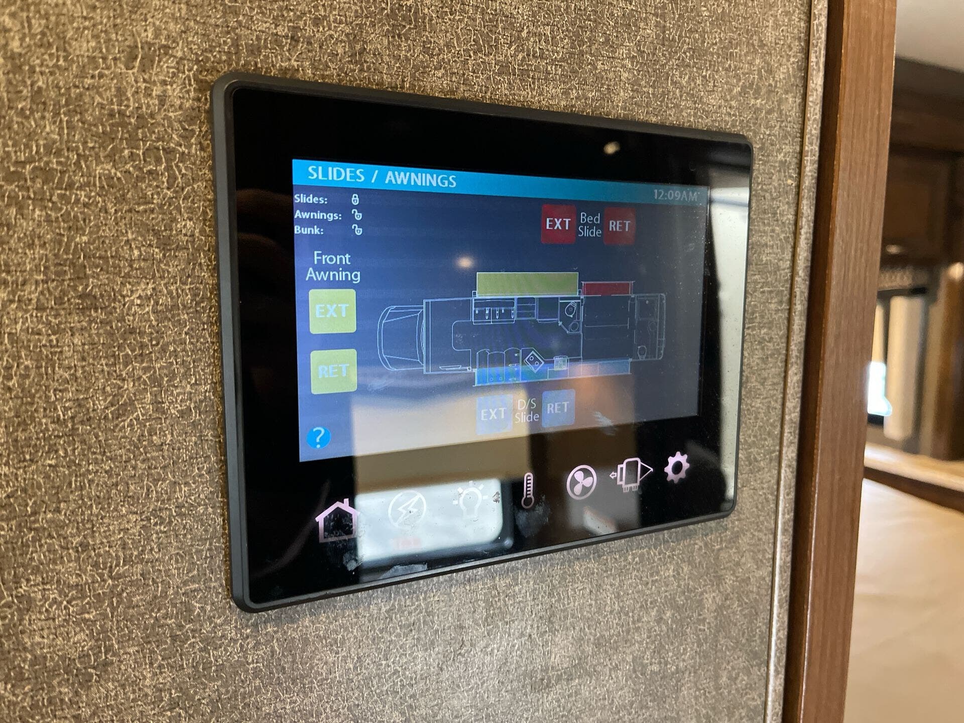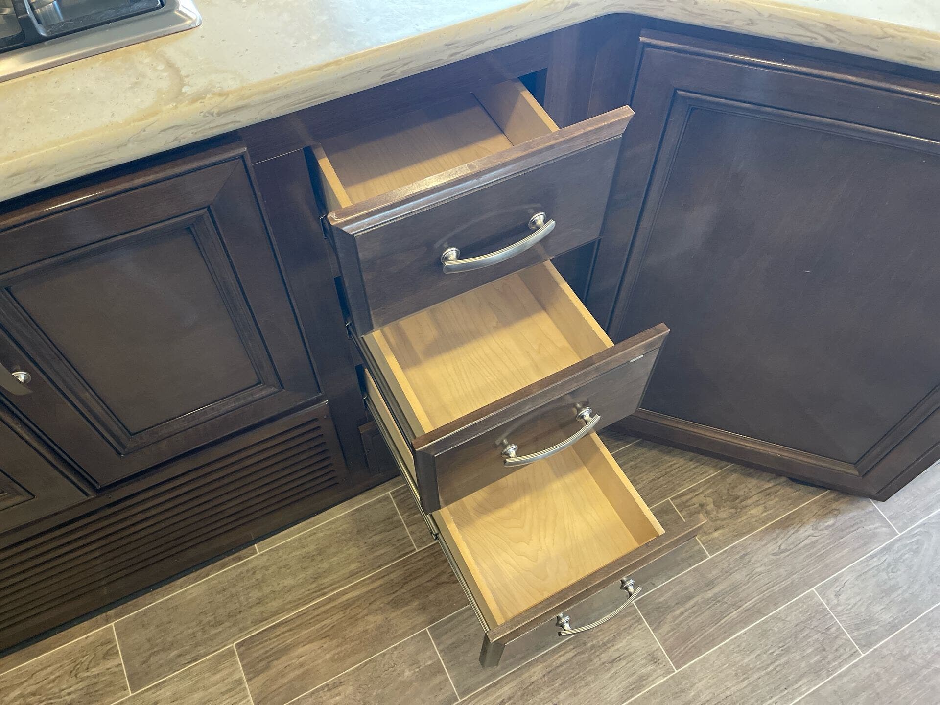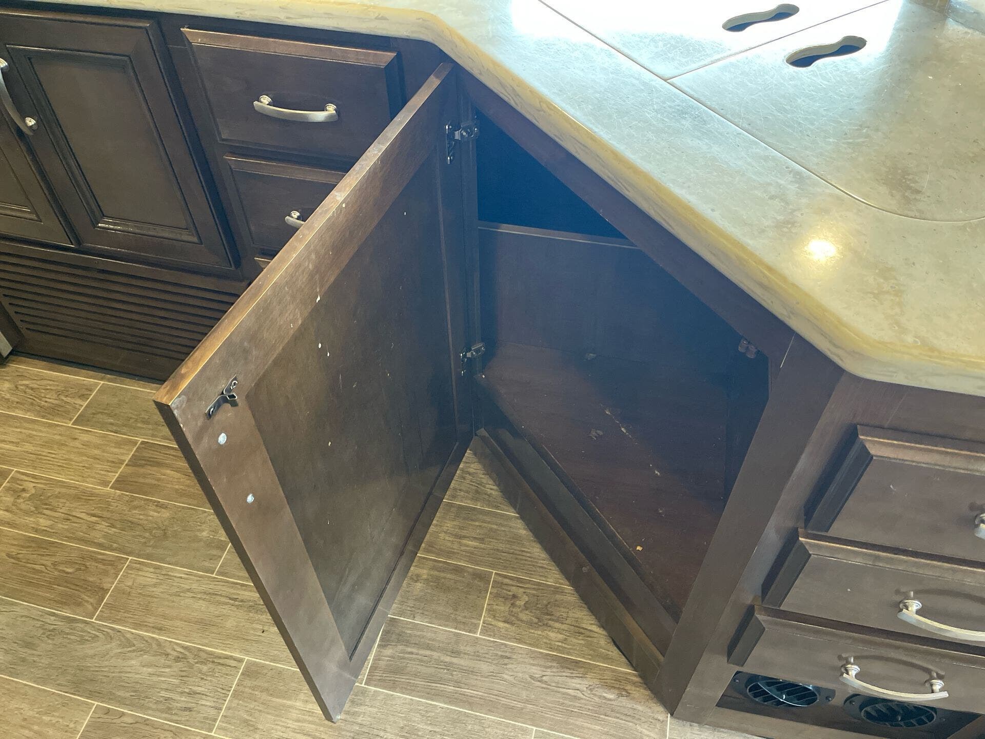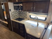 Forward of the bunkhouse, the main living area offers a slide-out that expands the dinette and sofa seating, creating an open, social space for dining, watching TV, or relaxing. The galley kitchen is well-equipped for meal prep while on the road, featuring a three-burner cooktop, microwave convection oven, and a residential-style refrigerator. Opposite the kitchen, abundant cabinetry and pantry storage help keep gear organized.