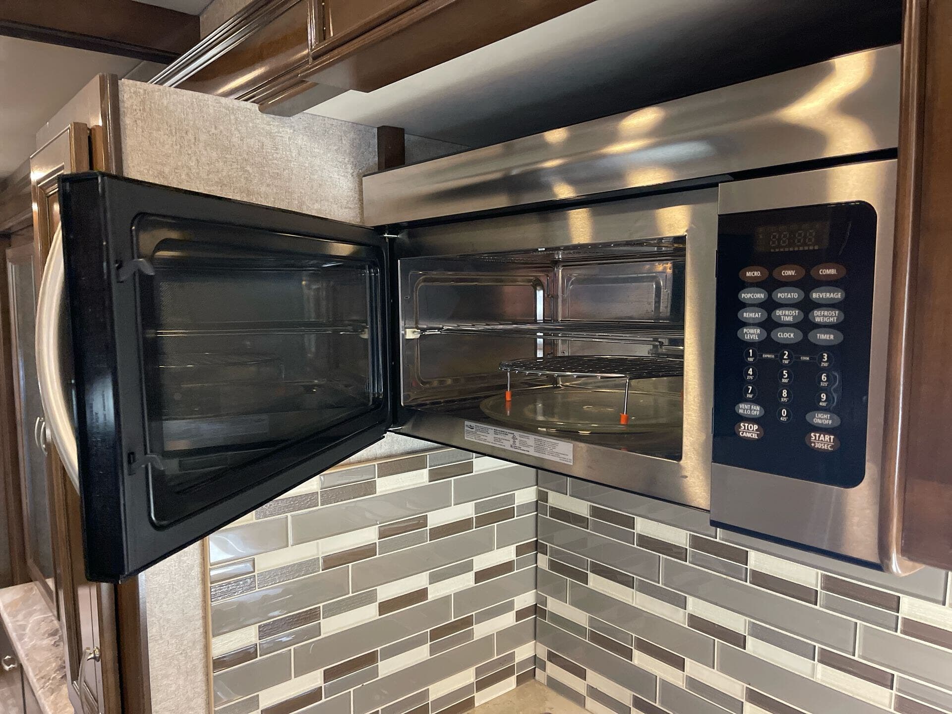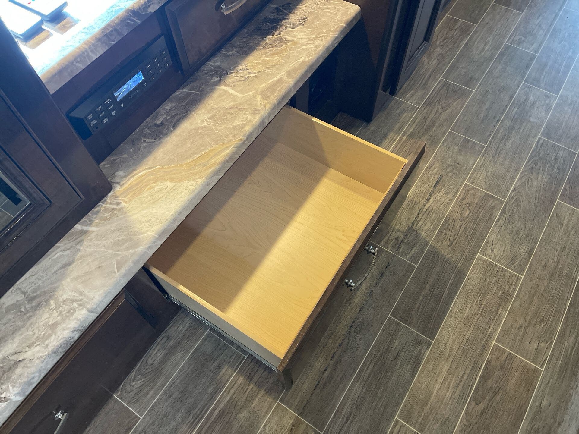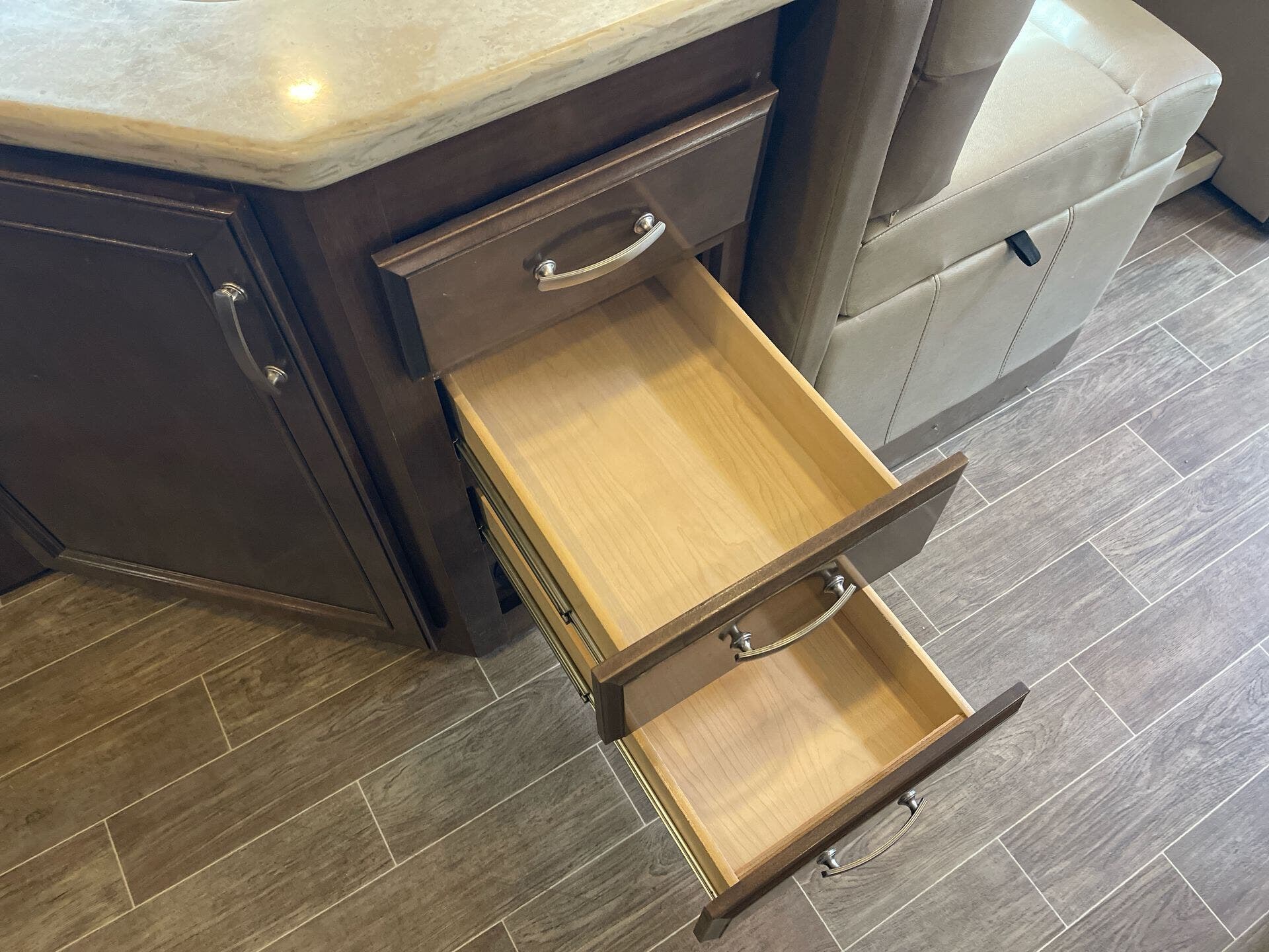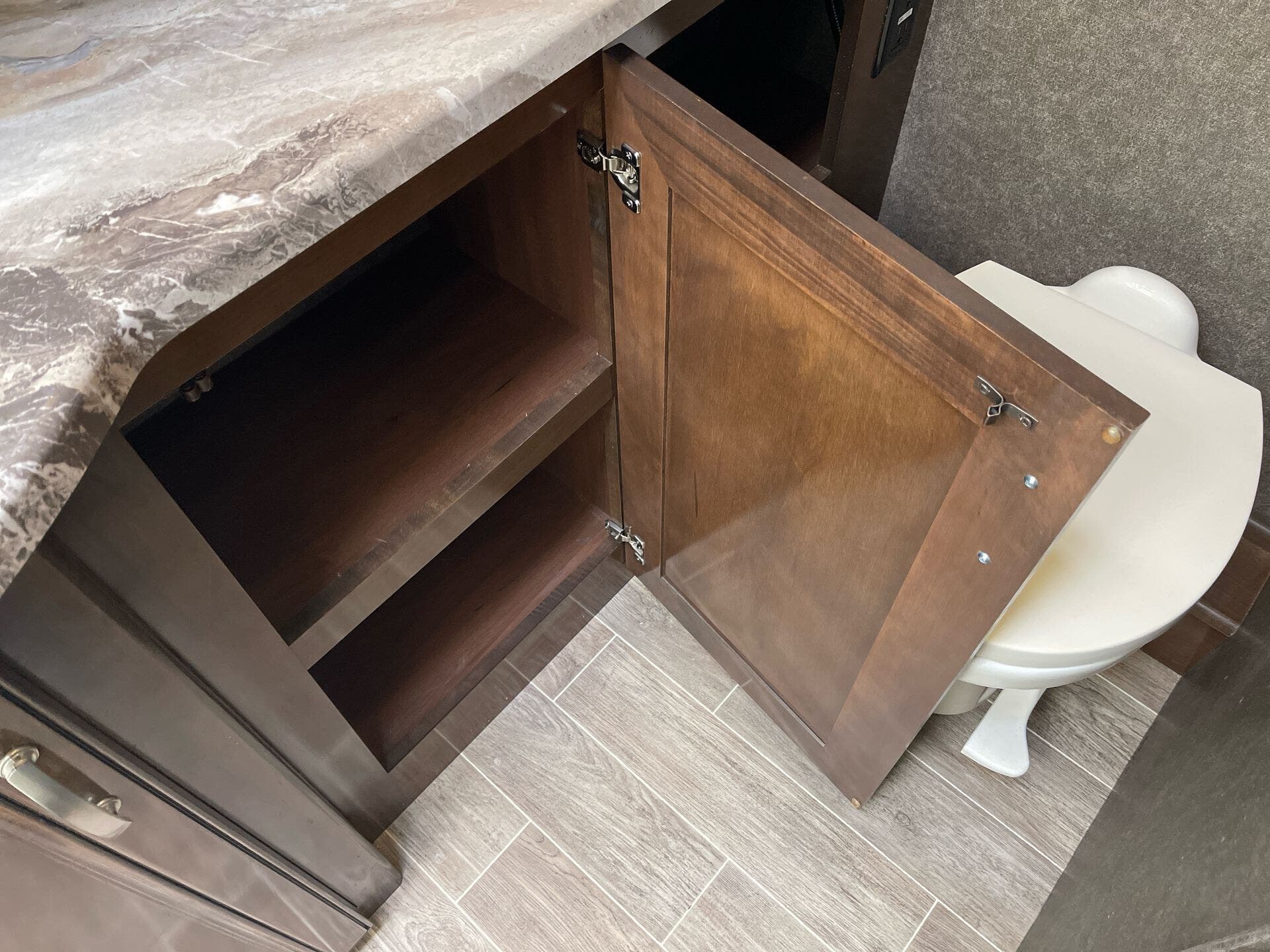 Forward of the bunkhouse, the main living area offers a slide-out that expands the dinette and sofa seating, creating an open, social space for dining, watching TV, or relaxing. The galley kitchen is well-equipped for meal prep while on the road, featuring a three-burner cooktop, microwave convection oven, and a residential-style refrigerator. Opposite the kitchen, abundant cabinetry and pantry storage help keep gear organized.