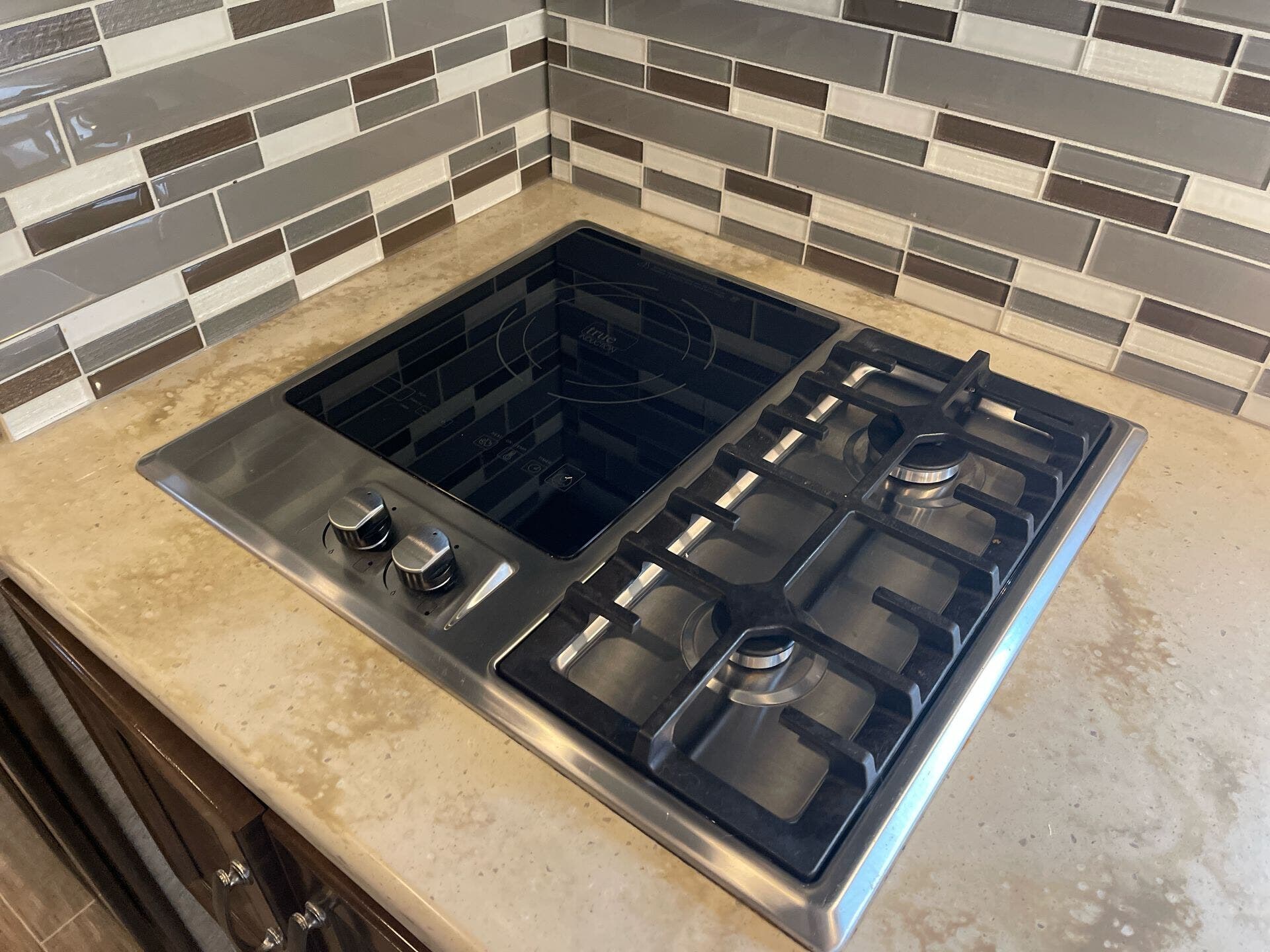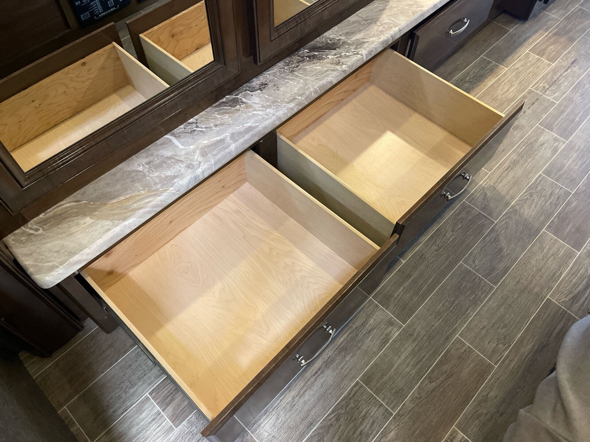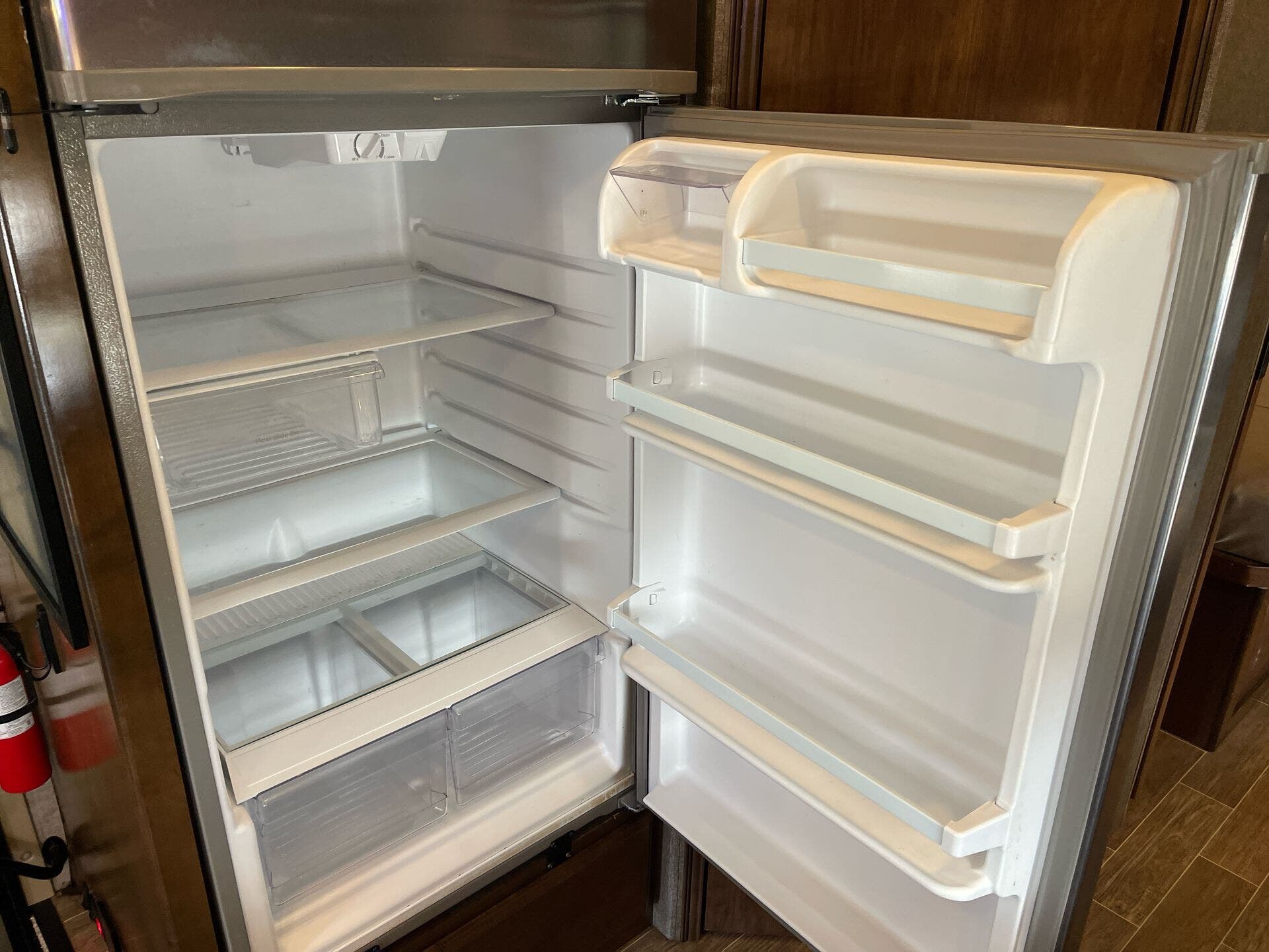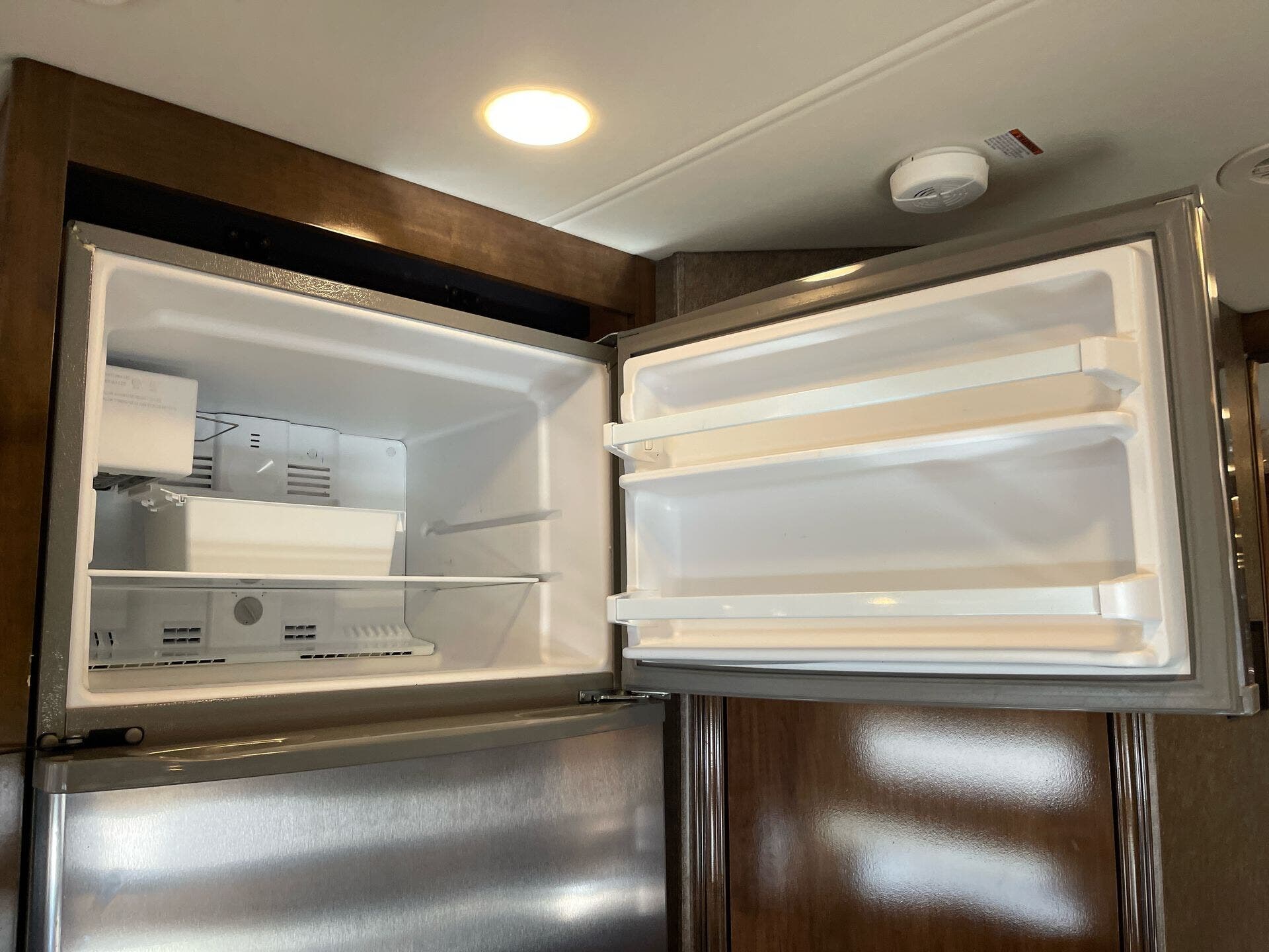 Forward of the bunkhouse, the main living area offers a slide-out that expands the dinette and sofa seating, creating an open, social space for dining, watching TV, or relaxing. The galley kitchen is well-equipped for meal prep while on the road, featuring a three-burner cooktop, microwave convection oven, and a residential-style refrigerator. Opposite the kitchen, abundant cabinetry and pantry storage help keep gear organized.