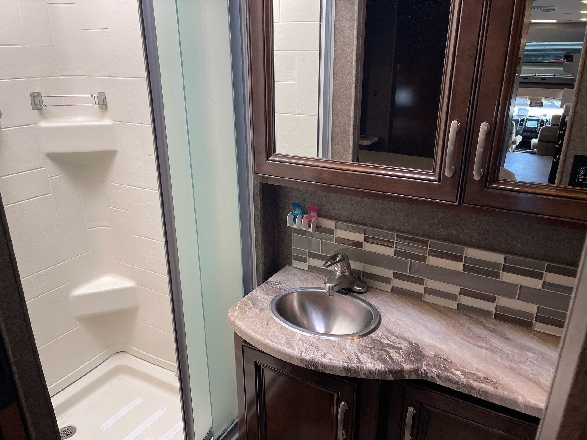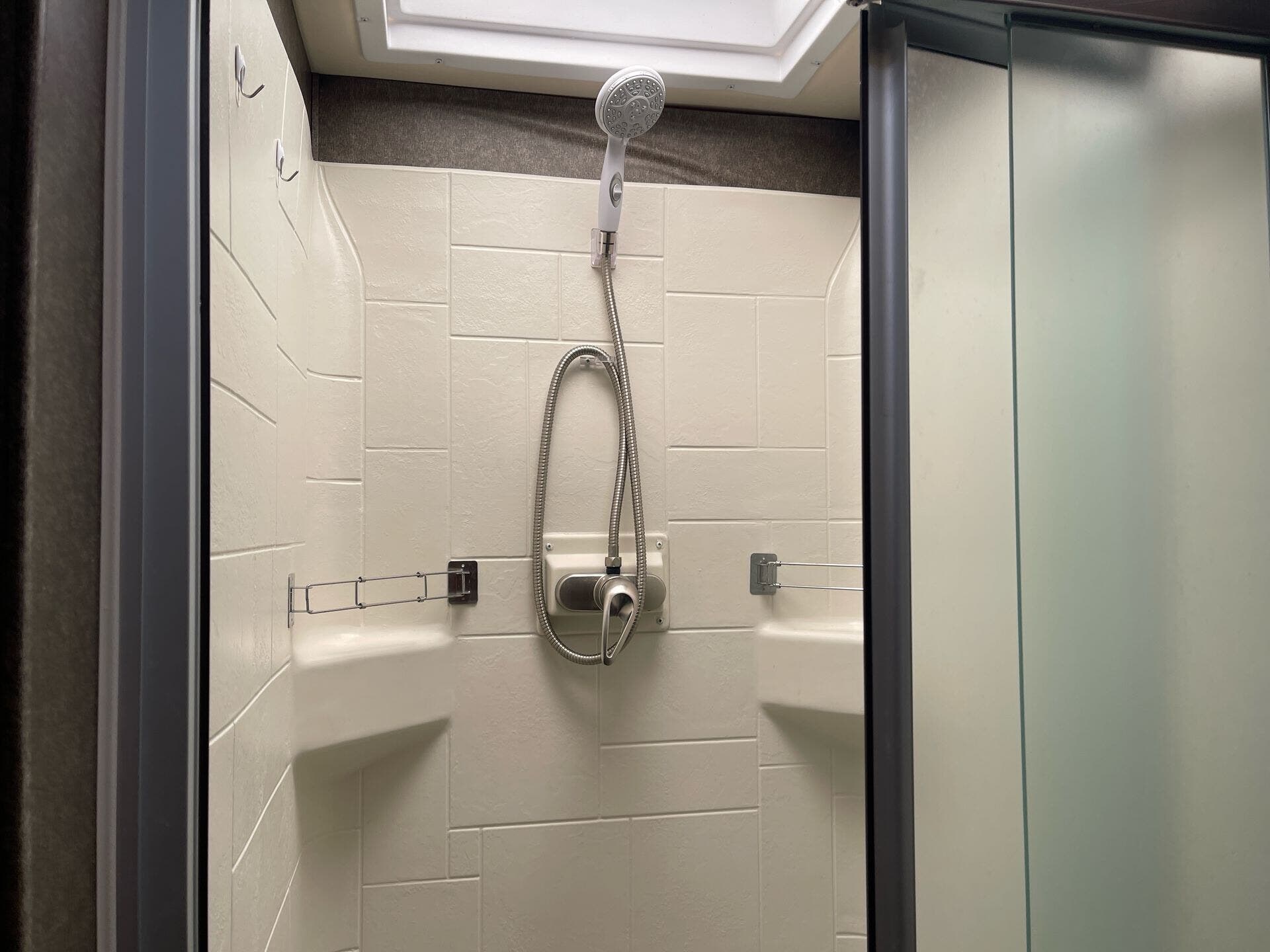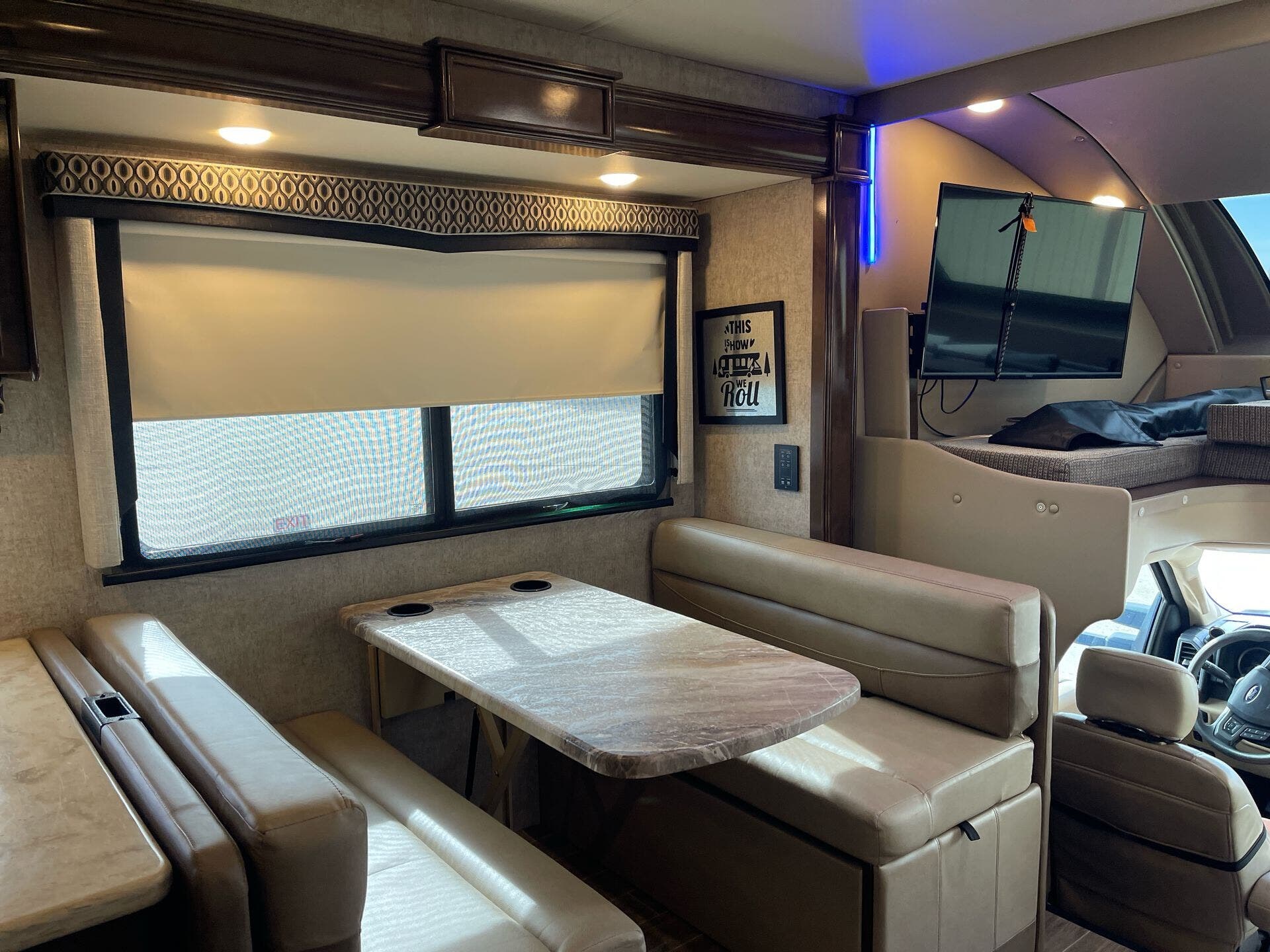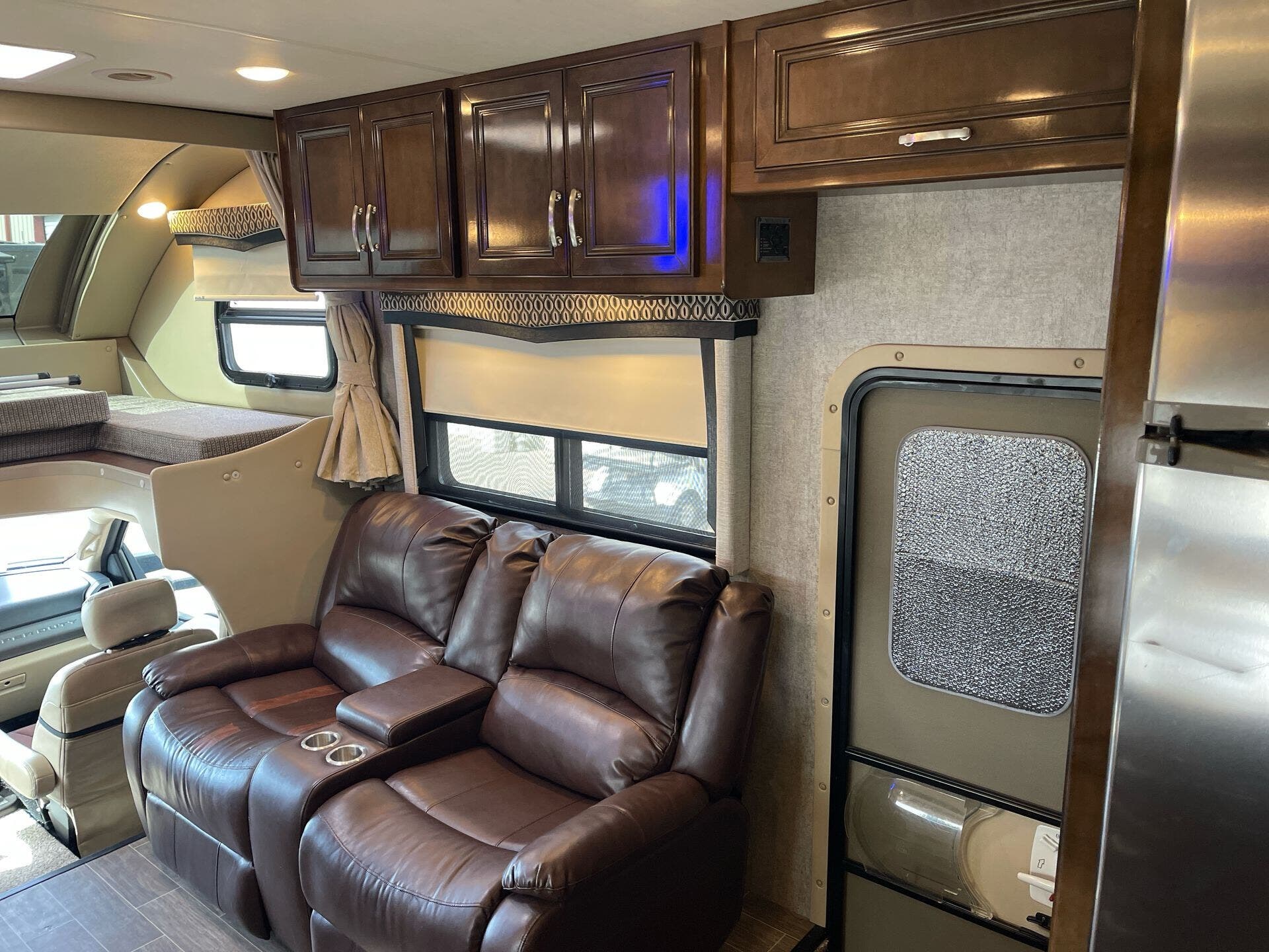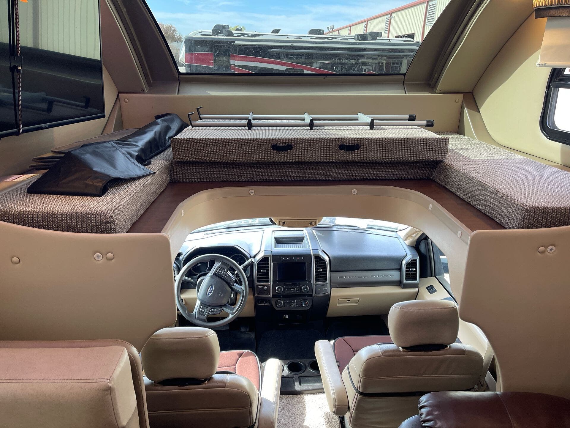 Up front, the driver and passenger captain’s chairs swivel into the living area, adding seating flexibility. The private bedroom includes a comfortable queen bed with bedside storage. A full bathroom with separate shower and toilet keeps the interior functional for everyday living. With its balance of sleeping capacity, usable living space, and smart layout, the 2020 Thor Omni BH35 is a great choice for families or groups seeking affordable comfort and convenience on the road.