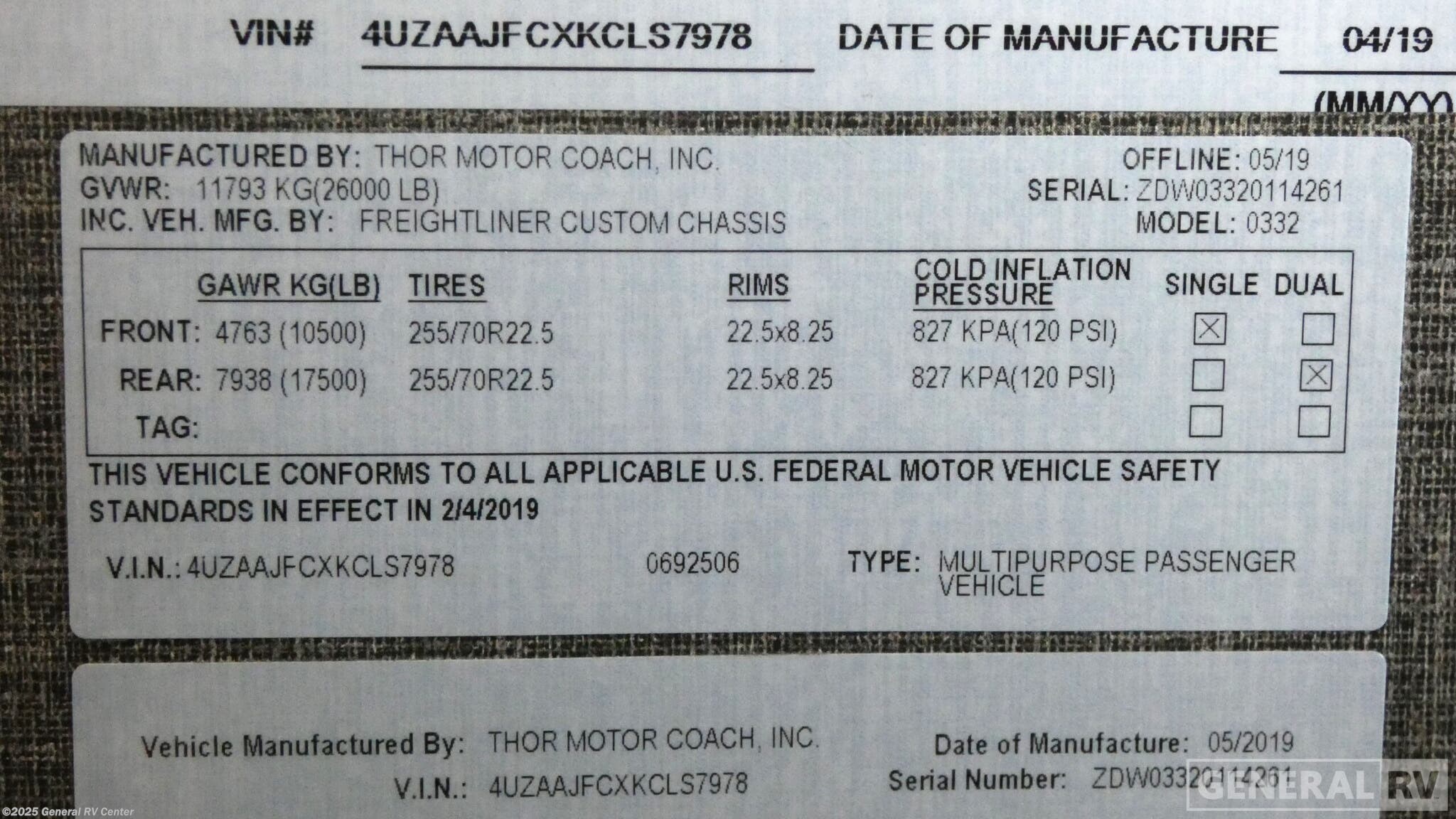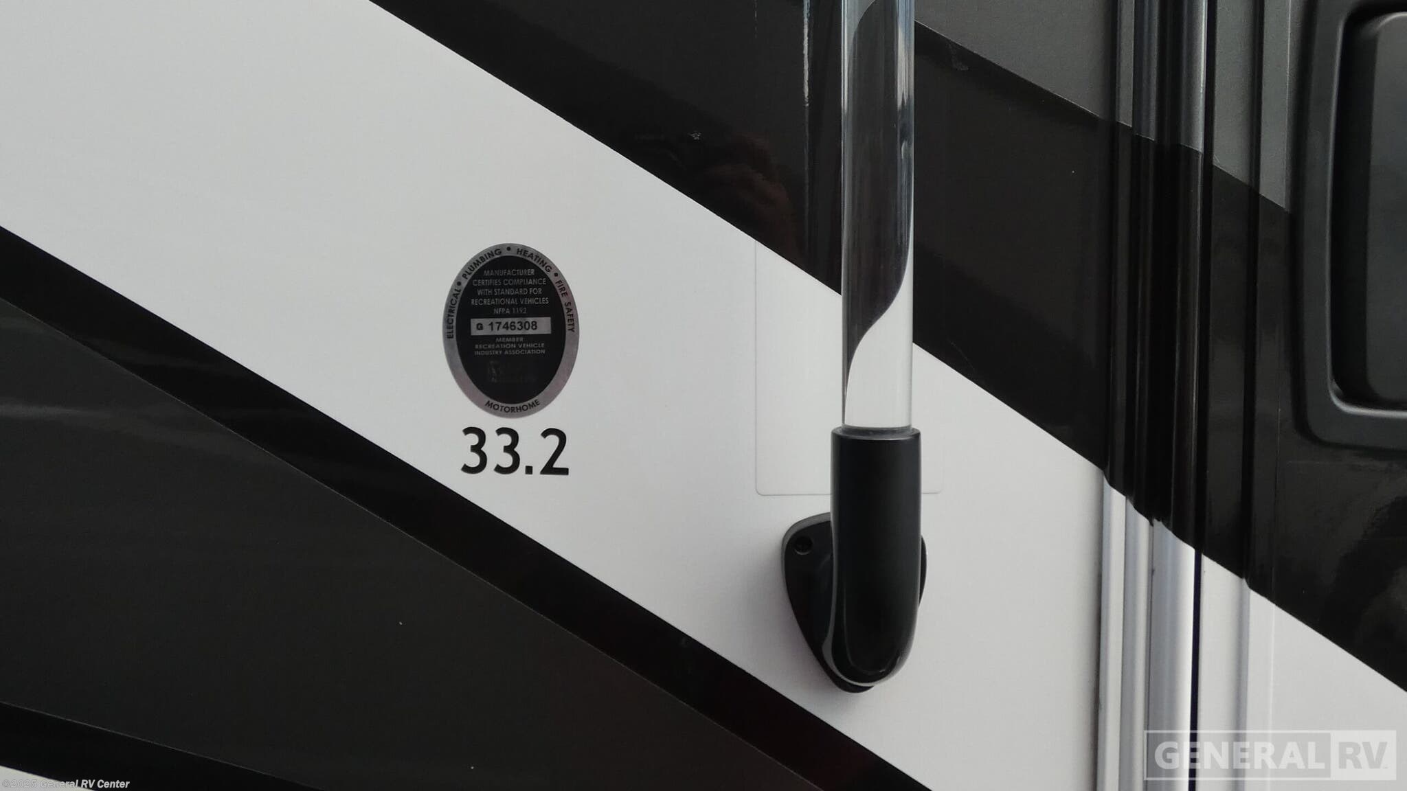 Experience the open road like never before with the 2020 Thor Motor Coach Palazzo 33.2. Designed with both luxury and practicality in mind, this diesel pusher offers a seamless blend of comfort and performance. With its powerful Cummins I6 engine on a Freightliner XC-Series chassis, you'll enjoy smooth travels and impressive towing capabilities of up to 10,000 pounds. Measuring nearly 35 feet in length, this RV ensures you have ample space to relax and entertain. Inside, the Palazzo 33.2 is a haven of comfort. The spacious front living area features a 72" dream dinette and a cozy 26" sofa bed, perfect for family gatherings or movie nights on the 40" TV. The center kitchen is equipped with a full-size residential refrigerator and a three-burner cooktop, making meal prep a breeze. The rear bedroom offers a serene retreat with a queen bed and plenty of storage, including dual closets and a dresser. Plus, the RV is prepped for a stackable washer and dryer, adding convenience to your adventures. Step outside under the expansive 18 ft. powered retractable awning and enjoy the exterior 39" TV, perfect for outdoor entertainment. With a fresh water capacity of 95 gallons, a robust electrical system, and thoughtfully designed storage, the Palazzo 33.2 is ready for any adventure you embark on. Discover more about this exceptional RV at your nearest General RV dealership location.