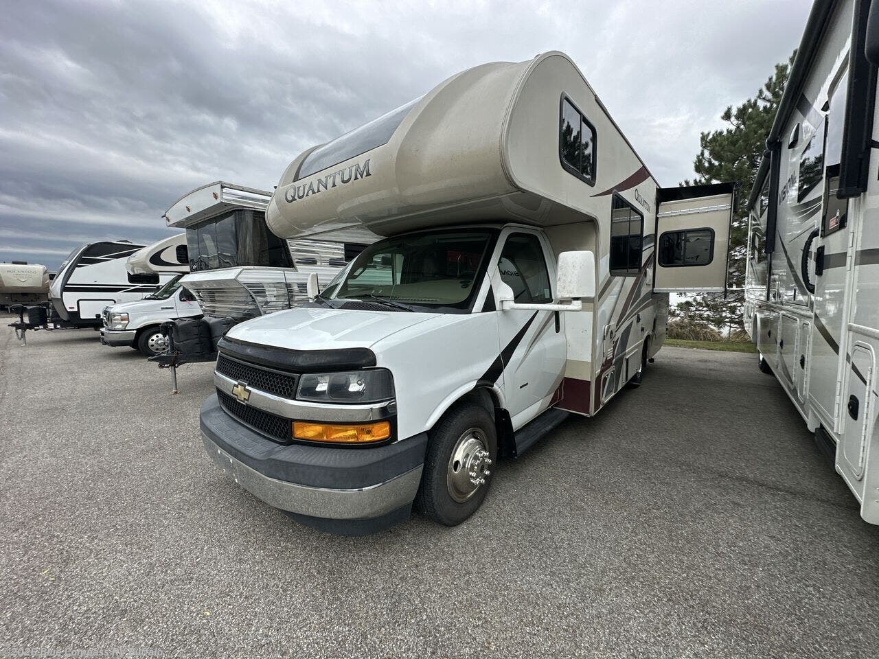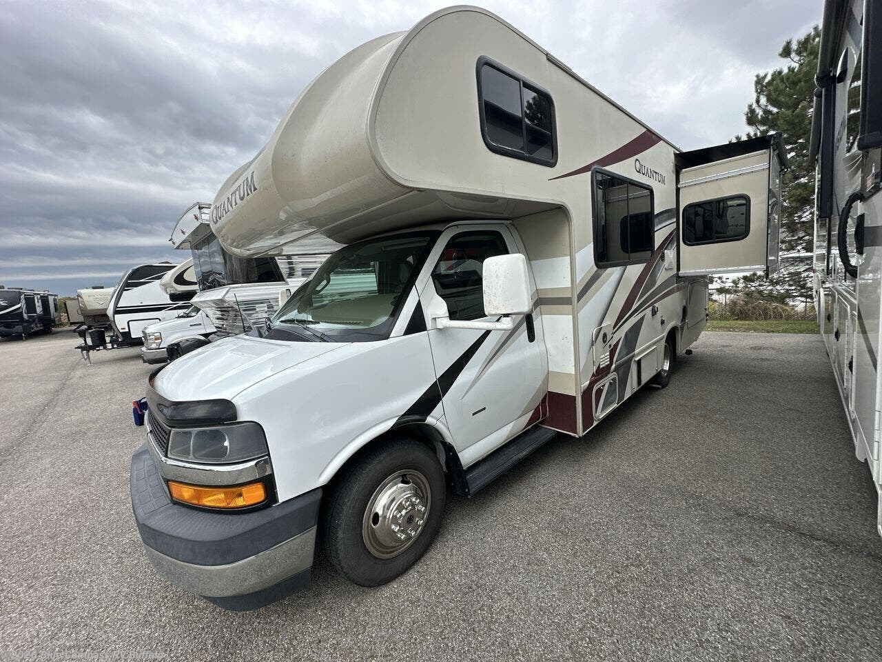 Start your greatest adventure as soon as the tires hit the road in any one of these Thor Motor Coach Quantum Class C gas motorhomes! The welded tubular steel floor, the Ford E-series chassis, and the vacu-bond laminated roof, walls, and floors with block foam insulation ensure that you will have years of enjoyment. You will also enjoy all of the convenient features throughout the interior like the touchscreen dash radio with navigation and a back-up monitor to keep you safe on the road. With solid surface countertops, high-gloss solid wood cabinetry, and LED lighting, you will feel right at home. And for your safety, there are smoke, LPG, and carbon monoxide detectors, as well as a fire extinguisher. So get on the road to adventure today with a Quantum Class C gas motorhome by Thor Motor Coach!