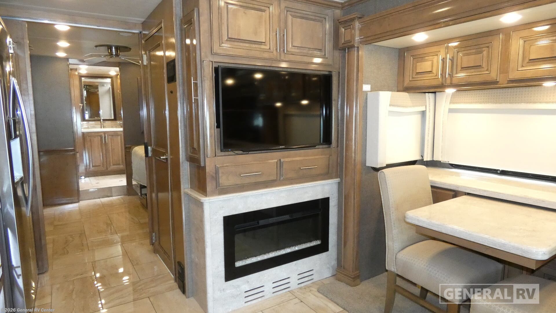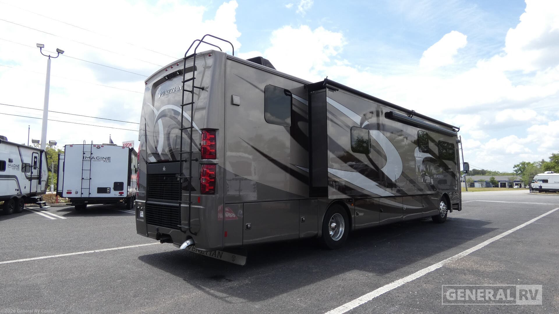 Step into the luxurious world of the 2020 Thor Motor Coach Venetian R40, where elegance and functionality blend seamlessly. This stunning motorhome, built on a robust Freightliner XC-Series chassis and powered by a mighty Cummins I6 Diesel Pusher engine, offers a smooth and powerful ride with 380 horsepower and 1150 lb-ft of torque. With a spacious 40.83-foot length, this RV is designed for those who appreciate the finer things in life while exploring the open road. Inside, you'll find a thoughtfully designed layout that accommodates up to ten sleepers comfortably. The master suite boasts a Tilt-A-View inclining king bed, perfect for unwinding after a day of adventure. The center kitchen is equipped with a full-size residential refrigerator and a convenient microwave, making meal prep a breeze. Enjoy cozy evenings in the front living area with reclining theater seating and a retractable 55" TV. The rear bath features a dual medicine cabinet and a stackable washer/dryer for added convenience. Outside, relax under the 16 ft. powered retractable awning or entertain with the exterior 39" TV. This Venetian R40 is the epitome of luxury and practicality, ready to make your travel dreams a reality. For more information, visit your nearest General RV dealership.