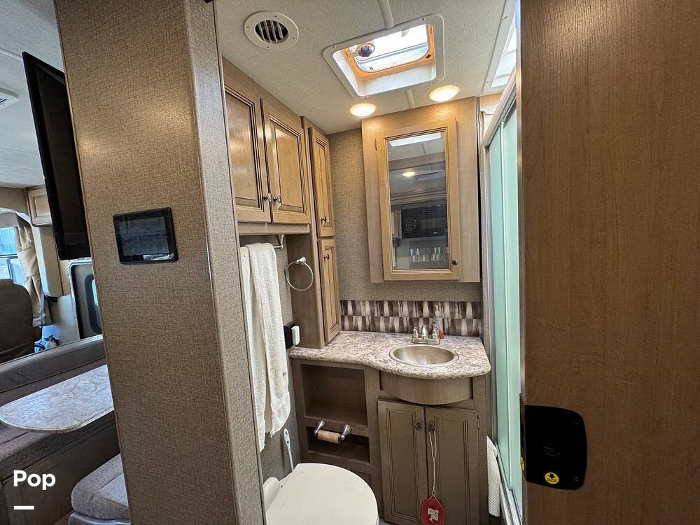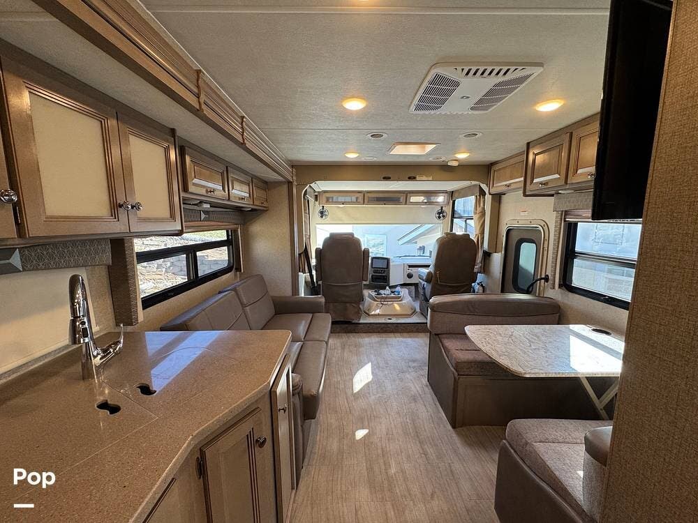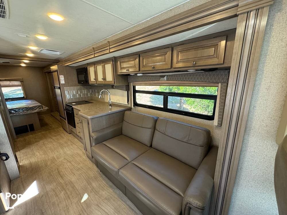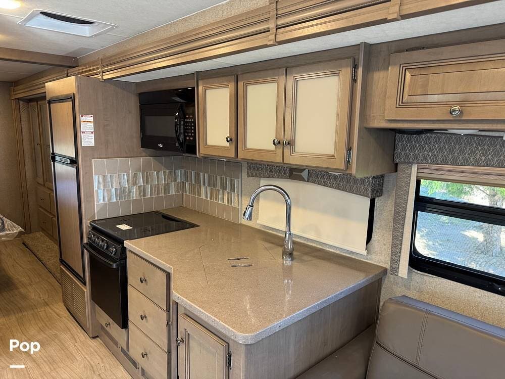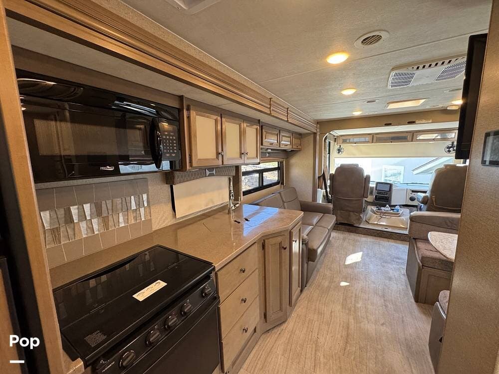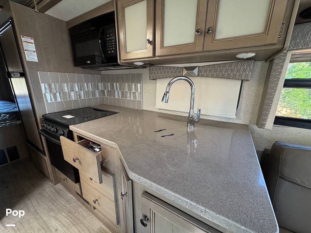 The kitchen is thoughtfully laid out with solid-surface countertops, ample cabinetry, a 3-burner cooktop with oven, microwave, refrigerator/freezer, and generous prep space--perfect for cooking on the road. The dinette converts into additional sleeping space, and the living area is designed for both relaxation and entertaining.
