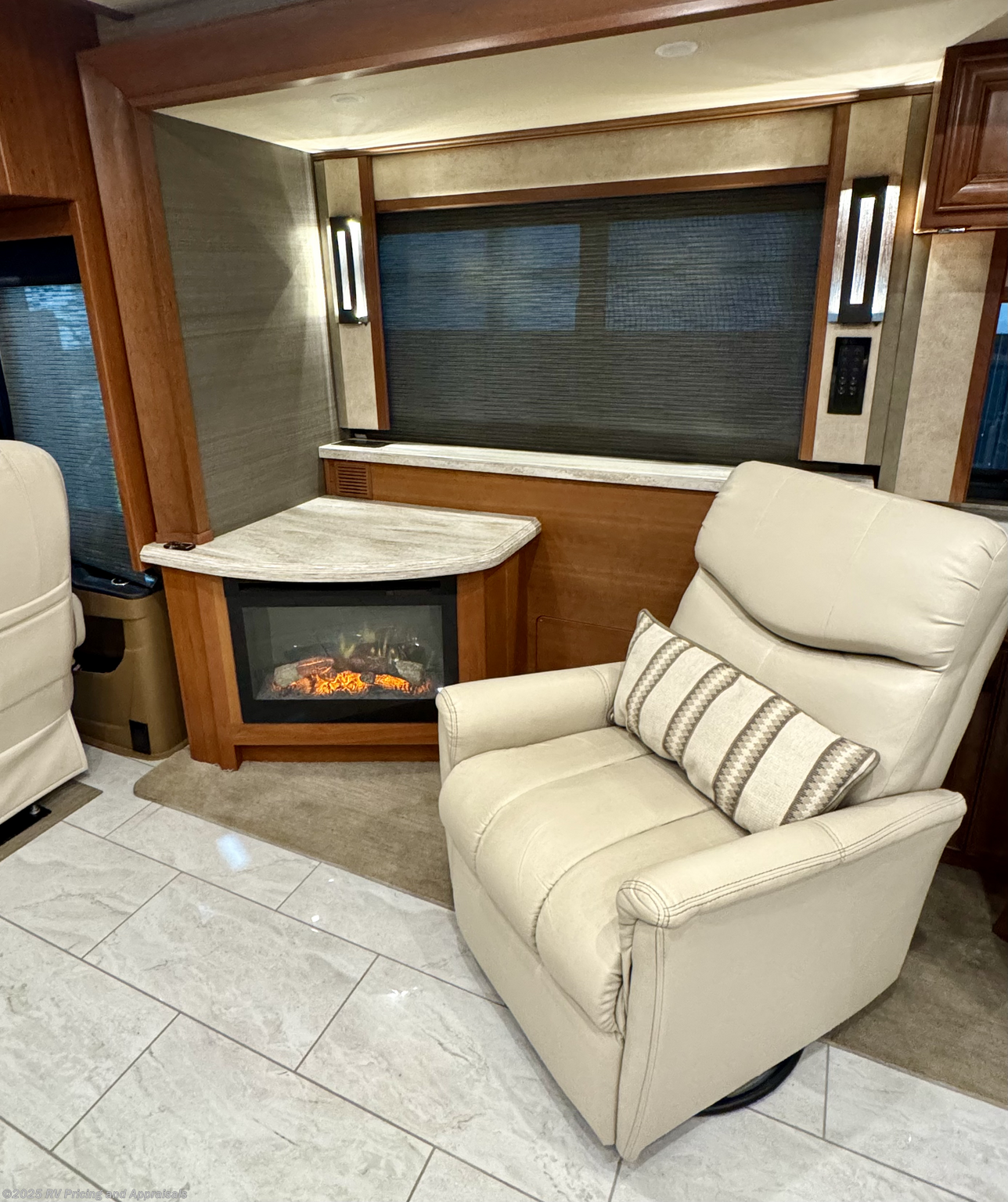 Enhancing your travel experience, the Allegro 40IP incorporates a plethora of optional upgrades for customized comfort and convenience. These include elegant White Mahogany Full Body Paint and a robust Powerglide Chassis with 450 HP. Inside, delight in the warmth of Glazed Cherry Wood Cabinets, contemporary Latte interior, and a state-of-the-art monitoring system. The living space is thoughtfully designed with an Ultraleather Air Coil Sofa Bed, and a relaxing Ultraleather recliner by a cozy fireplace with a TV on a lift.