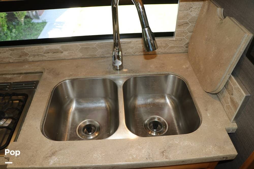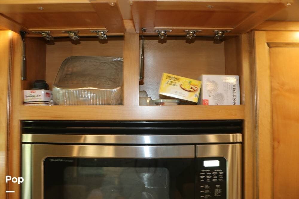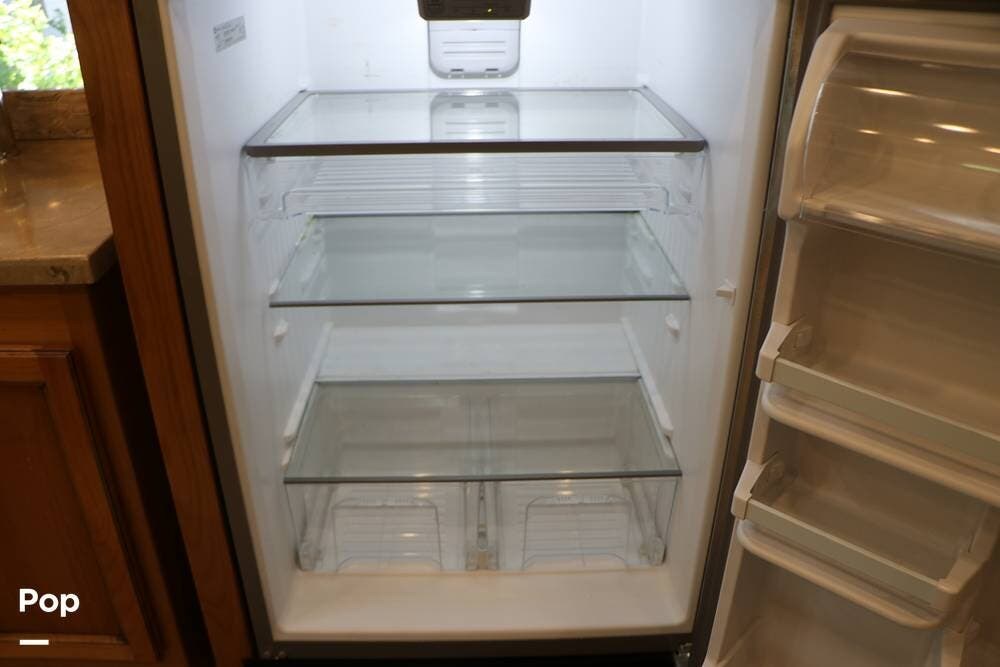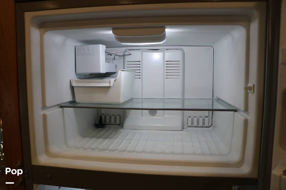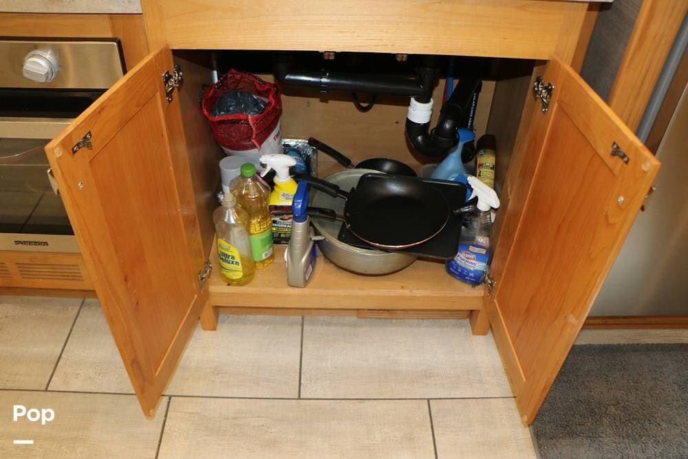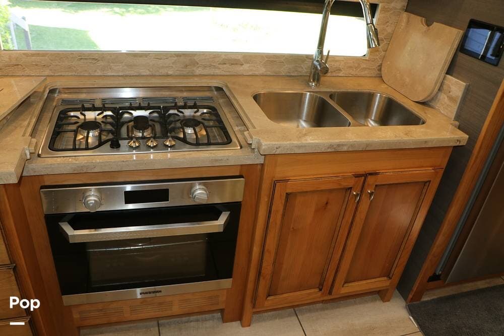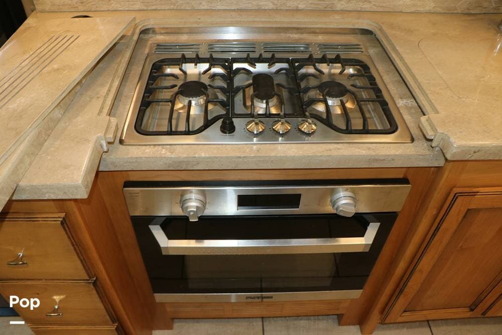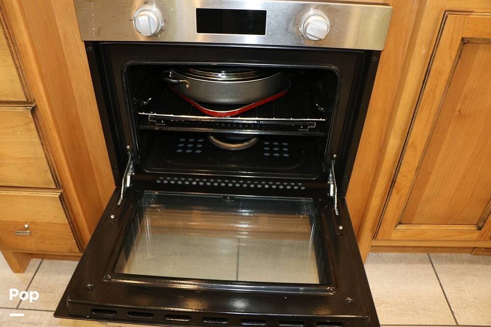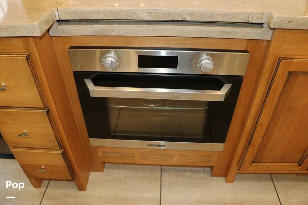 You'll notice the stainless steel appliances, including a residential-style Maytag refrigerator/freezer, Furrion gas cooktop, extra-large oven, Sharp microwave/convection oven combo, and large dual stainless steel sink with Corian covers.