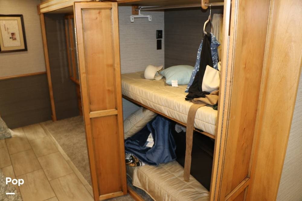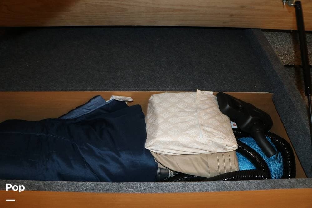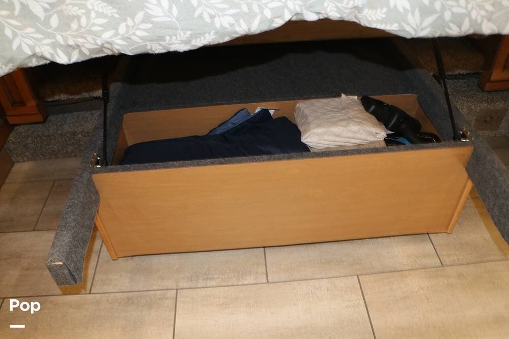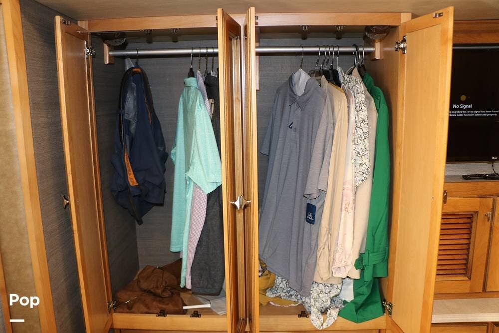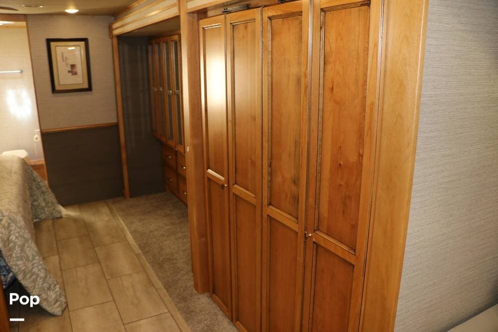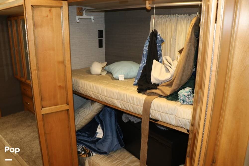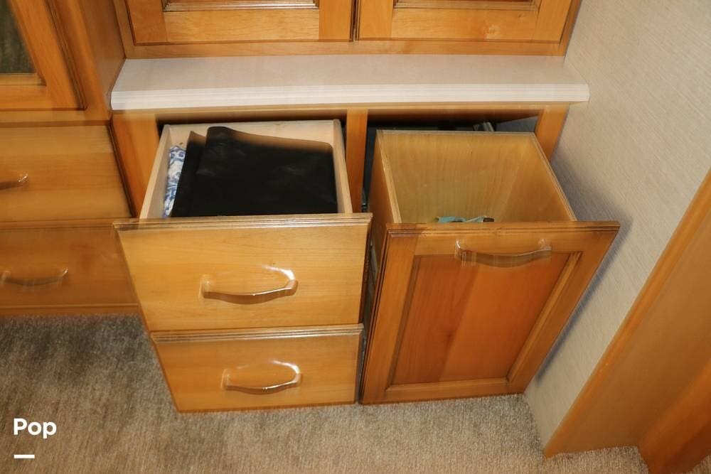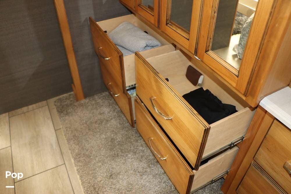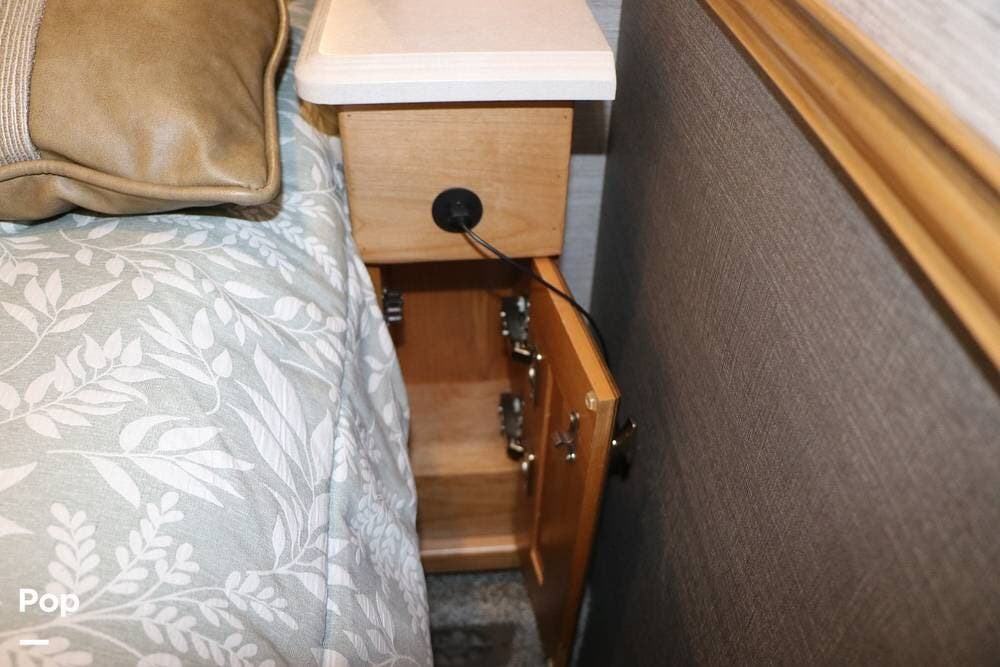 Enter the Master Suite to reveal a Memory Foam king-size bed. This room is massive due to dual opposing slides. The bedroom includes a built-in closet to hang clothes, a chest of drawers, and an integrated laundry bin.