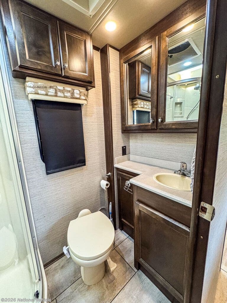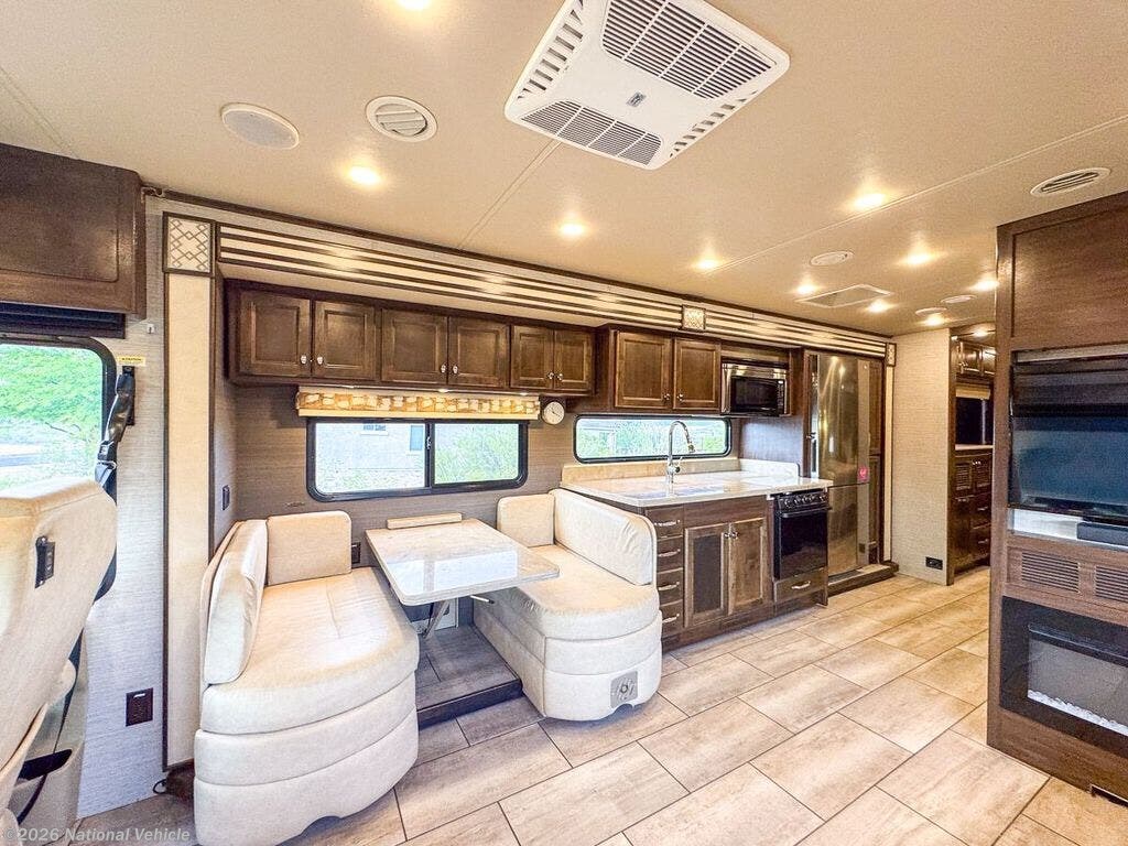 Inside, the 33AL floorplan opens up beautifully thanks to opposing slide-outs-fully serviced and upgraded with the Vroom slide system for added reliability and smooth operation. Mocha cabinetry, solid-surface countertops, and residential appliances give the interior a true residential feel. The living area features theater seating, a booth dinette, an overhead front bunk, and 2 TVs, offering flexible space for relaxing or entertaining guests.
