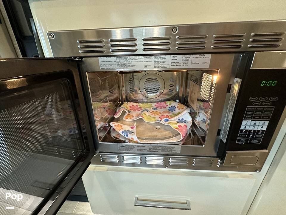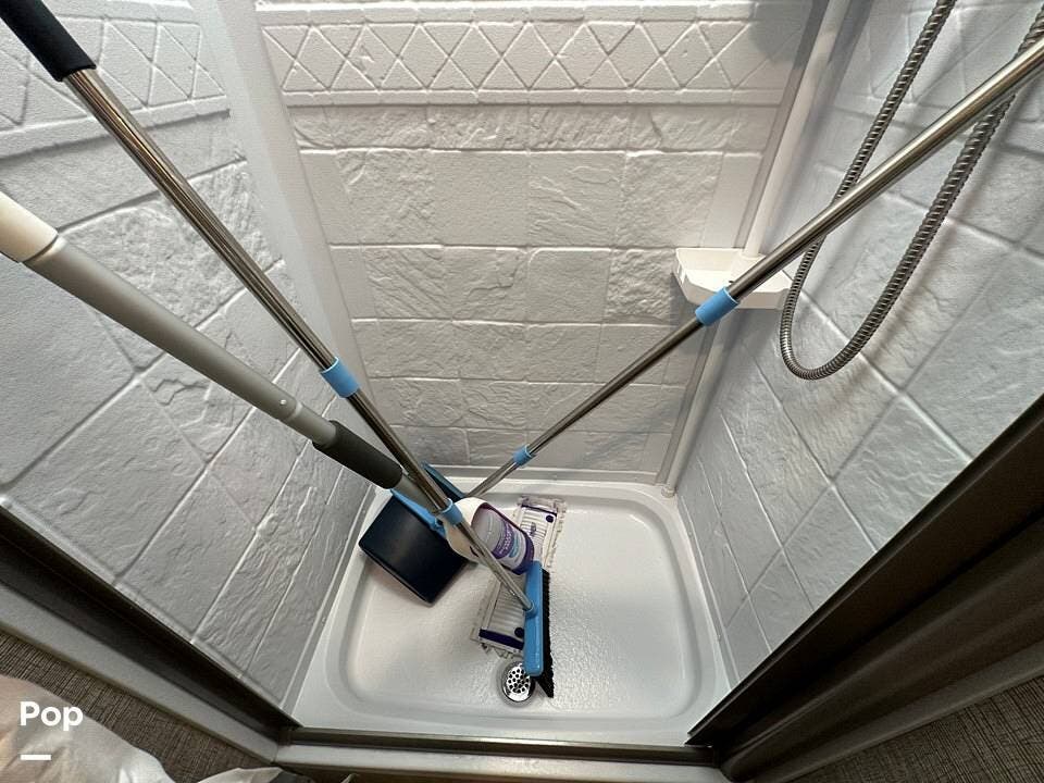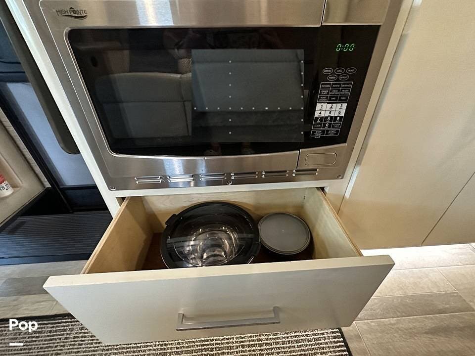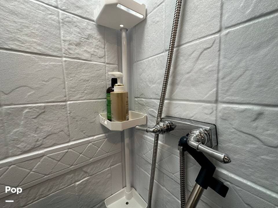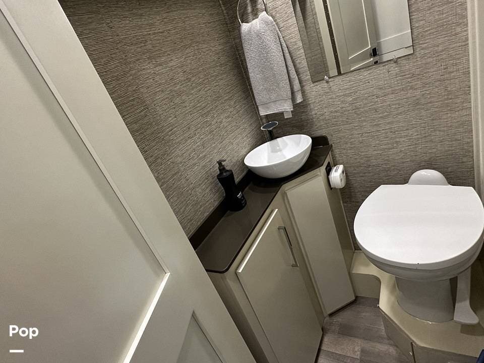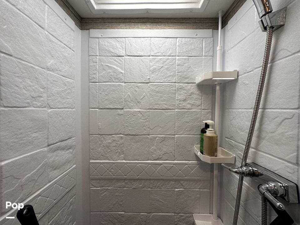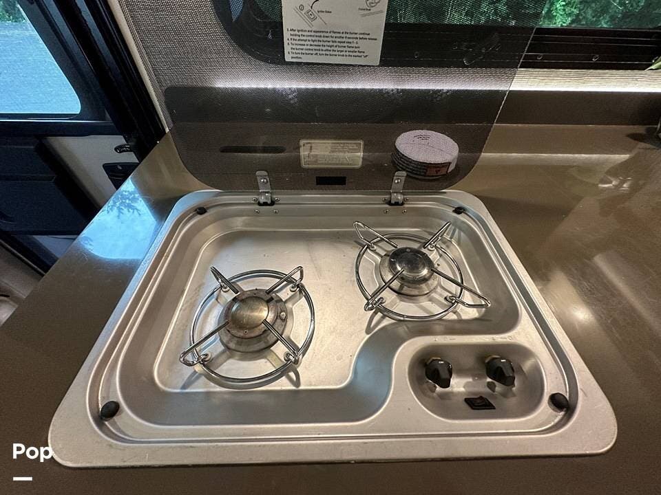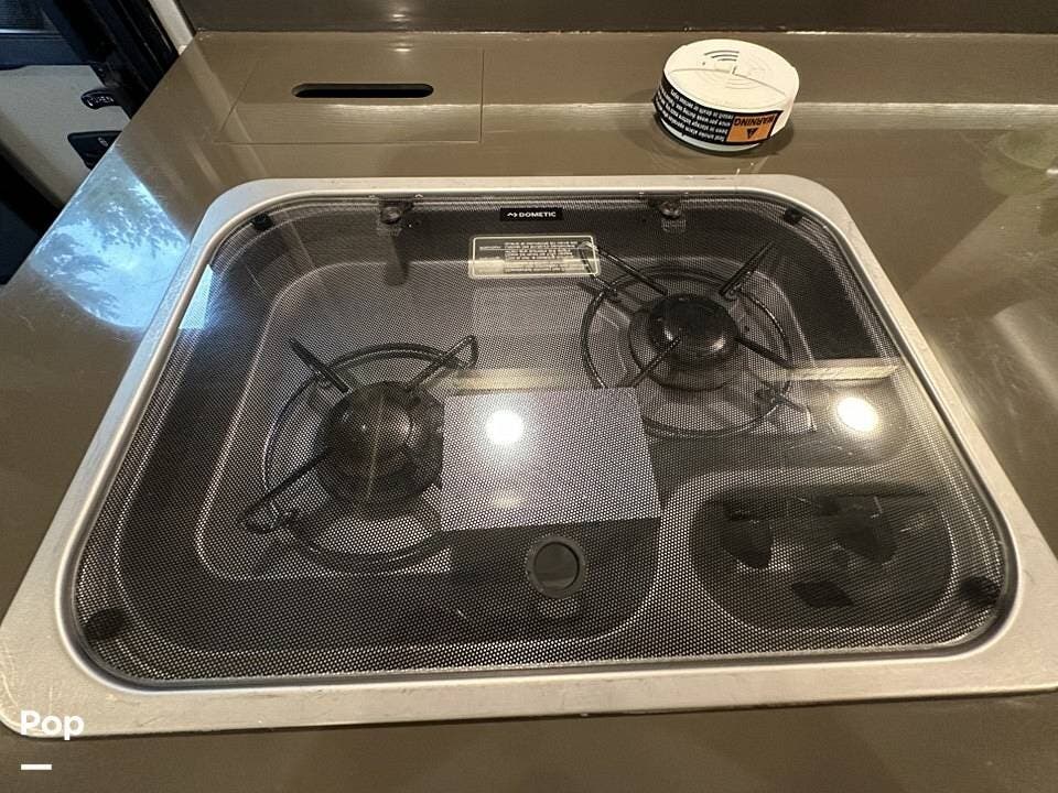 The well-equipped galley kitchen boasts a two-burner gas stove, convection microwave, refrigerator, and solid surface countertops. The bathroom, located mid-coach, features a separate shower, a water closet with a porcelain toilet, and a sink, ensuring comfort and convenience on the road.