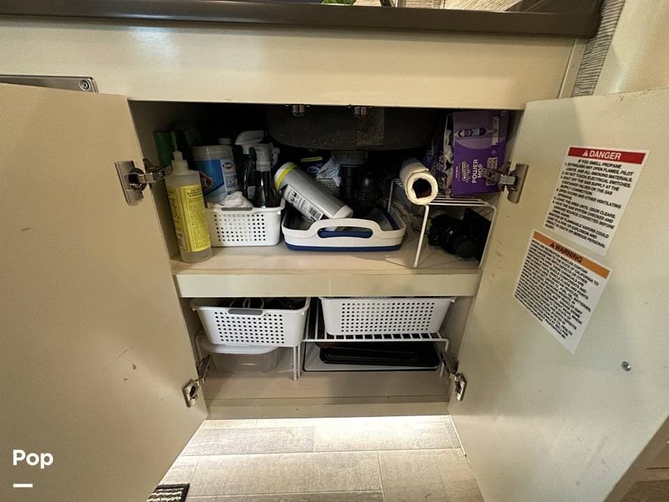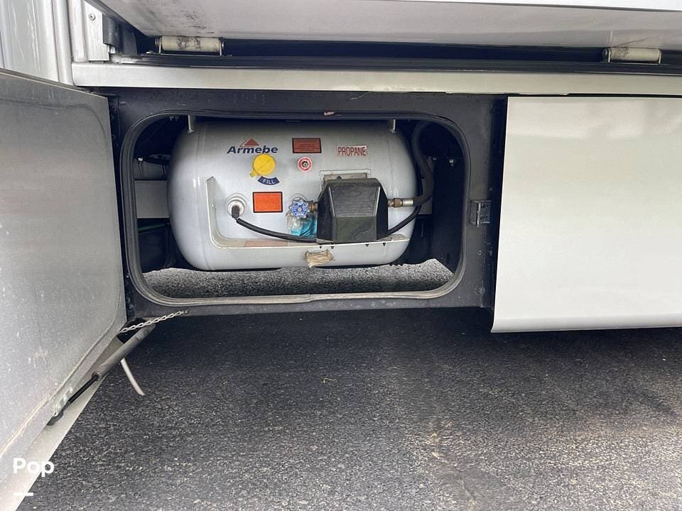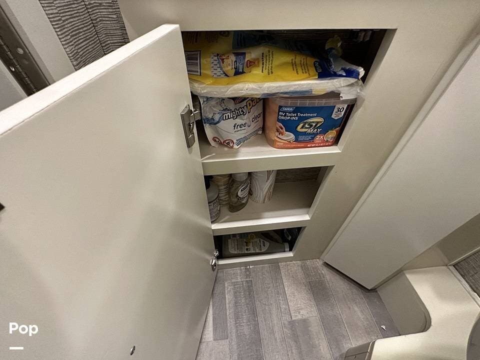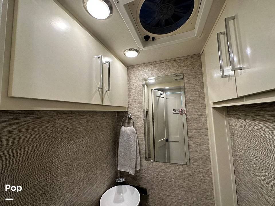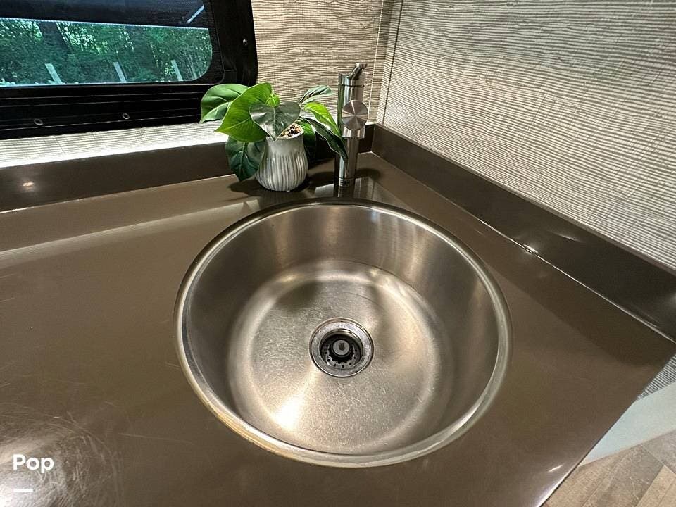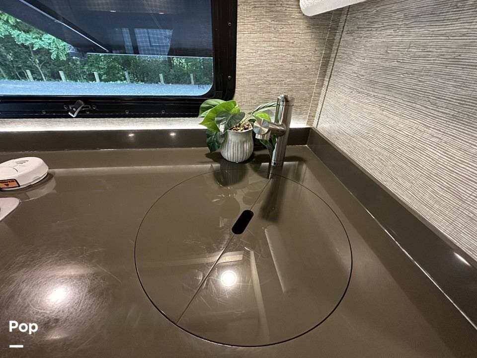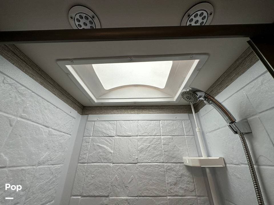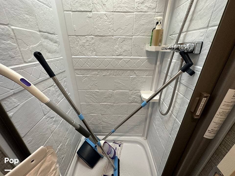 The well-equipped galley kitchen boasts a two-burner gas stove, convection microwave, refrigerator, and solid surface countertops. The bathroom, located mid-coach, features a separate shower, a water closet with a porcelain toilet, and a sink, ensuring comfort and convenience on the road.