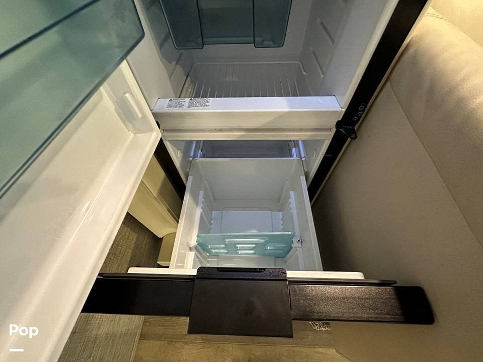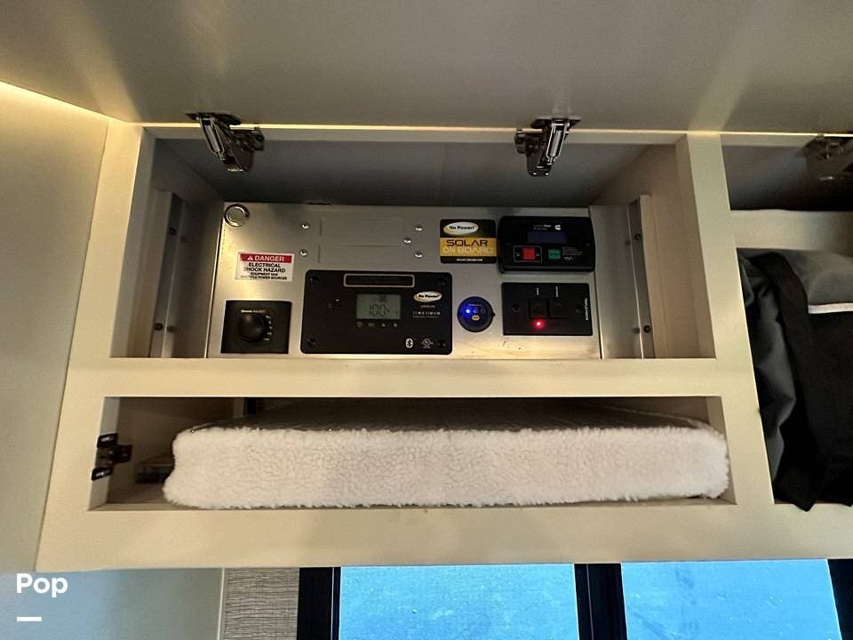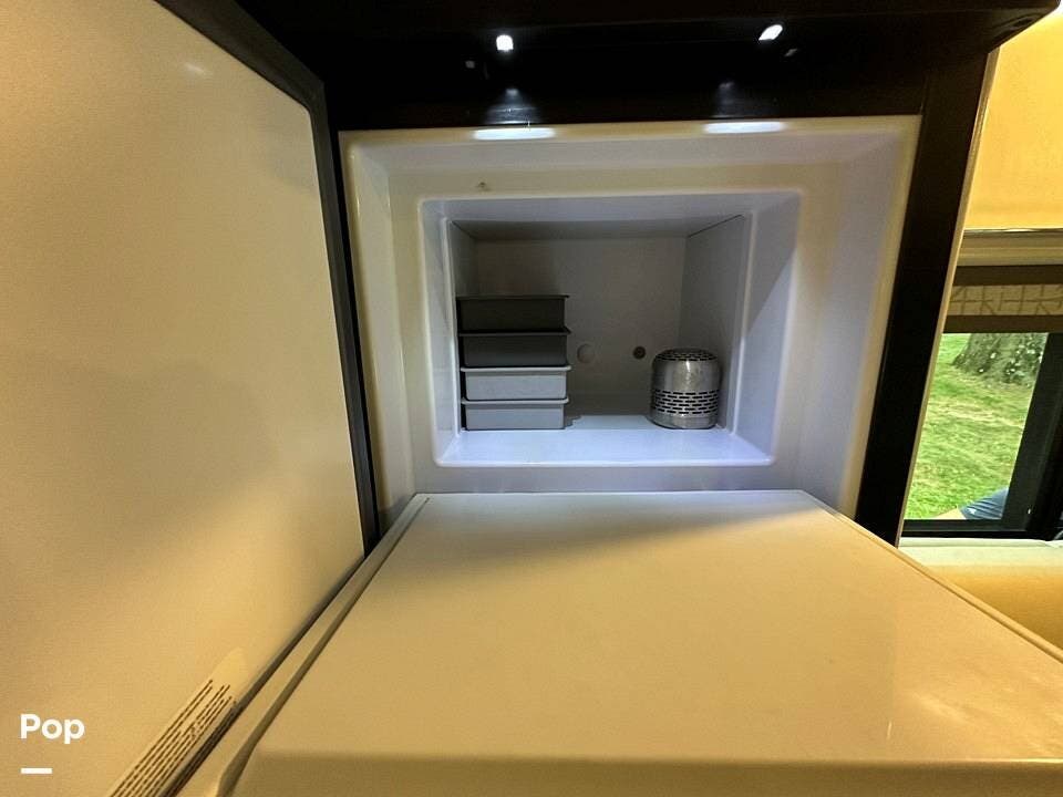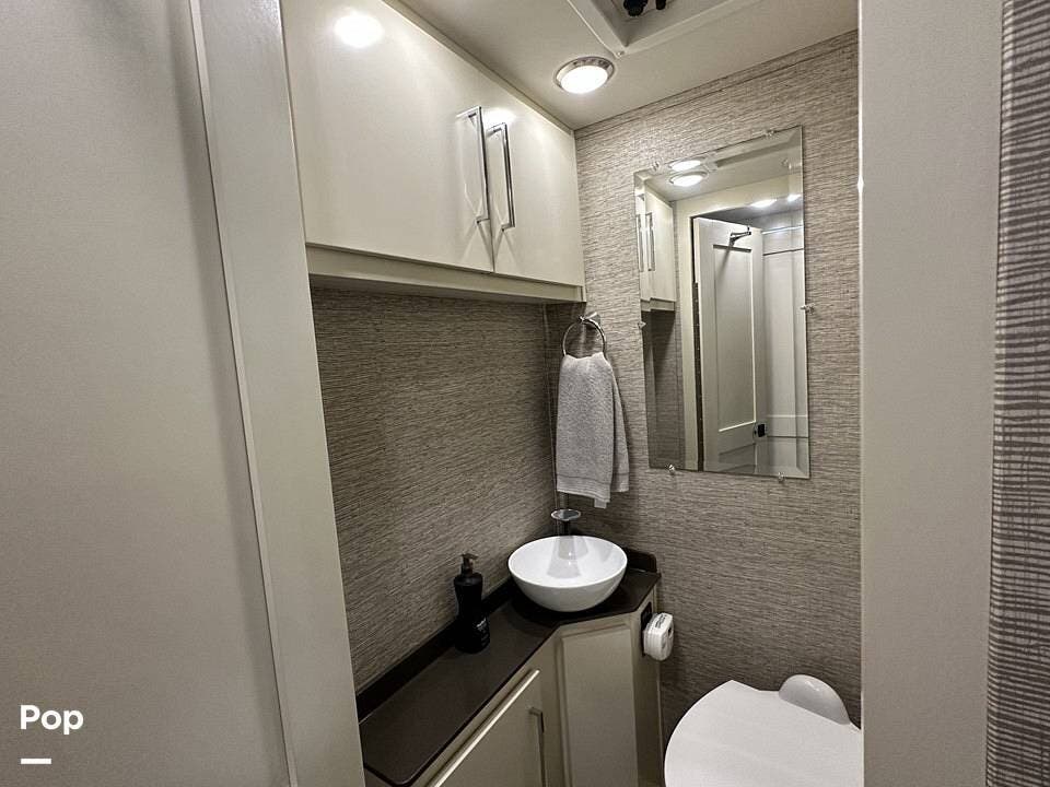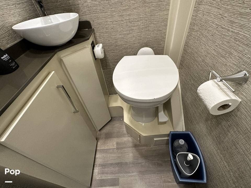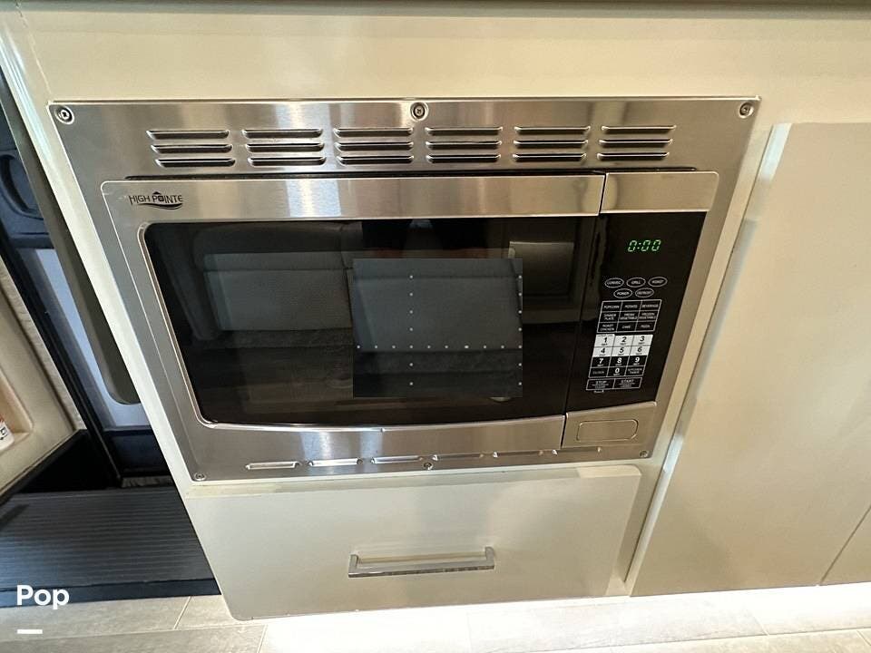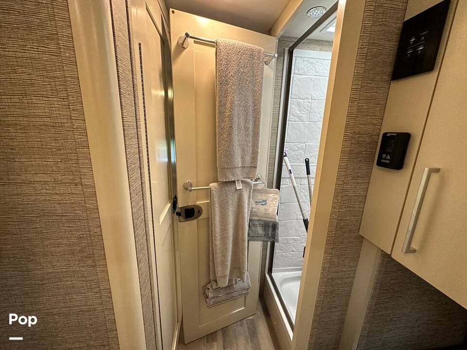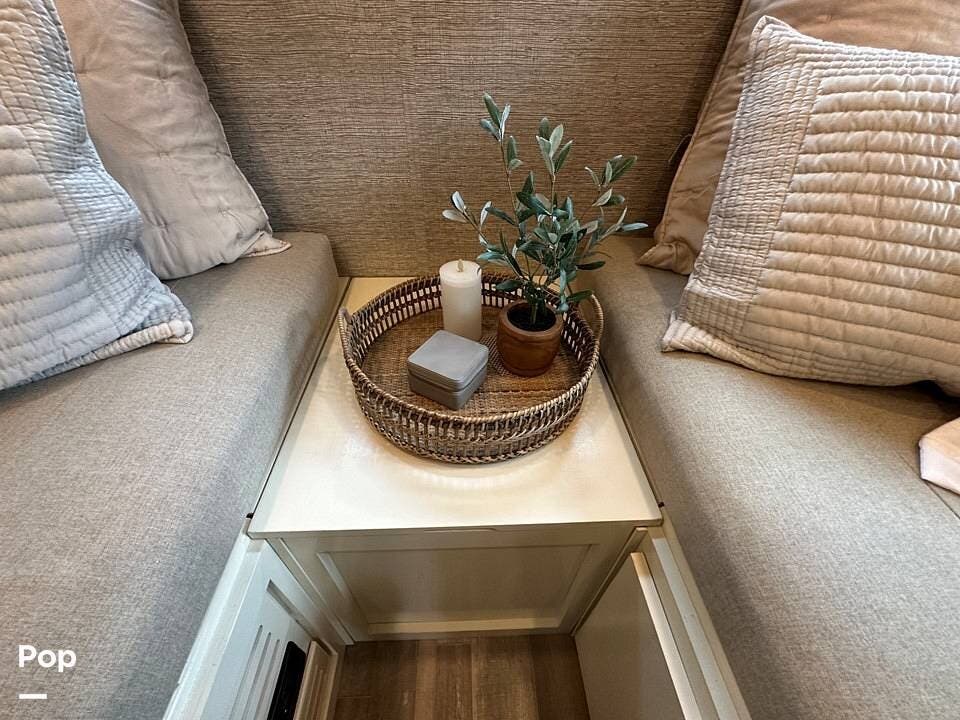 The well-equipped galley kitchen boasts a two-burner gas stove, convection microwave, refrigerator, and solid surface countertops. The bathroom, located mid-coach, features a separate shower, a water closet with a porcelain toilet, and a sink, ensuring comfort and convenience on the road.