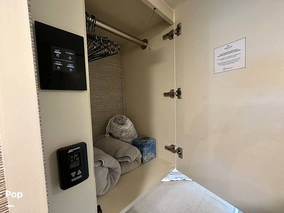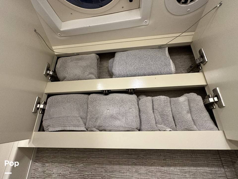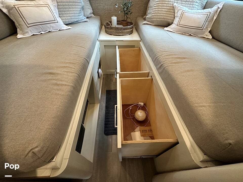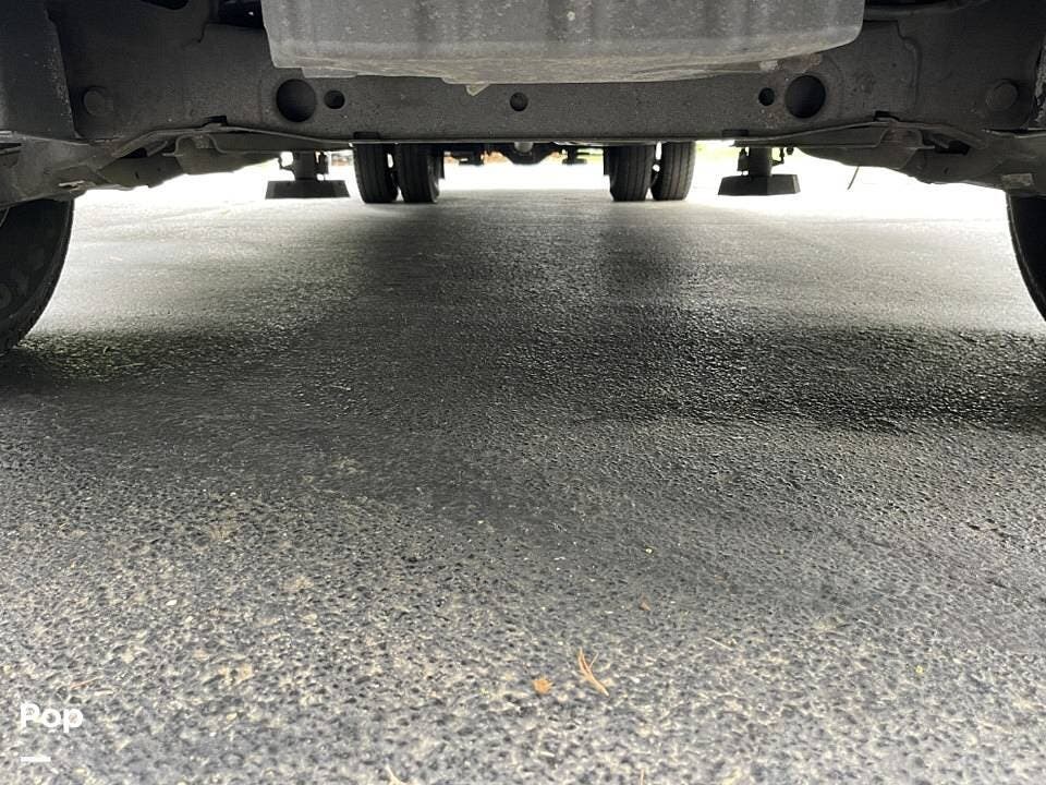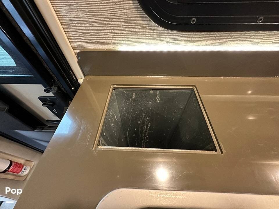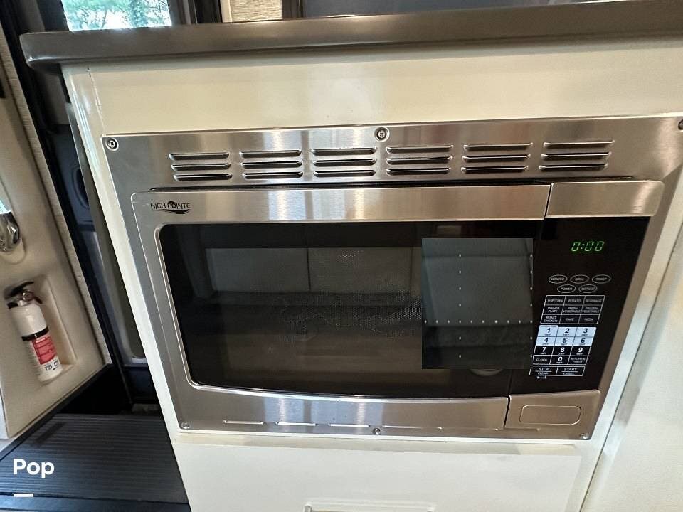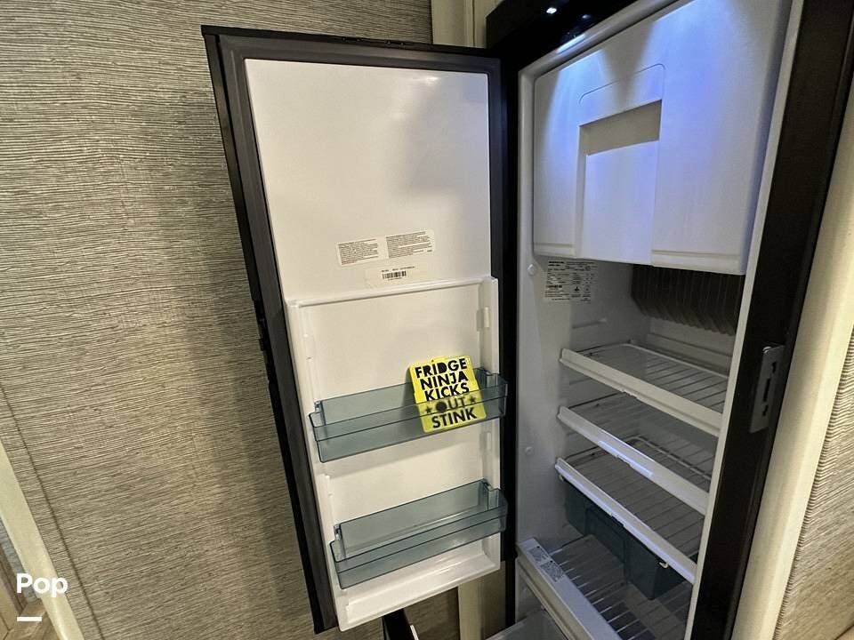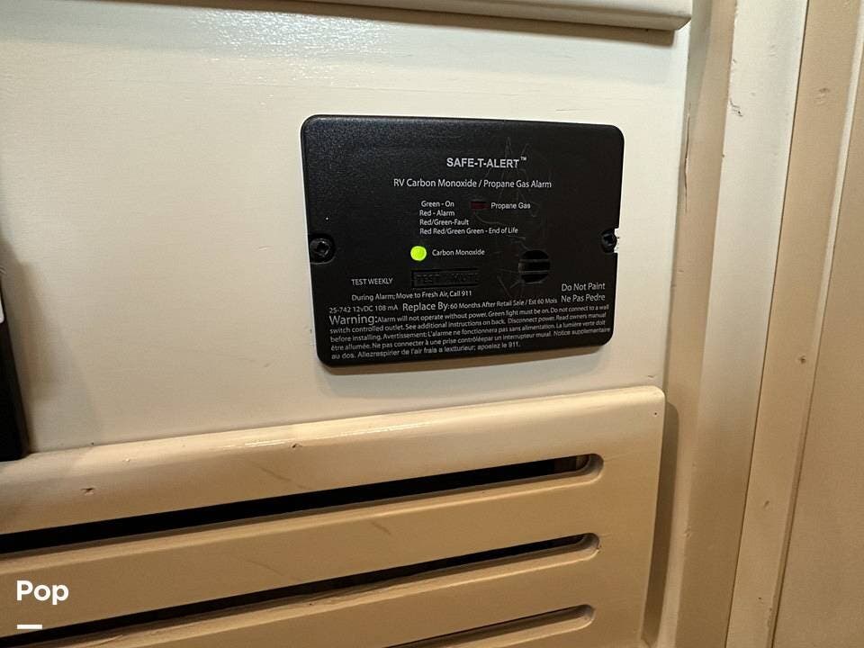 The well-equipped galley kitchen boasts a two-burner gas stove, convection microwave, refrigerator, and solid surface countertops. The bathroom, located mid-coach, features a separate shower, a water closet with a porcelain toilet, and a sink, ensuring comfort and convenience on the road.