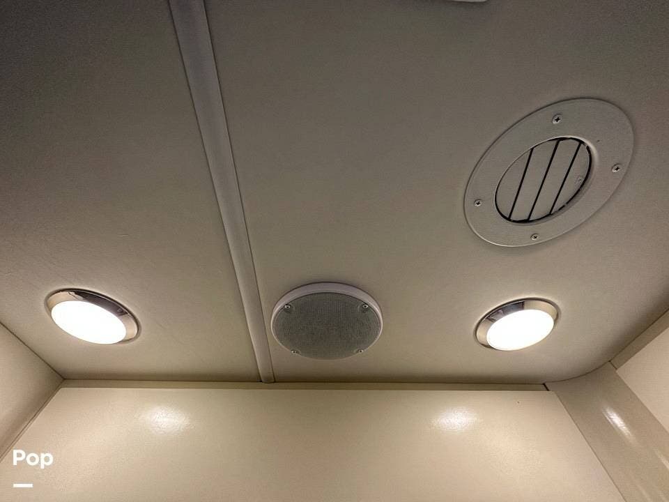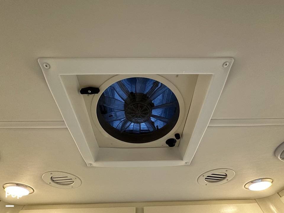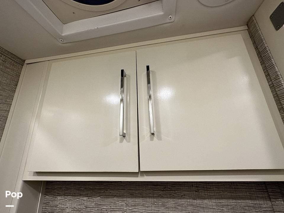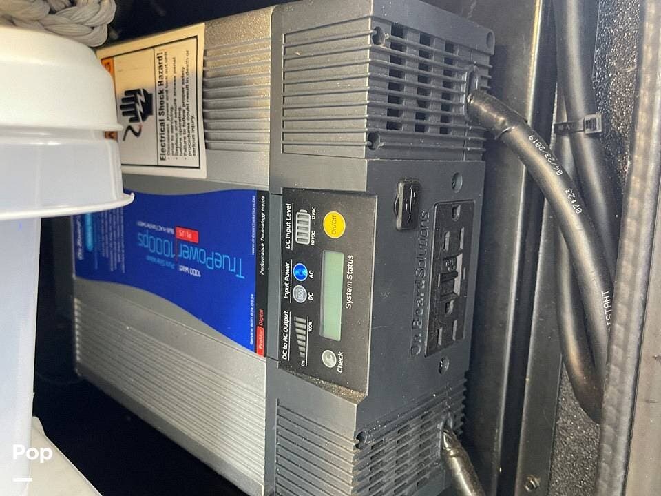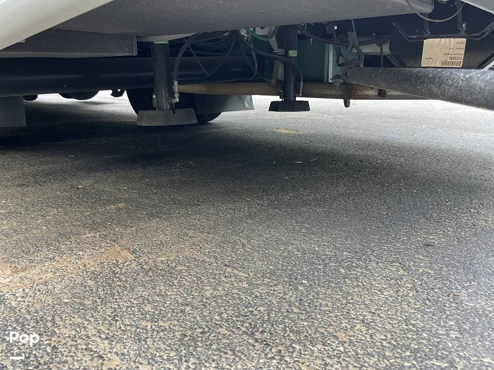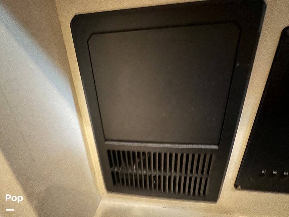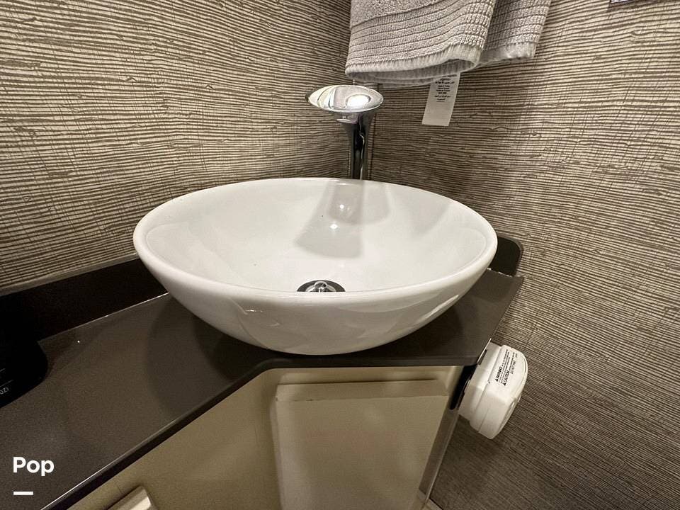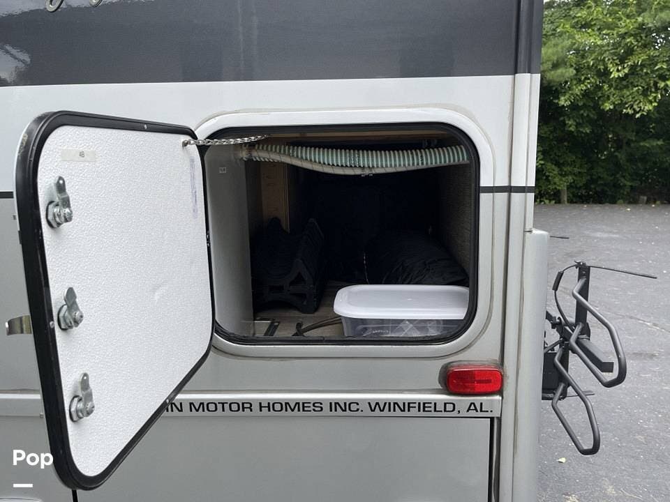 The well-equipped galley kitchen boasts a two-burner gas stove, convection microwave, refrigerator, and solid surface countertops. The bathroom, located mid-coach, features a separate shower, a water closet with a porcelain toilet, and a sink, ensuring comfort and convenience on the road.