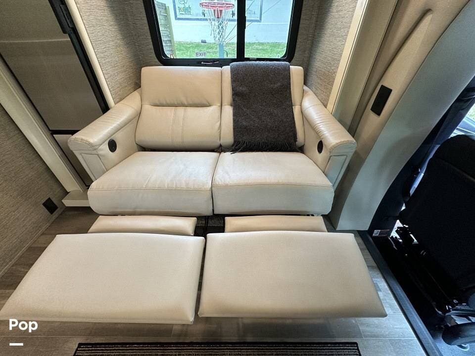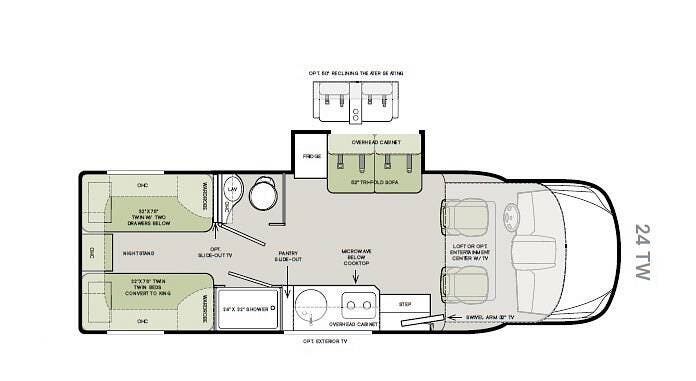 The master suite features a queen-sized (convertible to twins) bed with a memory foam mattress, ample storage, and a privacy door. The living area includes a convertible dinette, ultra-leather theater recliners with heat and message, and a flat-screen TV with an integrated sound system for your entertainment. It also includes a cab over bunk sleeping area.