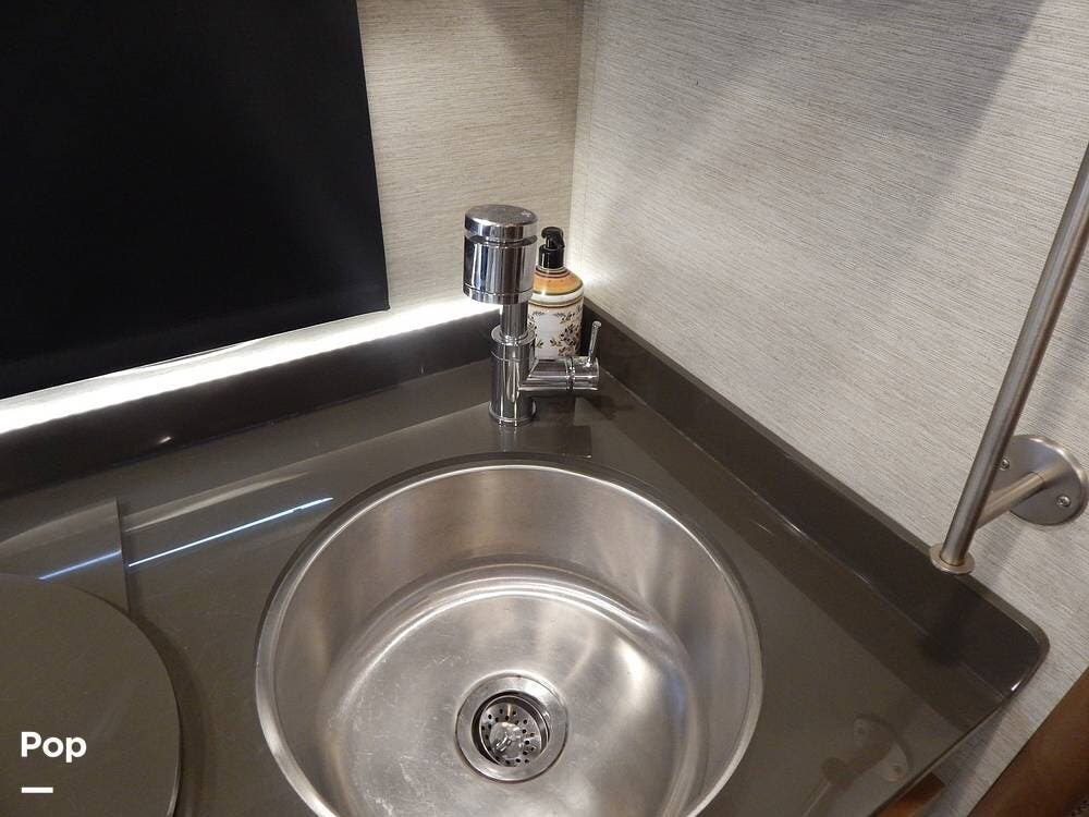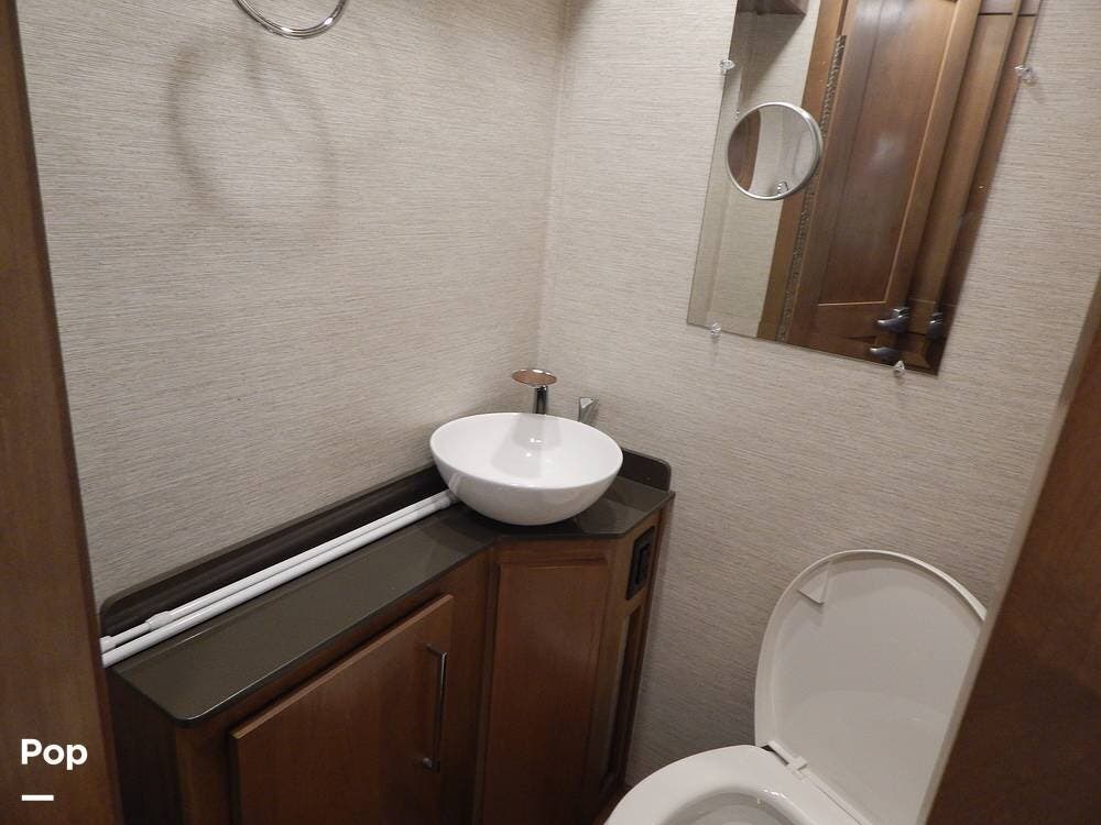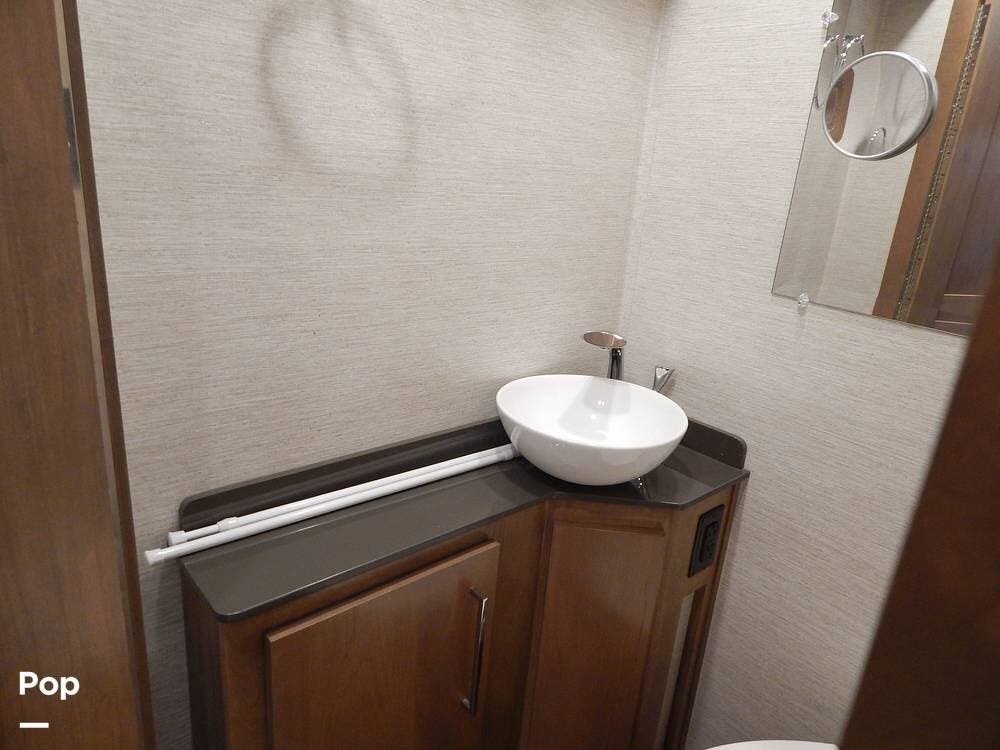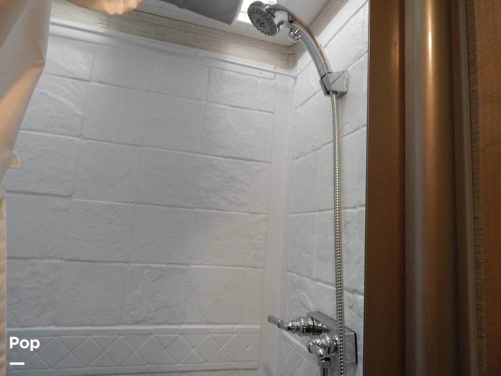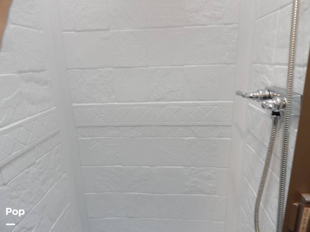 The kitchen is located along the patio wall, with cabinetry above. The bathroom to the rear features a private toilet and sink on one side of the far wall, as well as a private shower. The doors of the shower can be positioned to create a larger bathroom area spanning the RV's width.