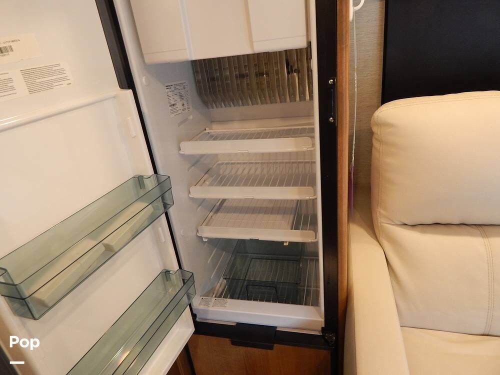 The patio-side entry door leads into the living area, located behind the swivel driving chairs and the cab-over bed above. The far wall features a slide-out reclining theater seating area, accompanied by a refrigerator situated to the rear.