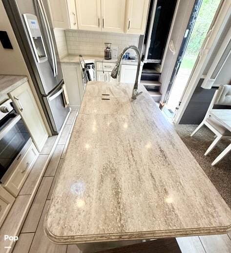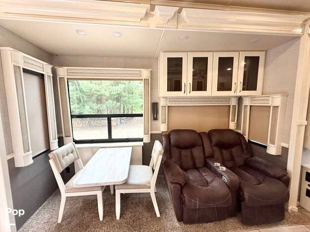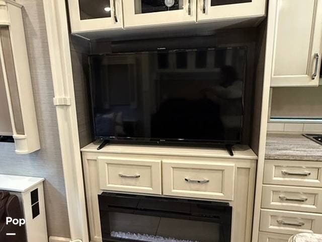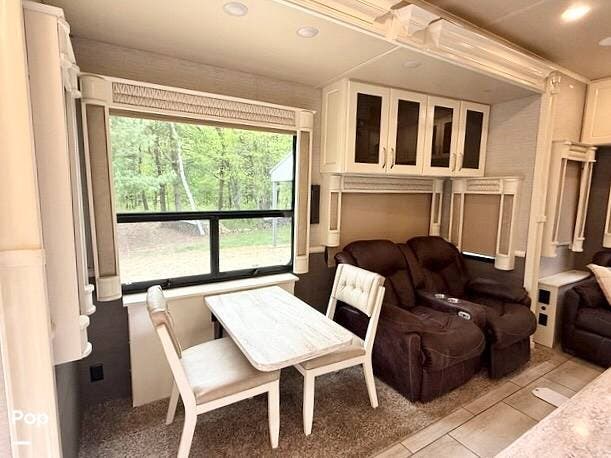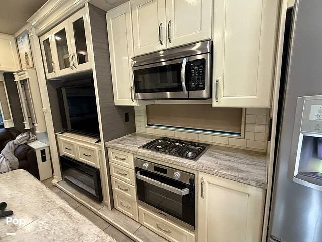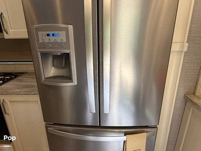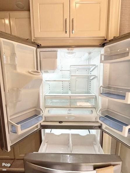 Family and guests will love the luxury features of this coach, including the residential-sized refrigerator, stainless steel appliances, entertainment center with fireplace, and lots of seating in the great room. The living space is designed in popular white, tan, and light wood stain colors.