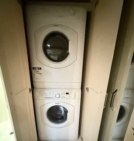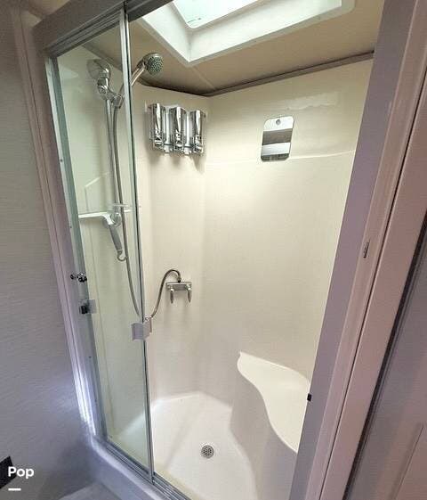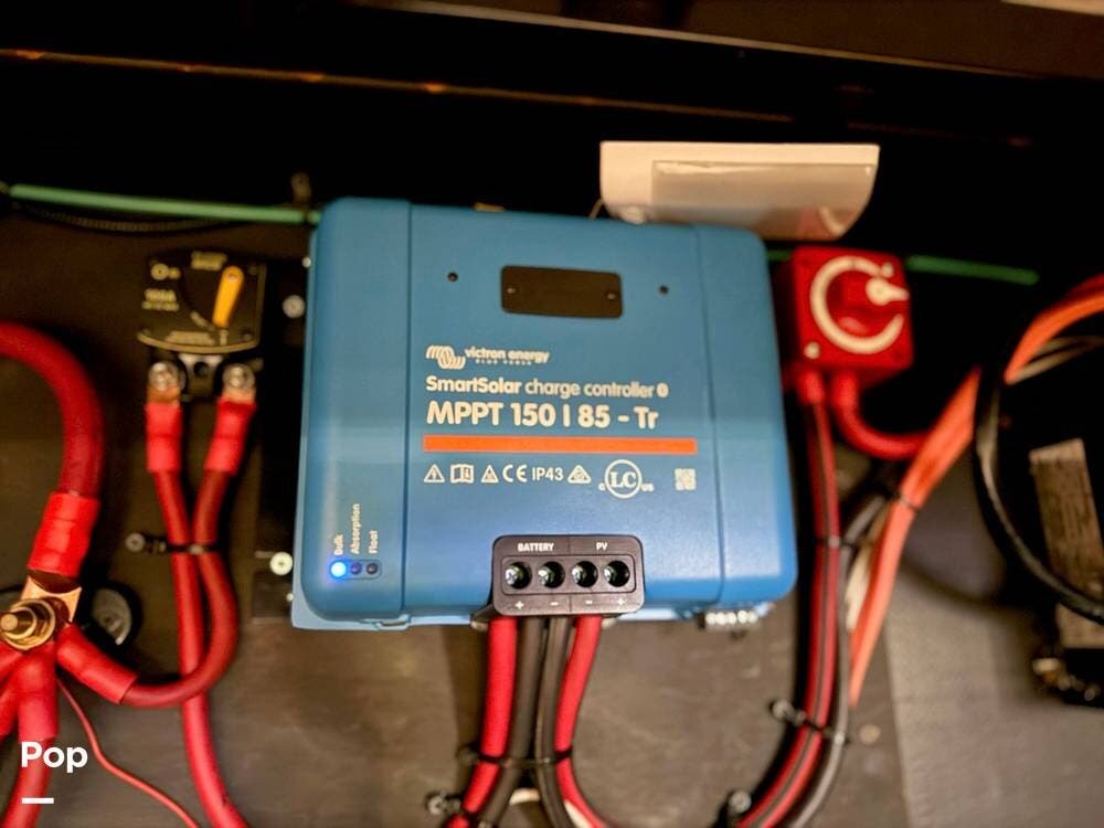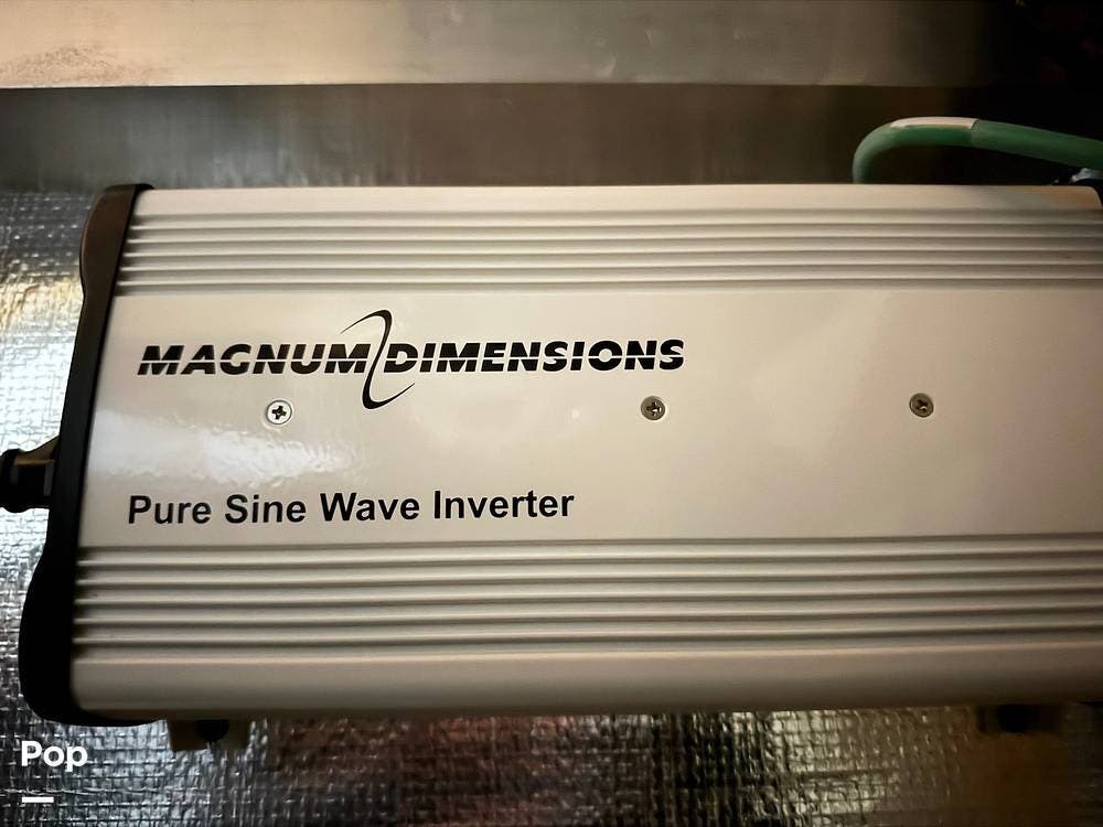 This model received upgrades, including the third air conditioning unit, slide-out awnings, dishwasher, washer, dryer, induction stove, and solar system.