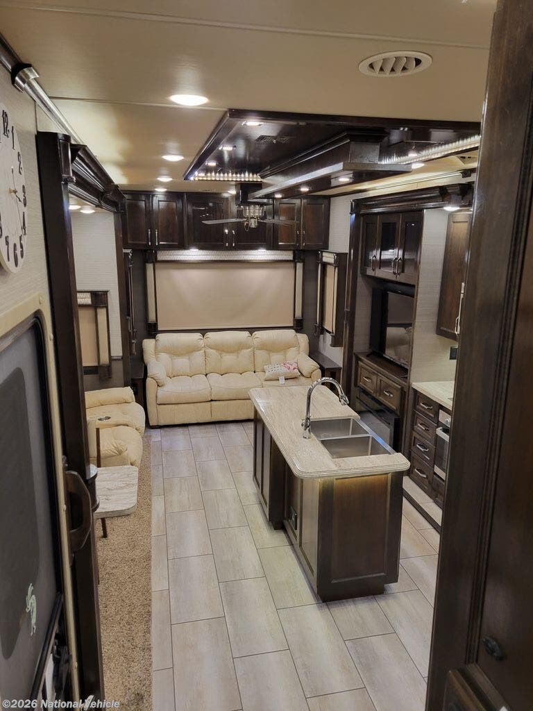 Step inside to an expansive four-slide layout that blends open-concept comfort with refined finishes. The rear living area features power theater seating, a sofa sleeper, electric fireplace, and large HDTV, creating a cozy retreat for relaxation or entertaining. The gourmet kitchen showcases solid-surface countertops, a residential stainless-steel refrigerator, induction cooktop, convection microwave, dishwasher, and a spacious kitchen island with deep storage and a farmhouse sink?making every meal a joy to prepare.