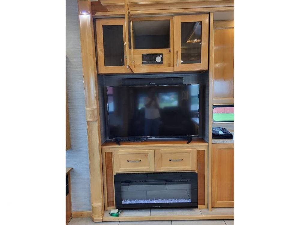 The living area has a theater sofa, a large electric fireplace (″50″ LED TV), a central vacuum, ceiling fans, decorative wood finishes, and two awnings.