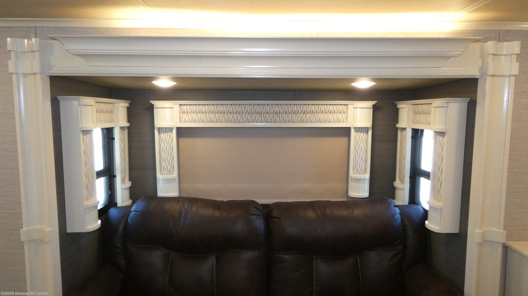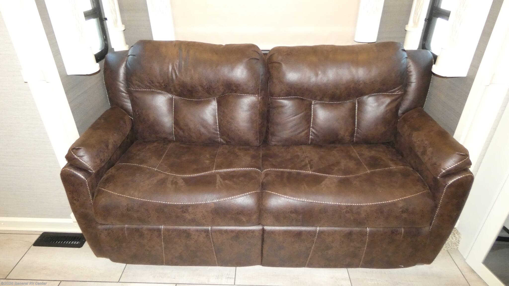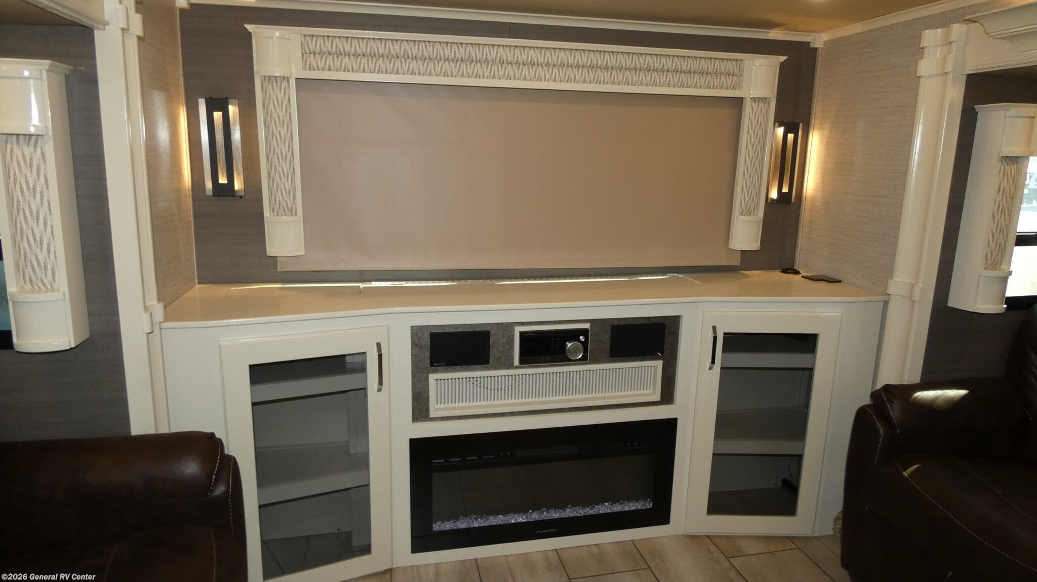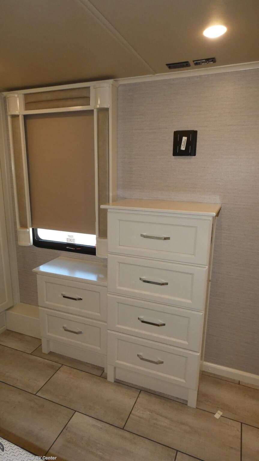 VanLeigh Beacon fifth wheel 42RDB highlights: Kitchen Island Separate Living Room Hutch 48" x 30" Shower 55" LED TV It won't matter where you choose to camp out because anywhere you go with this Beacon fifth wheel will feel like home! The full-size wardrobe in the front bedroom will give you plenty of storage space for your garments, and the rear living room will be just the spot that your family gravitates to when they want to relax. Spending time in the kitchen will be fun for everyone because a set of opposing slides opens up the space so that you have room to work around the kitchen island. Whether you are simply heading out for the weekend or you call the road your home, the Beacon fifth wheel from VanLeigh RV has everything you could possibly want or need! You may find yourself staying inside all weekend long because of the fabulous interior amenities, like a theater sofa and master bedroom. A Spyder Controls multiplex system with a 7" color touchscreen allows you to take charge of various functioning equipment like tank levels, temperatures, and lighting. You will also find that the 40" fireplace delivers a home-like feel to the living area, and the king cool-gel memory-foam mattress is so relaxing and rejuvenating after a long day of excursions and expeditions.