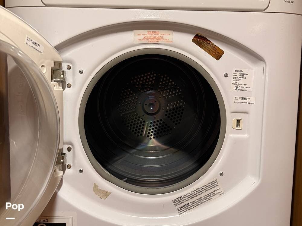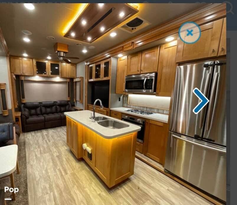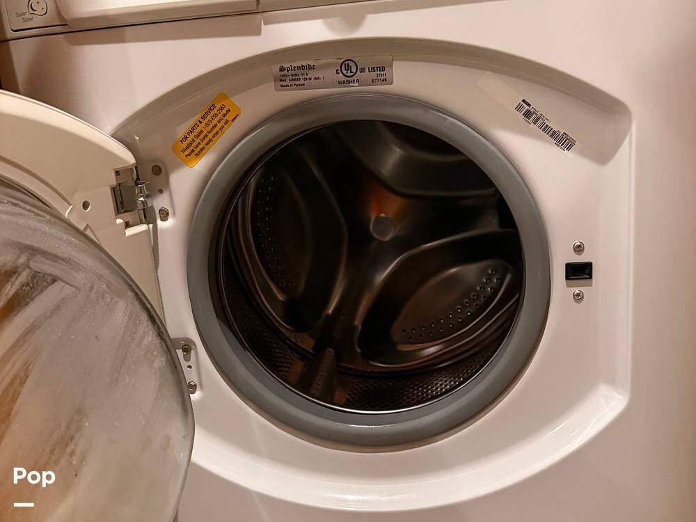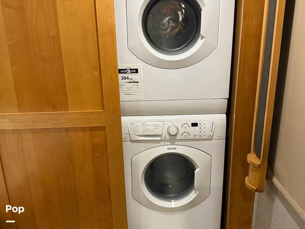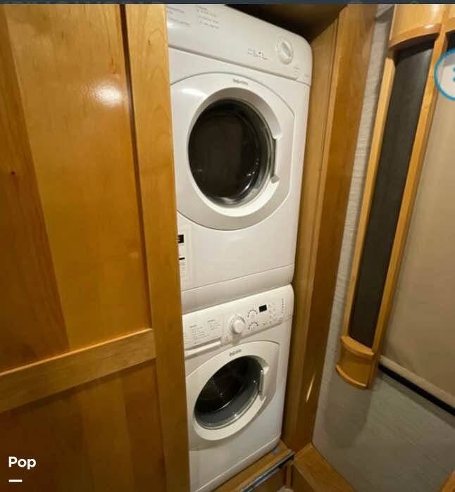 This unit offers three air conditioners and two heat pumps, making it a perfect choice for year-round living for those who need that option. This RV has stackable washer and dryer units, a full-size LG fridge, a king-size bed, and a central vac.