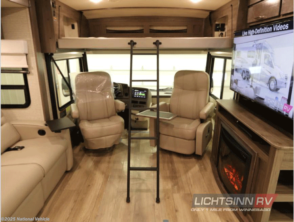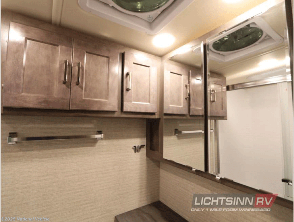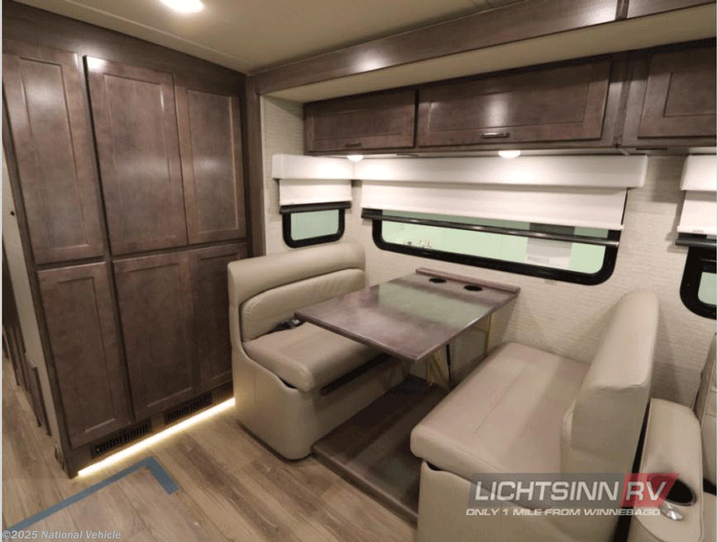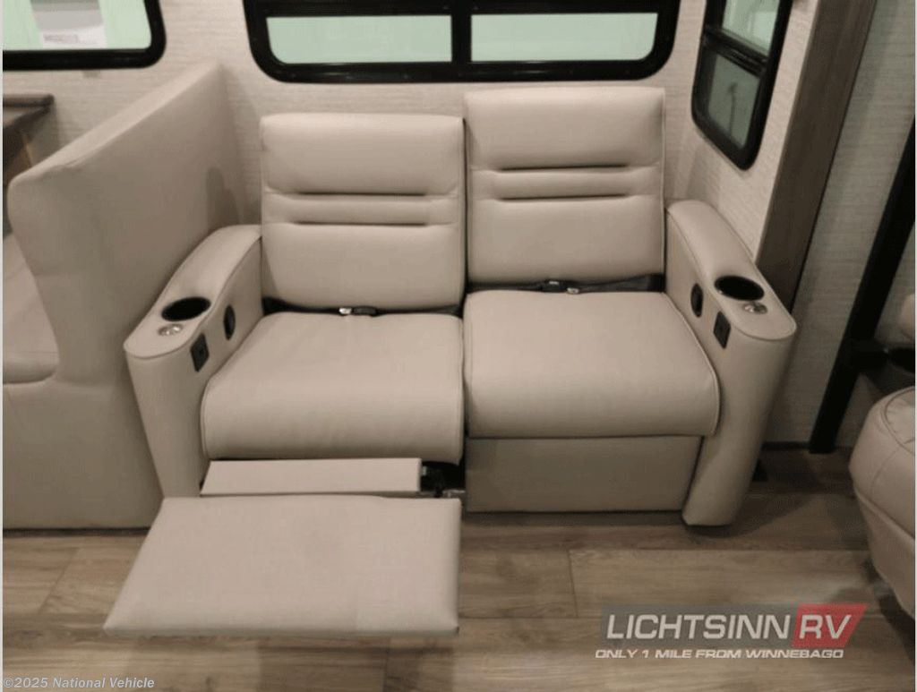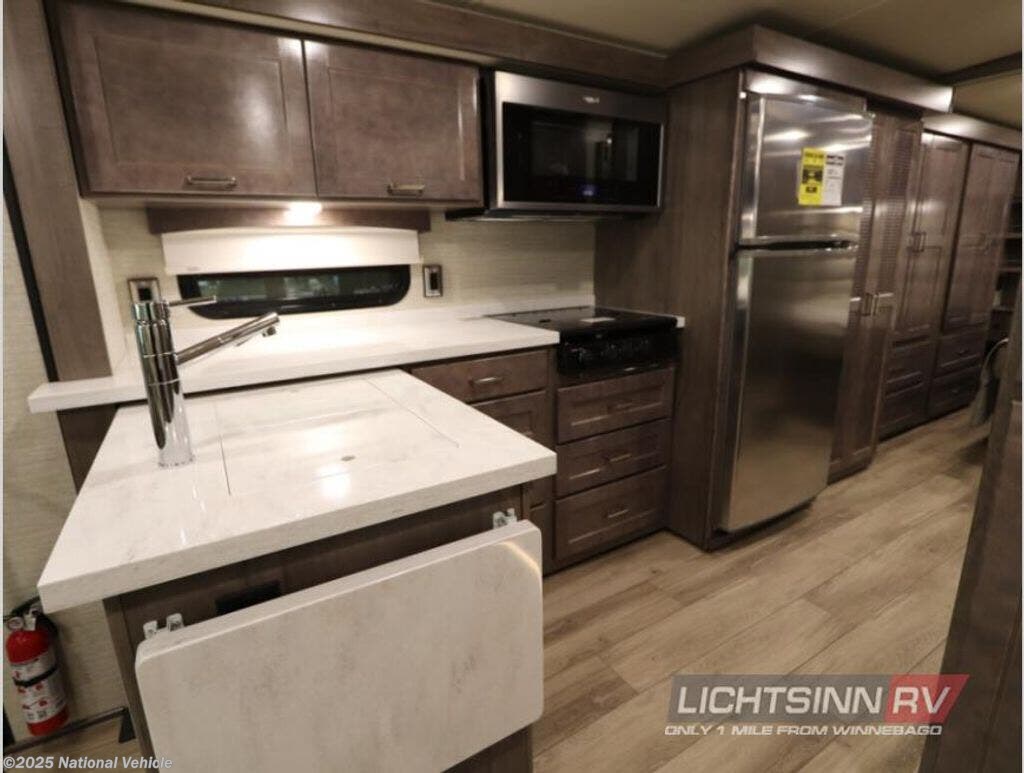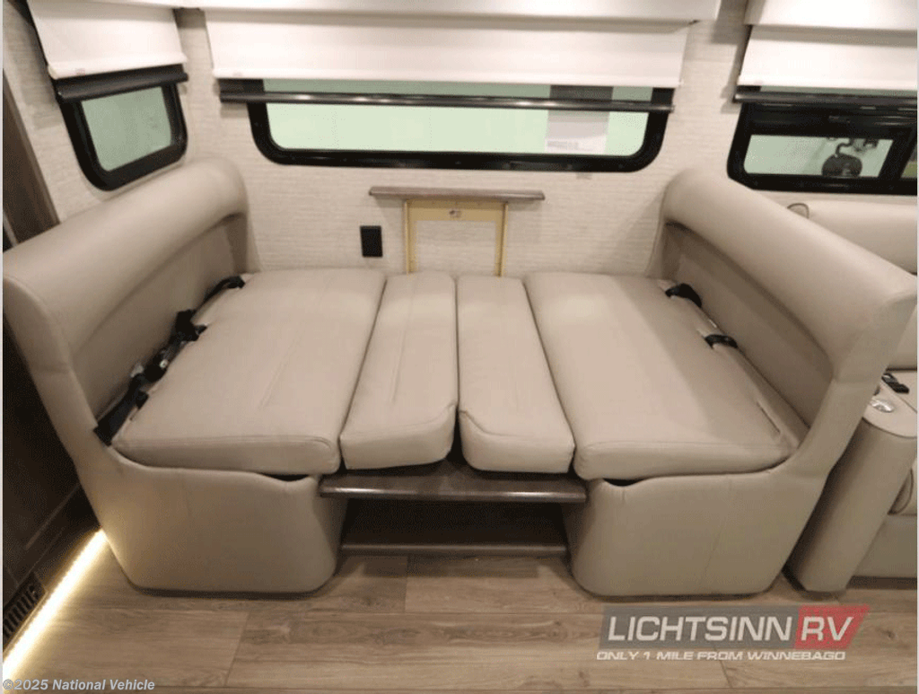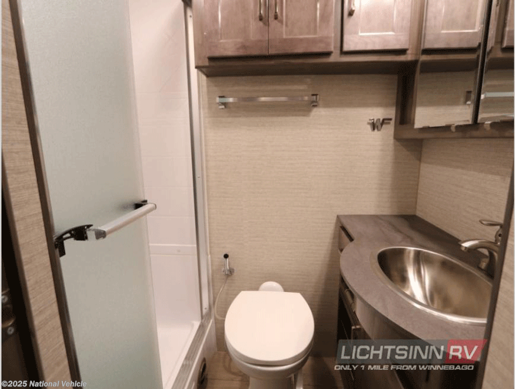 The rear master suite offers a walkaround queen bed, ample wardrobe space, and direct access to the dual-entry bath, complete with a large shower, vanity, and porcelain toilet. Throughout the coach, Winnebago?s signature design ensures maximum functionality and refined comfort.