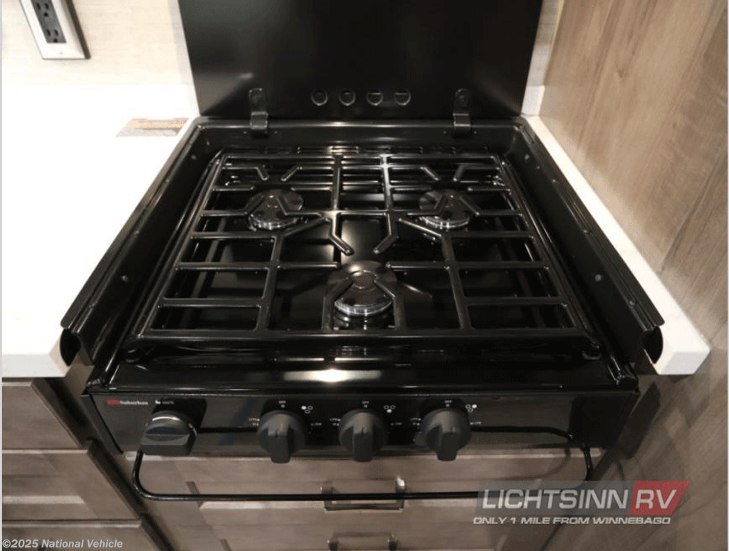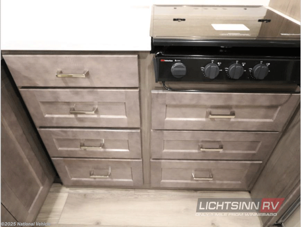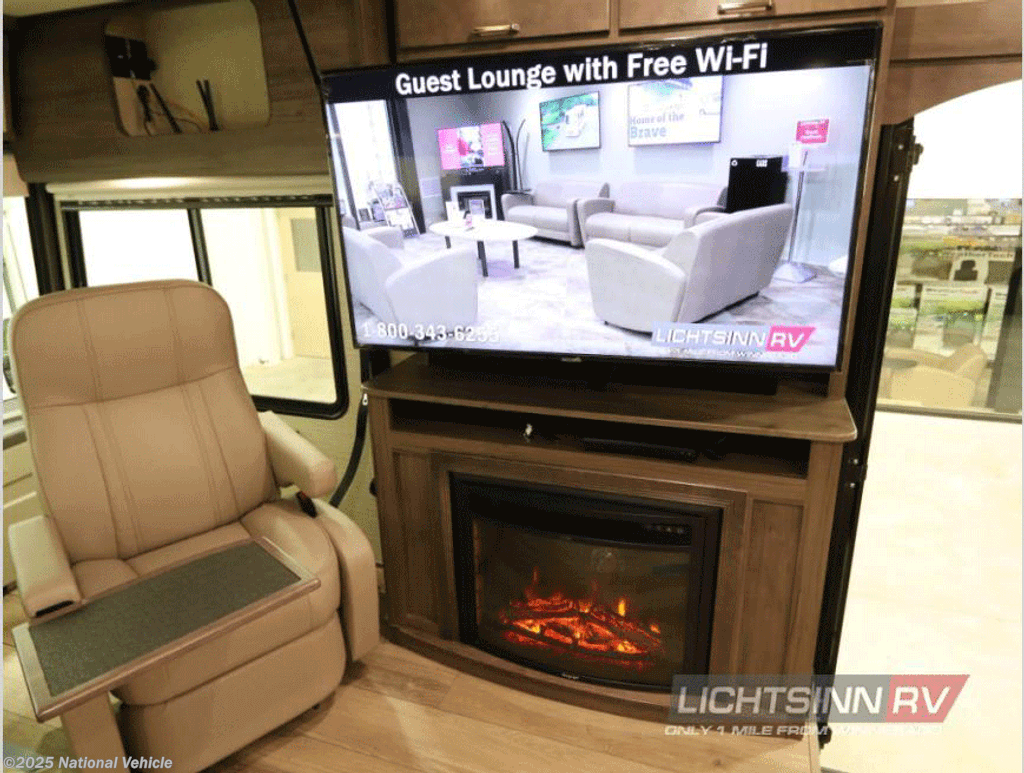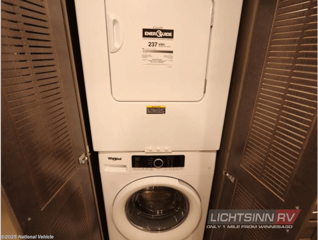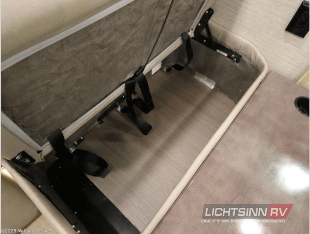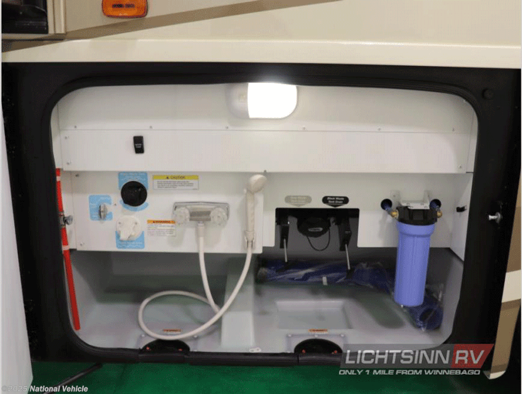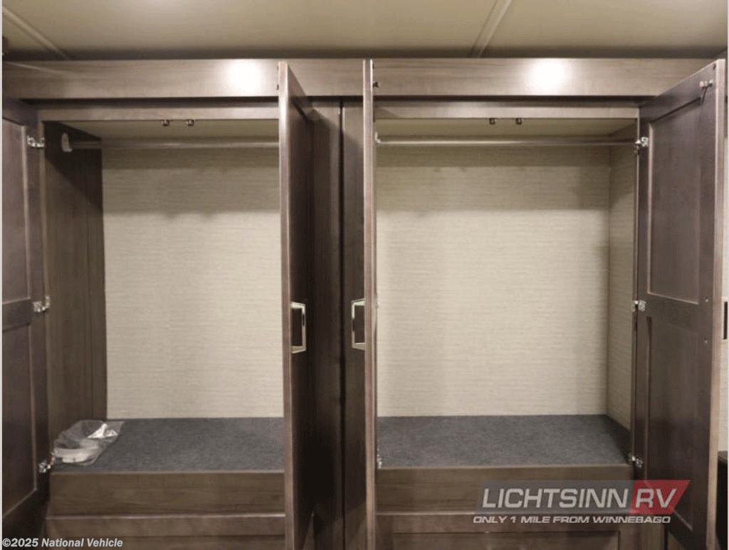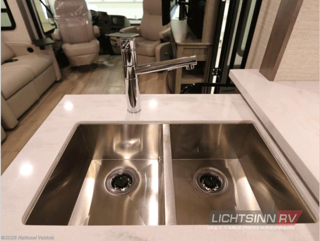 The rear master suite offers a walkaround queen bed, ample wardrobe space, and direct access to the dual-entry bath, complete with a large shower, vanity, and porcelain toilet. Throughout the coach, Winnebago?s signature design ensures maximum functionality and refined comfort.
