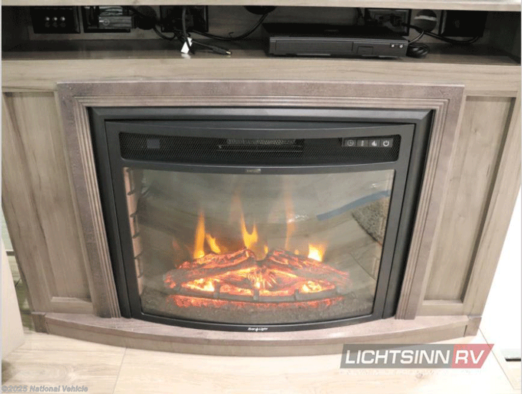 The spacious dual-slide floorplan opens to reveal a beautifully appointed interior with leather furnishings, solid-surface countertops, and high-end cabinetry. The extendable sectional sofa and booth dinette create a warm, inviting living area, while the electric fireplace adds a touch of home. The fully equipped galley kitchen features a residential refrigerator, convection microwave, three-burner range, and abundant storage, making meal prep effortless.