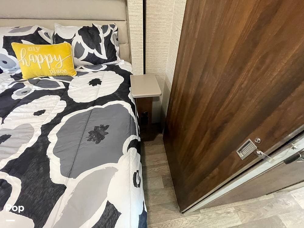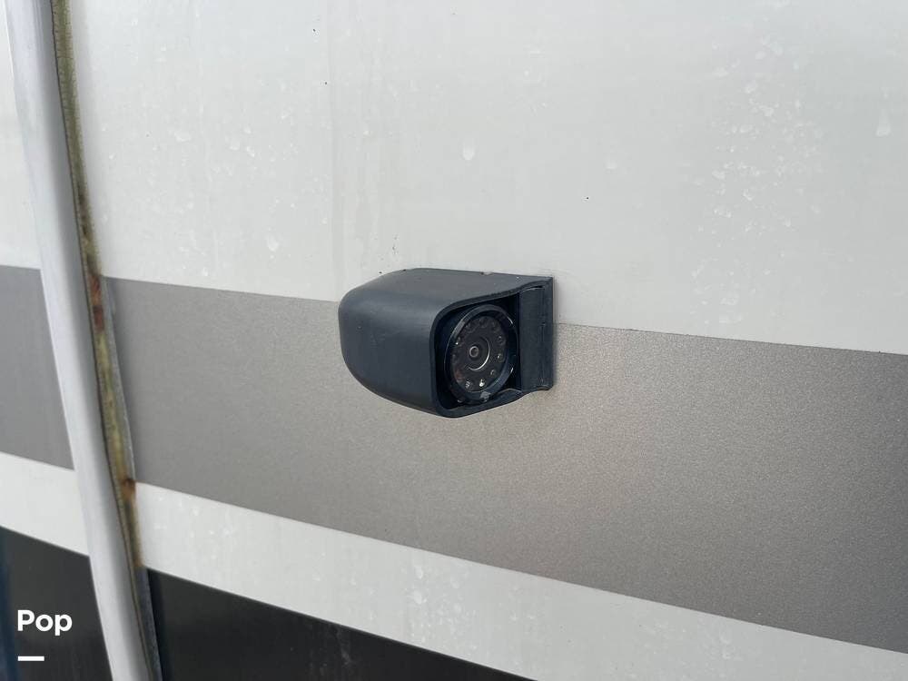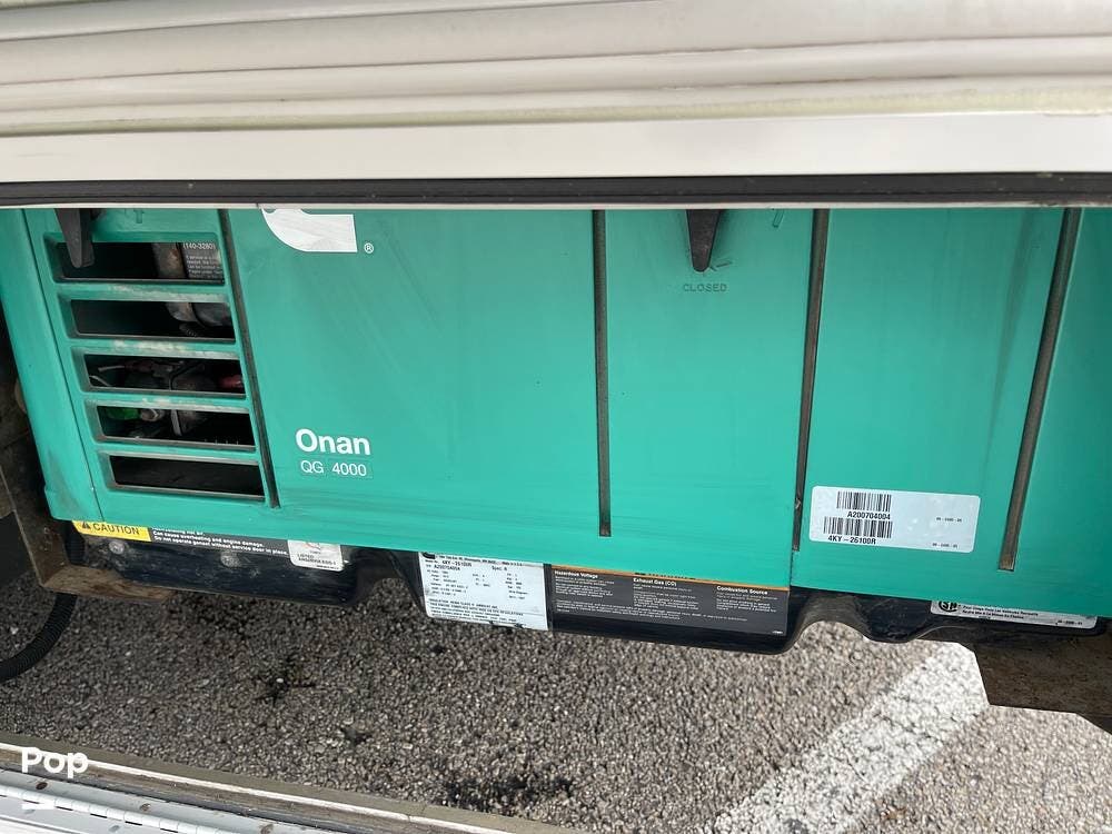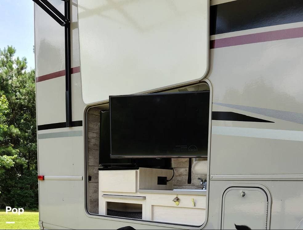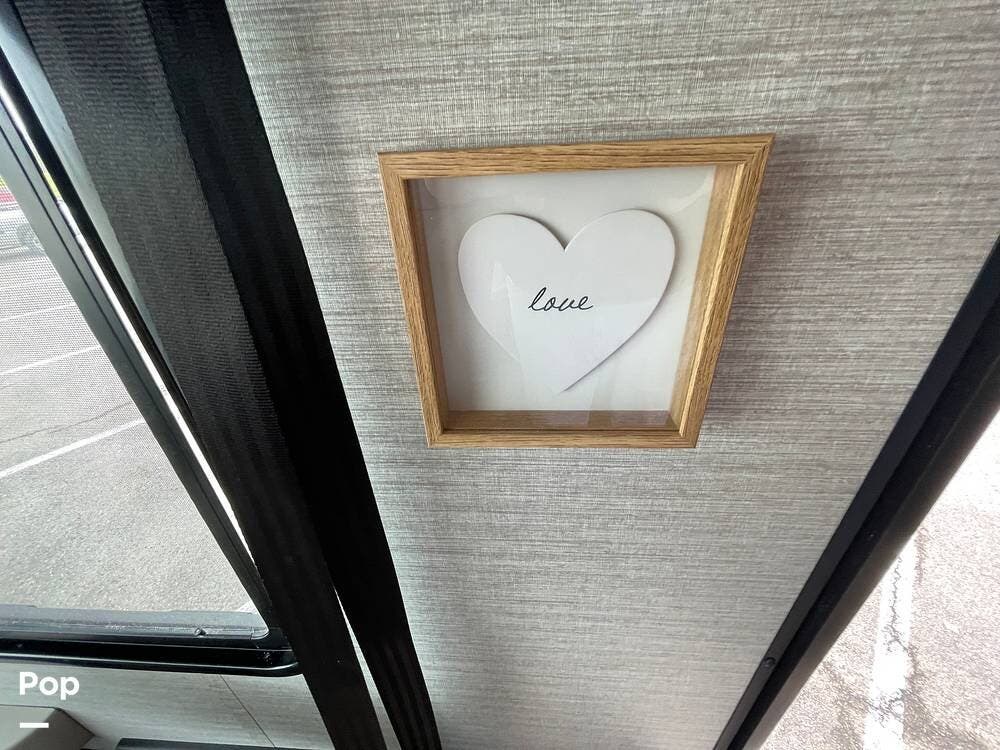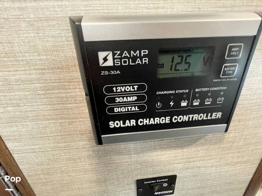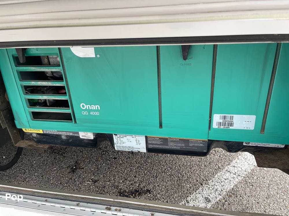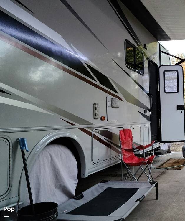 It has three slideouts, two rooftops, an A/C, a water heater, an Onan OG 4.0kW generator, and solar panels. It also has backup and side-vision cameras and enough in- and out-storage and closet space as a much larger coach.