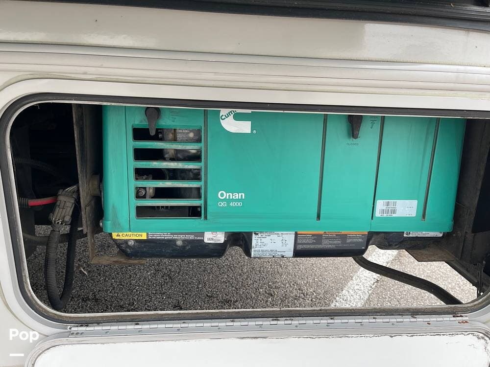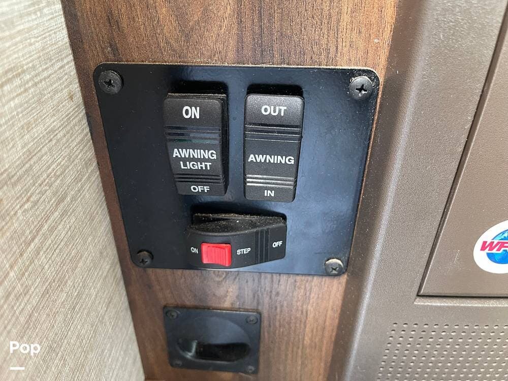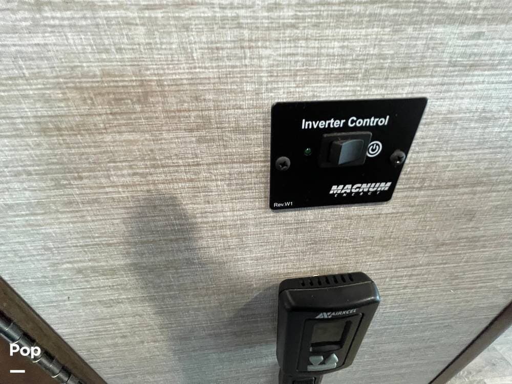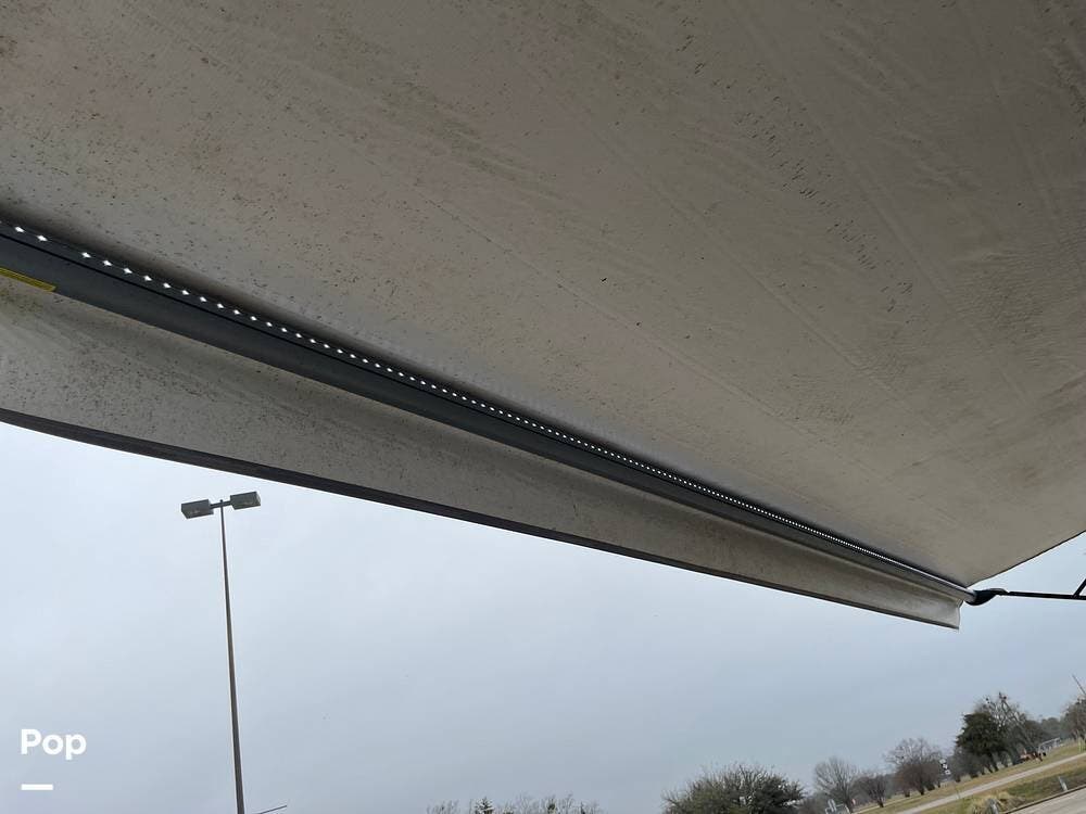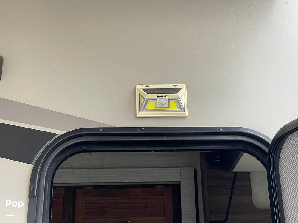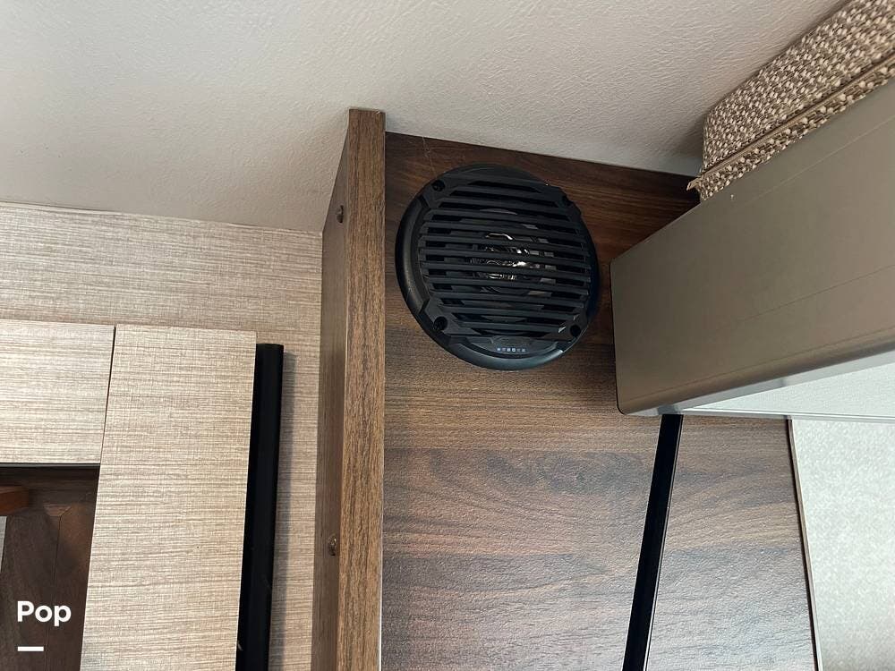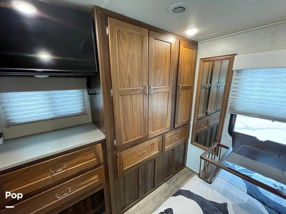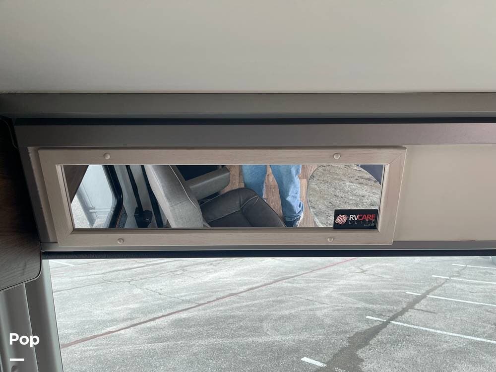 It has three slideouts, two rooftops, an A/C, a water heater, an Onan OG 4.0kW generator, and solar panels. It also has backup and side-vision cameras and enough in- and out-storage and closet space as a much larger coach.
