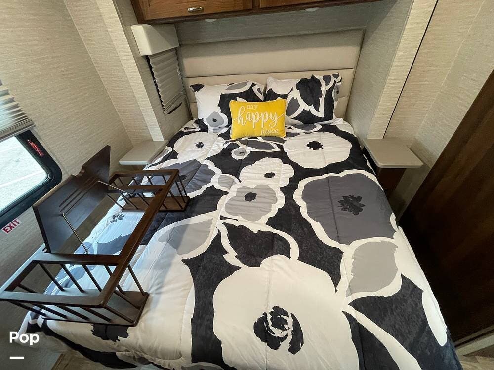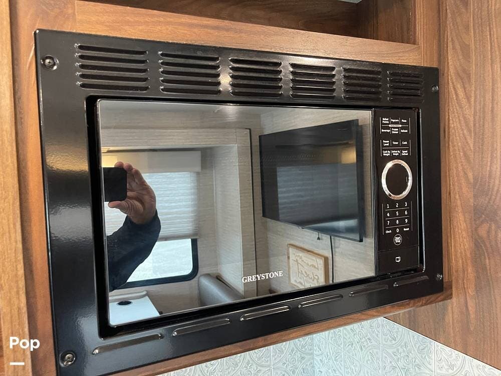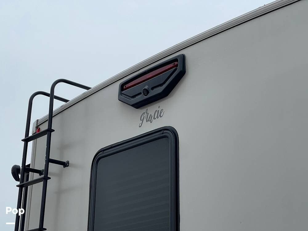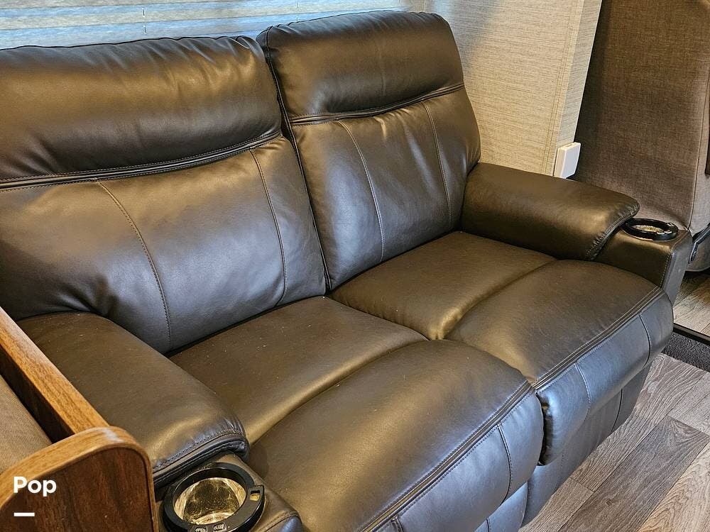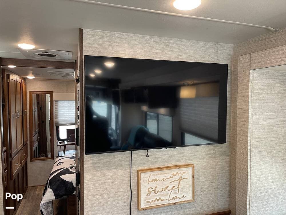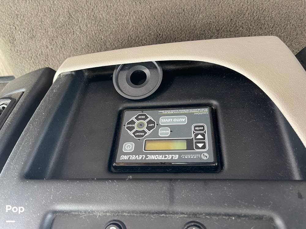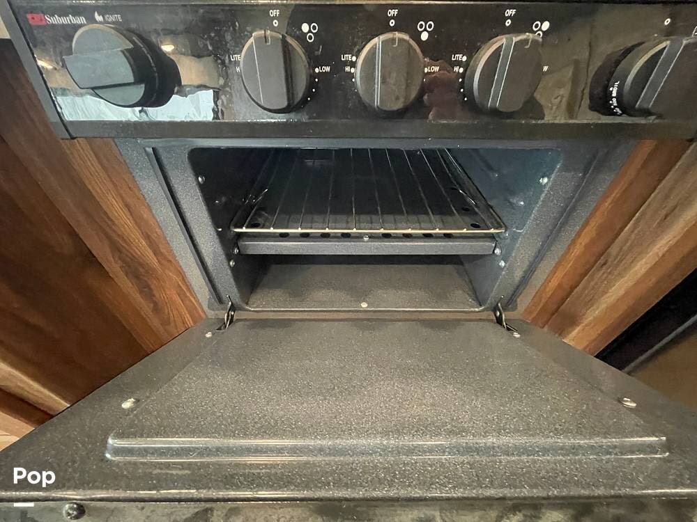 It has three slideouts, two rooftops, an A/C, a water heater, an Onan OG 4.0kW generator, and solar panels. It also has backup and side-vision cameras and enough in- and out-storage and closet space as a much larger coach.