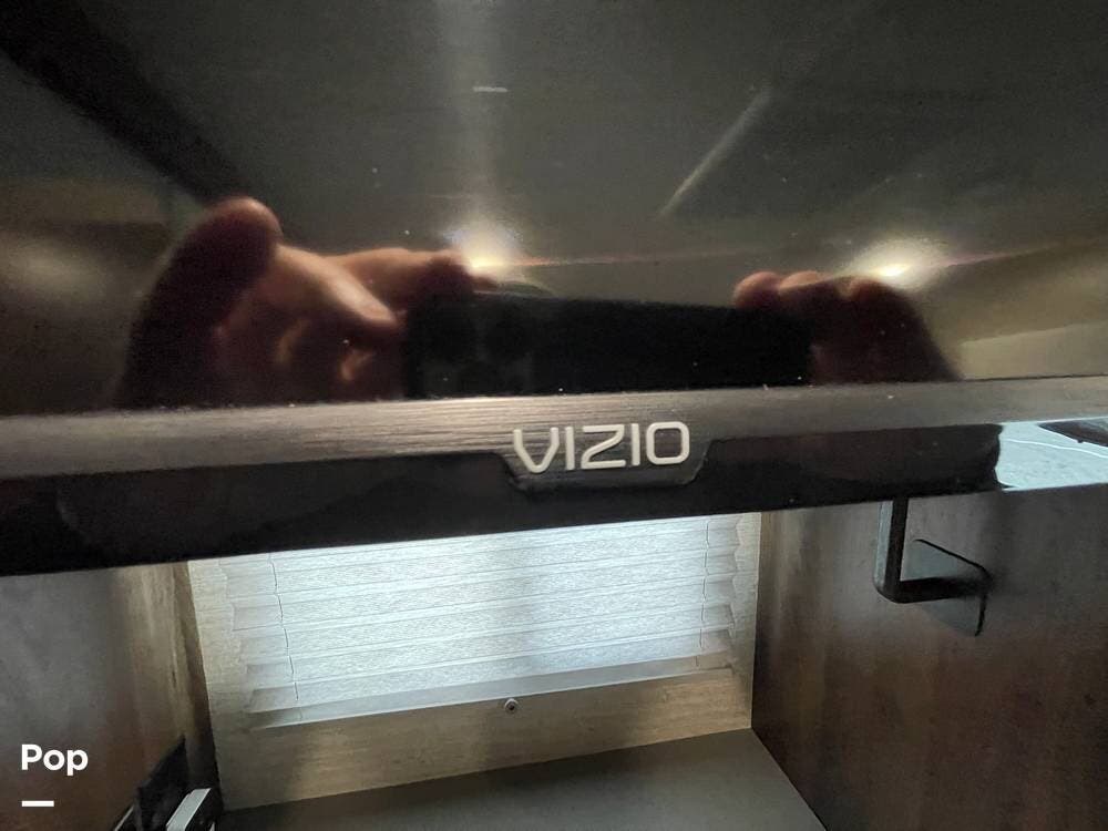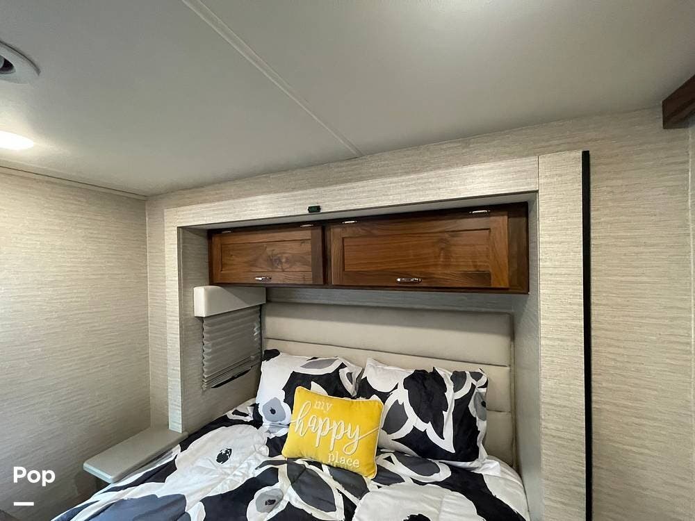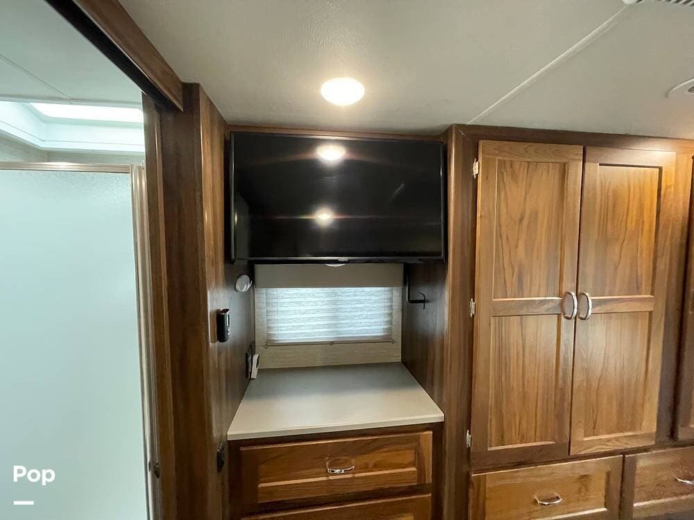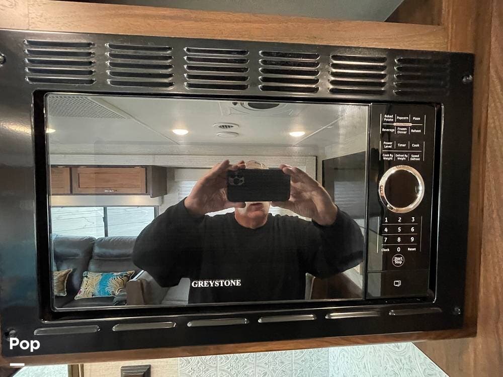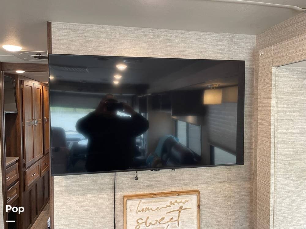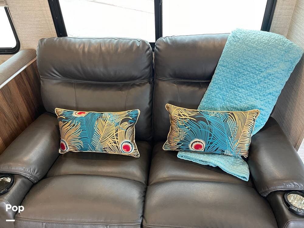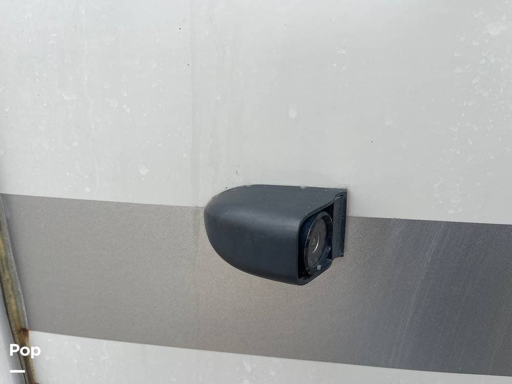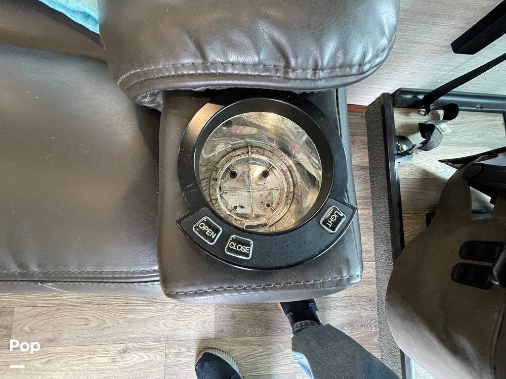 It has three slideouts, two rooftops, an A/C, a water heater, an Onan OG 4.0kW generator, and solar panels. It also has backup and side-vision cameras and enough in- and out-storage and closet space as a much larger coach.