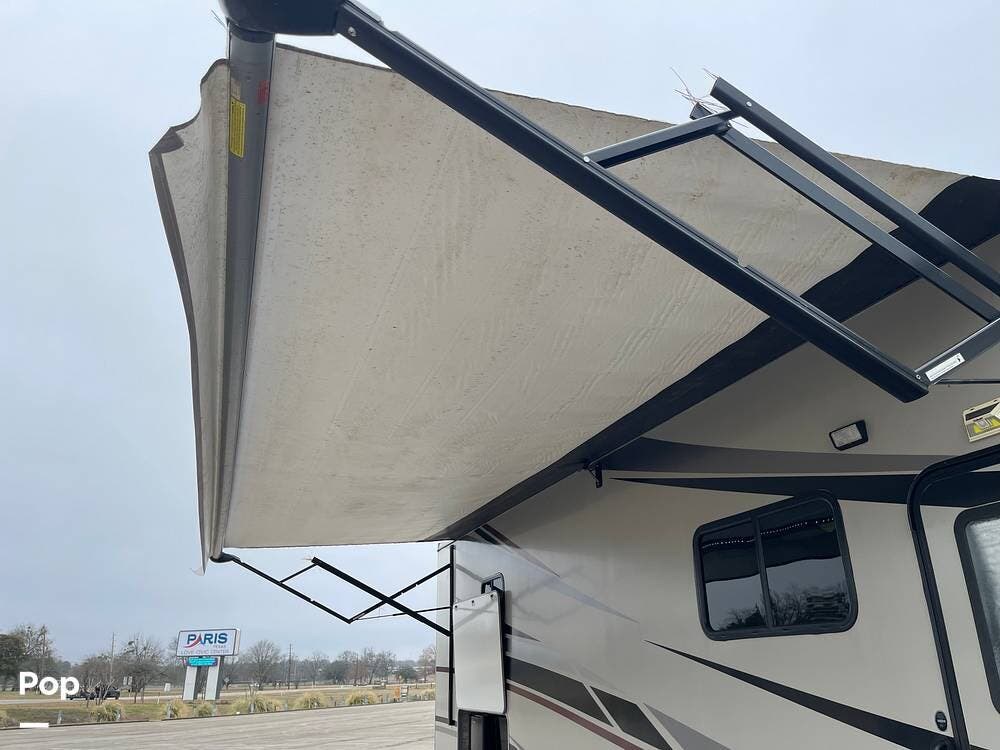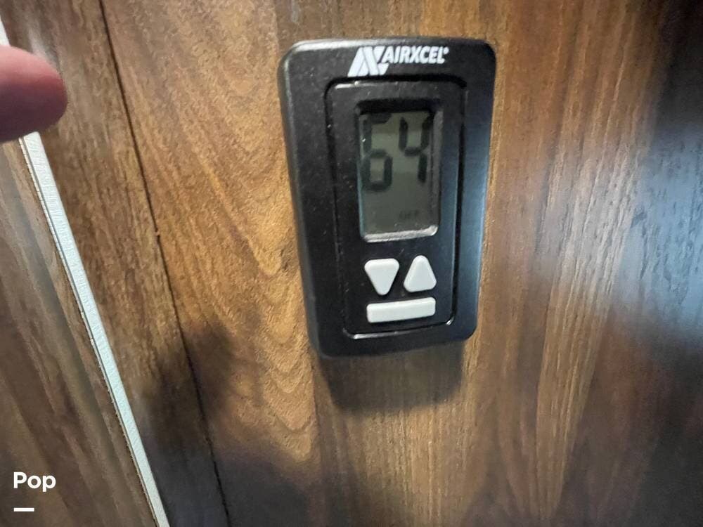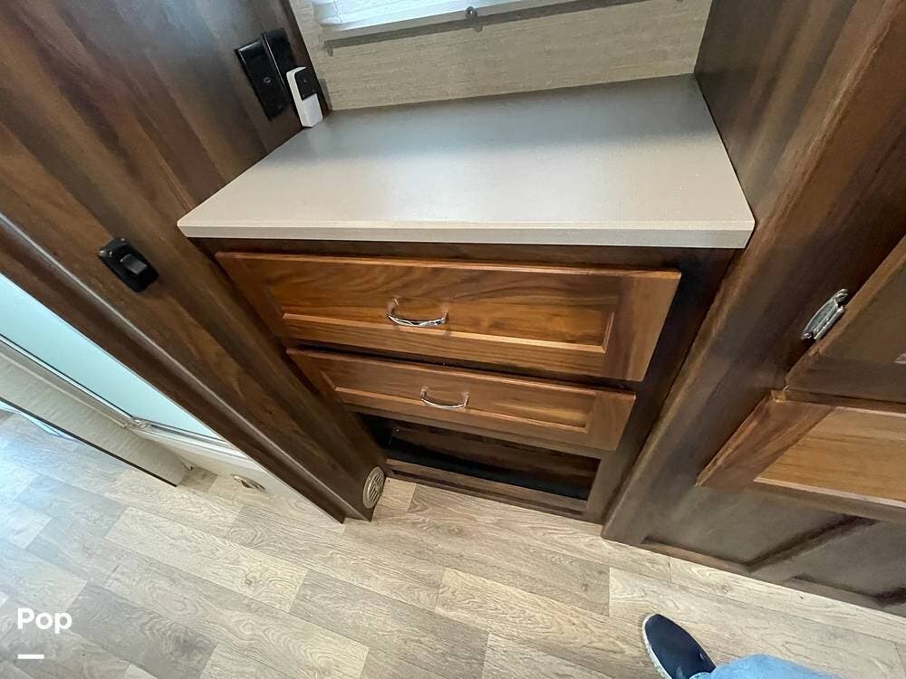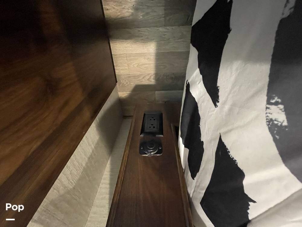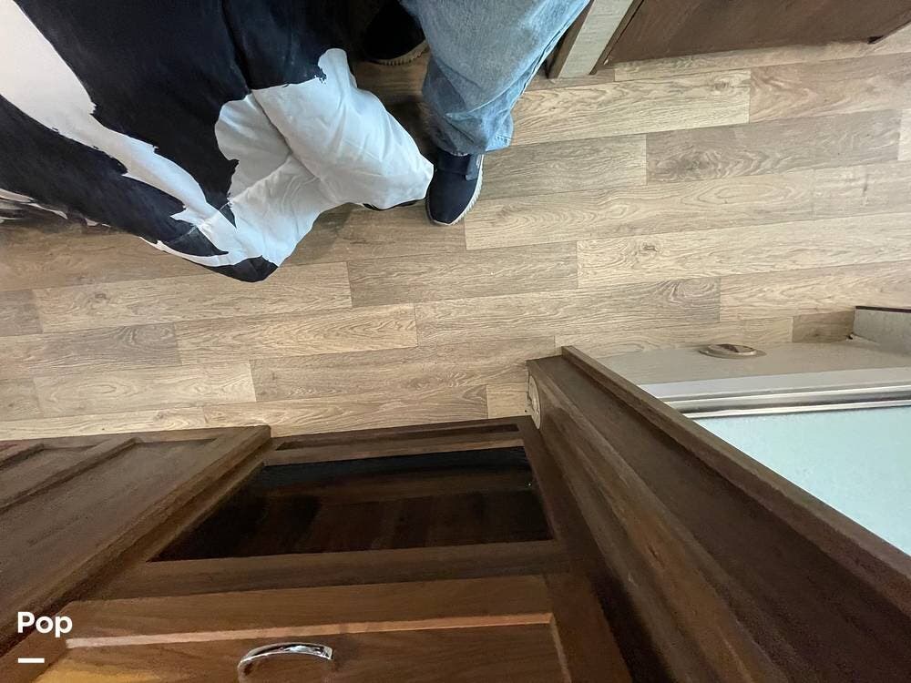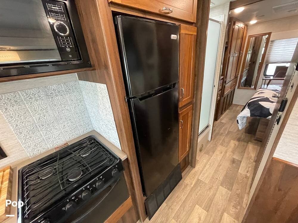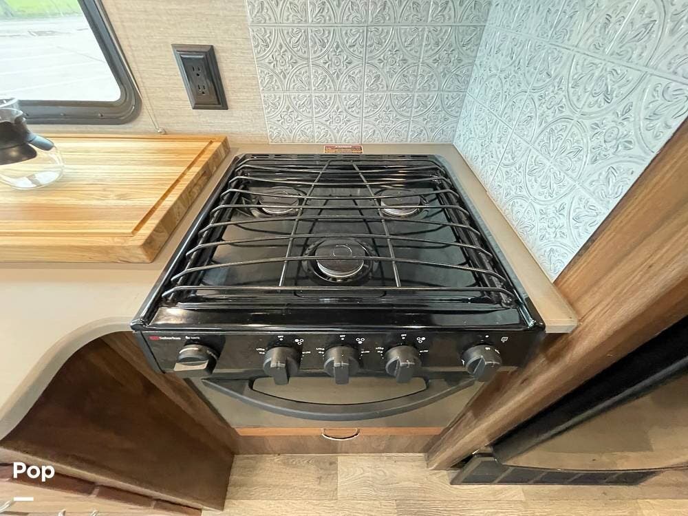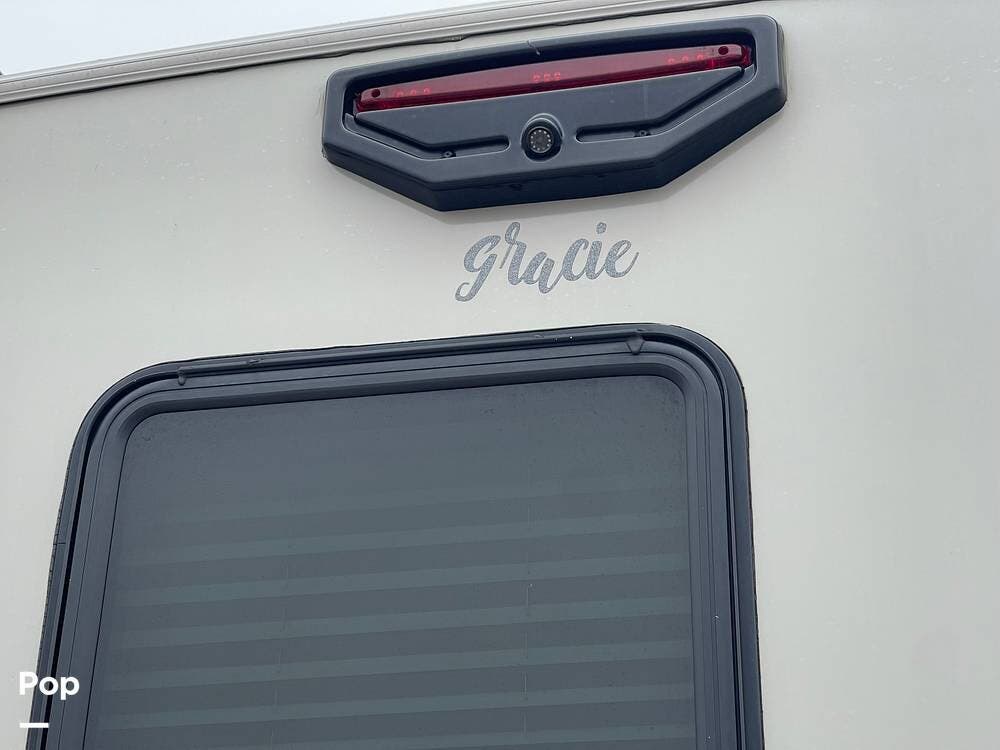 It has three slideouts, two rooftops, an A/C, a water heater, an Onan OG 4.0kW generator, and solar panels. It also has backup and side-vision cameras and enough in- and out-storage and closet space as a much larger coach.