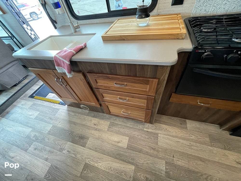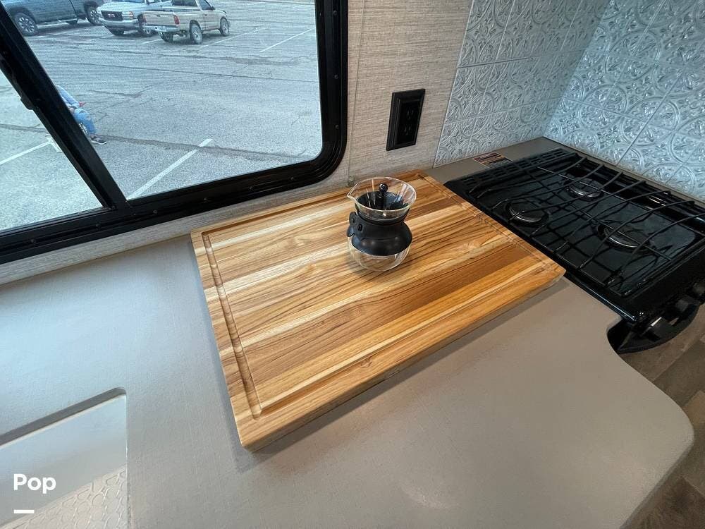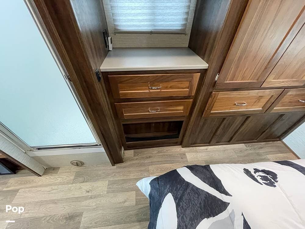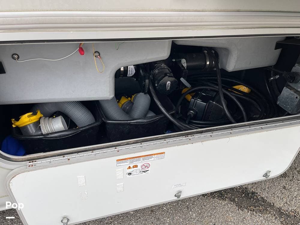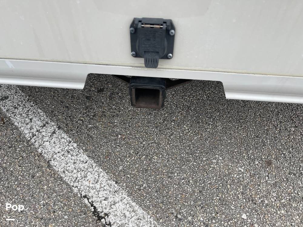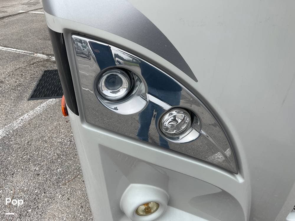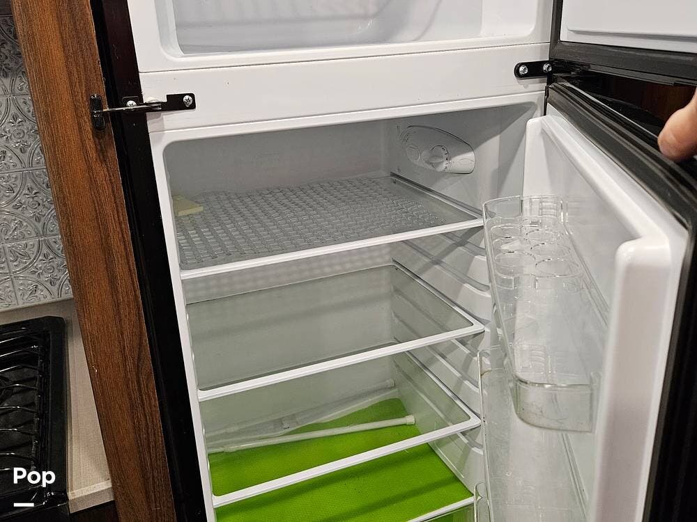 It has three slideouts, two rooftops, an A/C, a water heater, an Onan OG 4.0kW generator, and solar panels. It also has backup and side-vision cameras and enough in- and out-storage and closet space as a much larger coach.