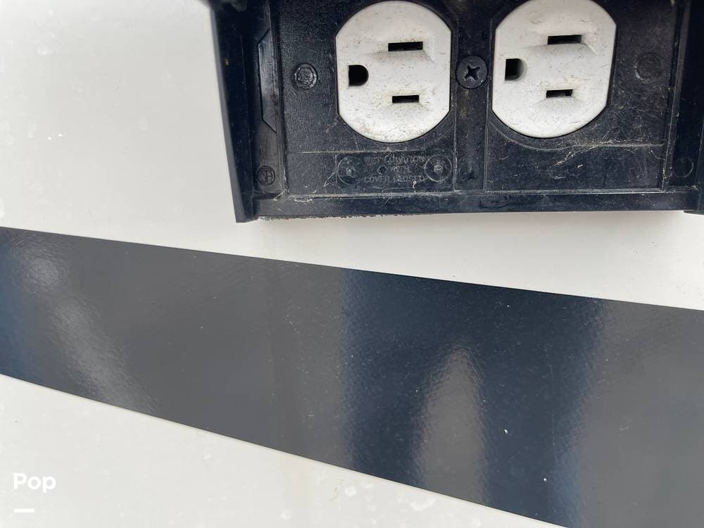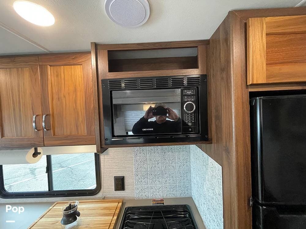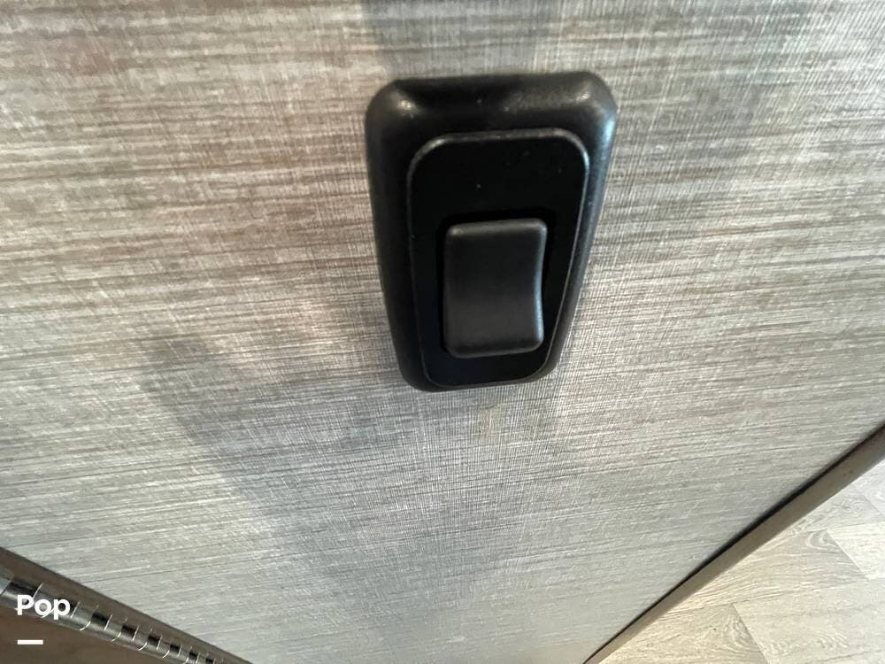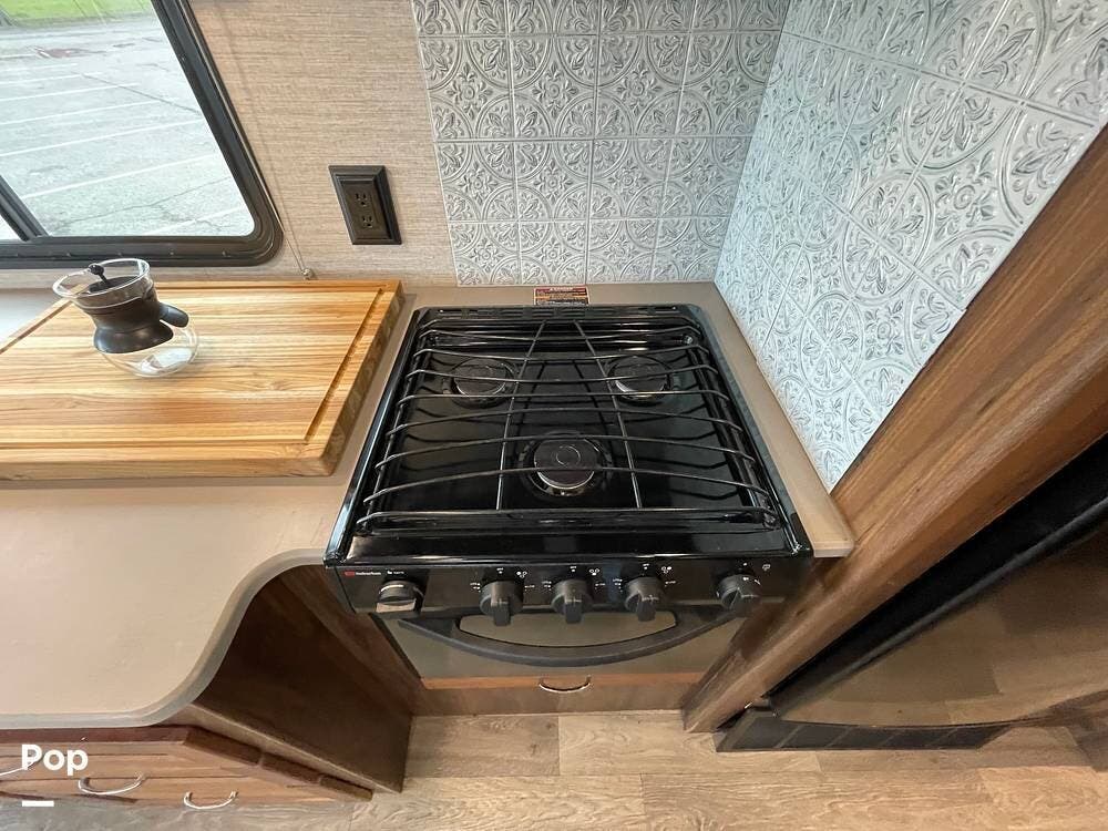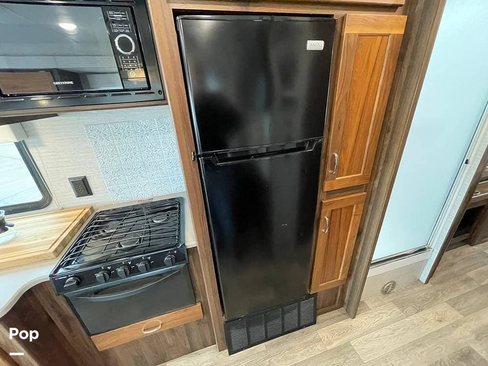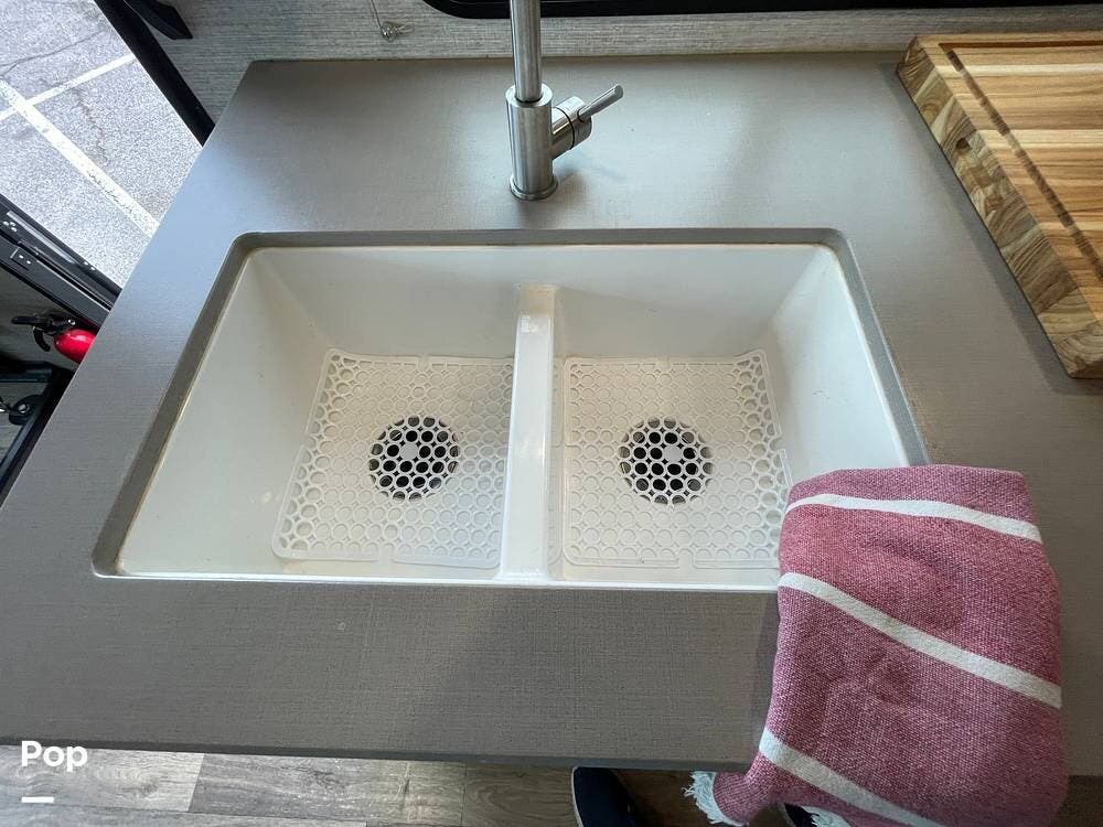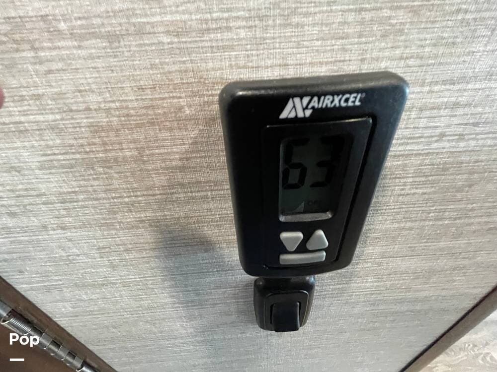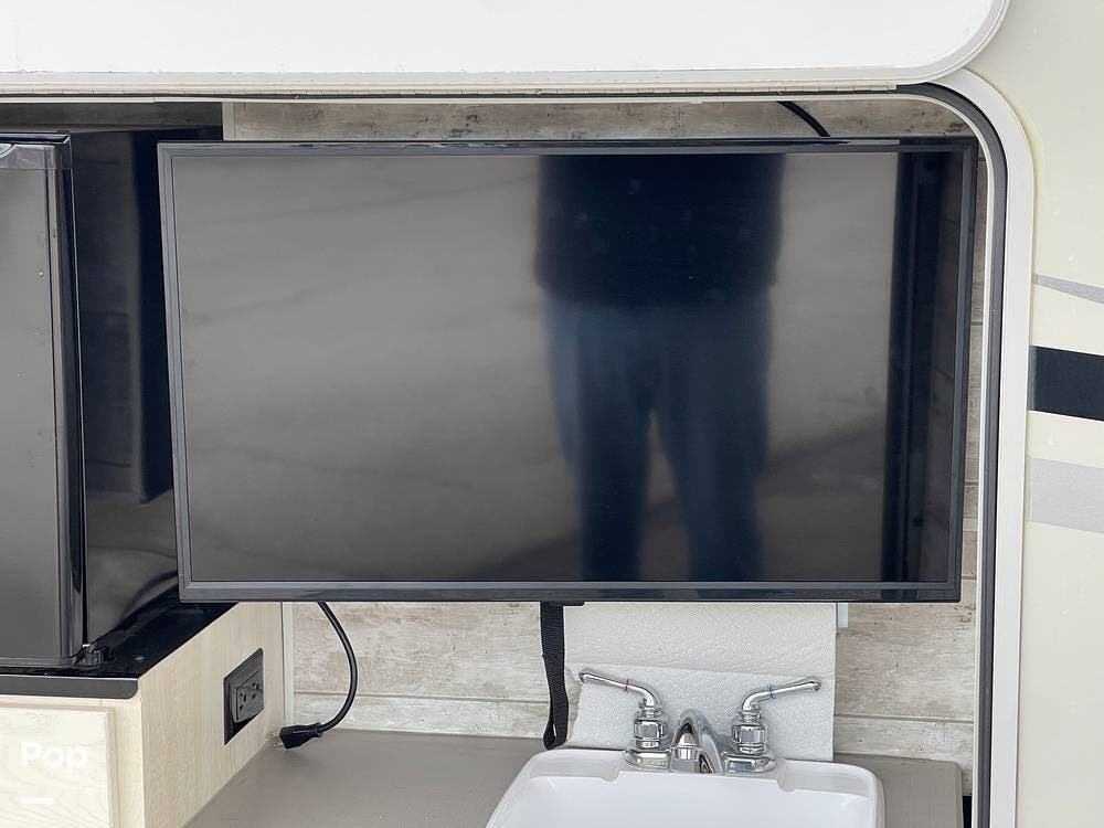 It has three slideouts, two rooftops, an A/C, a water heater, an Onan OG 4.0kW generator, and solar panels. It also has backup and side-vision cameras and enough in- and out-storage and closet space as a much larger coach.