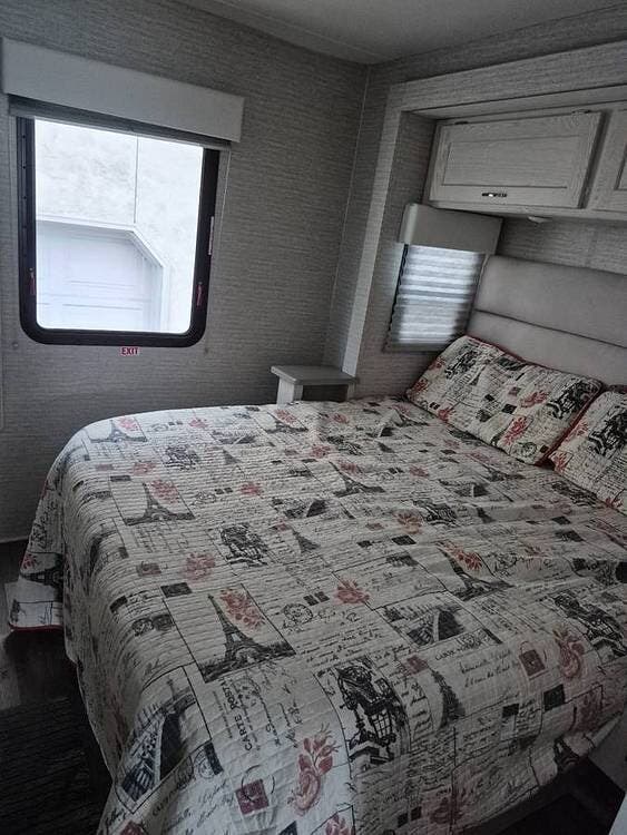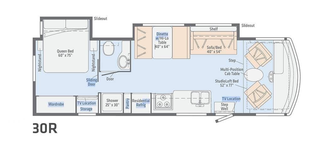 This Intent is a family machine! The 30R can comfortably sleep up to 6 people in 4 separate spaces: two in the rear primary suite, up to two on the dinette that converts to a sleeper, and two more on the sleeper sofa. There is also a drop-down loft over the cab.