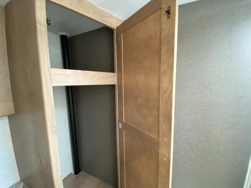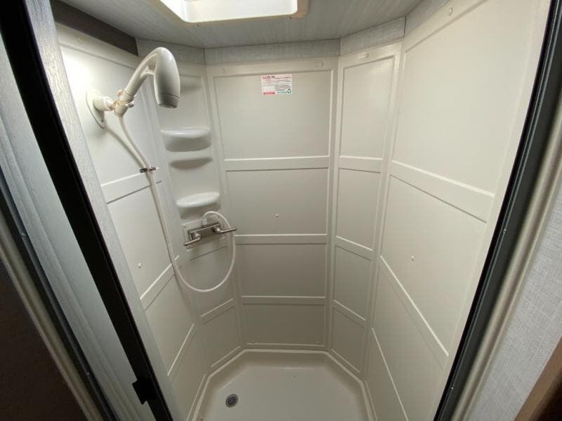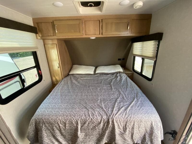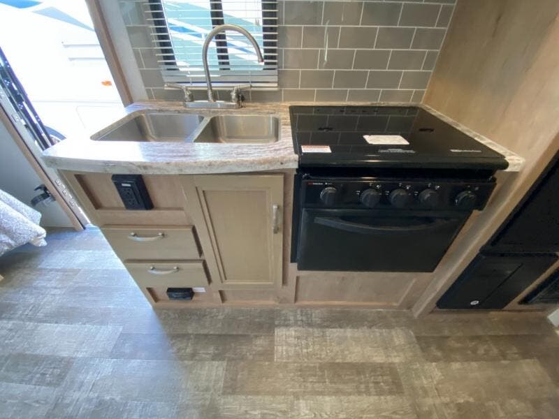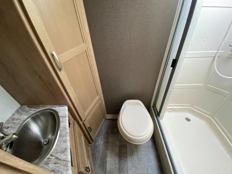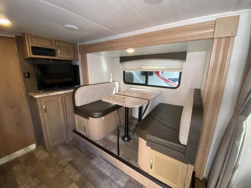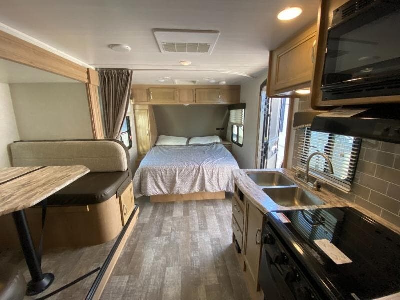 Isn't it time to start planning your next vacation? Skip the tent and choose this travel trailer that will sleep four. Mom and dad will enjoy the front RV queen bed and the dinette will be a great spot for an extra guest or two children. You can prepare breakfast every morning on the three-burner range, then head out to find adventure. This unit features a full rear bath that you are sure to appreciate and the skylight provides more standing space and lets natural light in. Since you spent all day outside, let the kids pop some popcorn in the microwave and enjoy movie night!