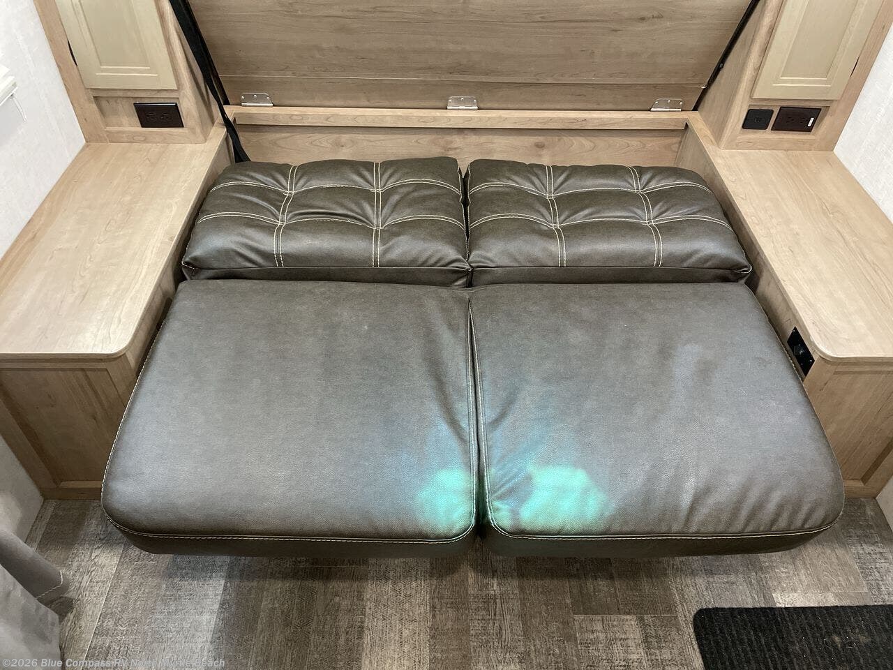 If you are looking to upgrade your RV for the family, look no further than this travel trailer that features bunk beds and can sleep up to six. The rear bath is right next to the bunks, making it easy for nighttime restroom runs for the little ones. In the morning, the chef of the family can prepare breakfast on the three-burner range and you can enjoy it at the booth dinette within the slide out or take it outside and sit under the awning as you plan out your day. Mom and dad will love the Murphy bed at the front of the unit and the divider curtain that provides a little extra privacy. This unit also includes an exterior Pack-N-Play door for your hiking gear.