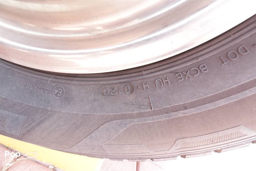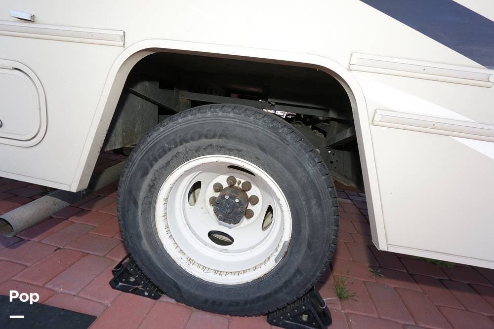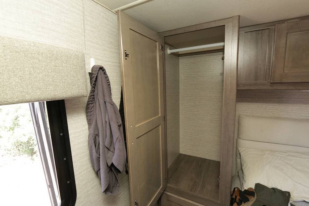 Inside, you'll find a large living area with a convertible dinette, a jack knife sofa, a flat-screen TV, a stereo, and an over-cab bunk.