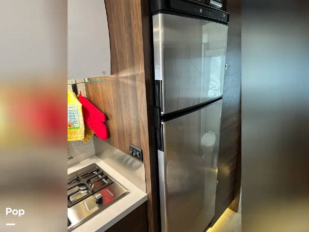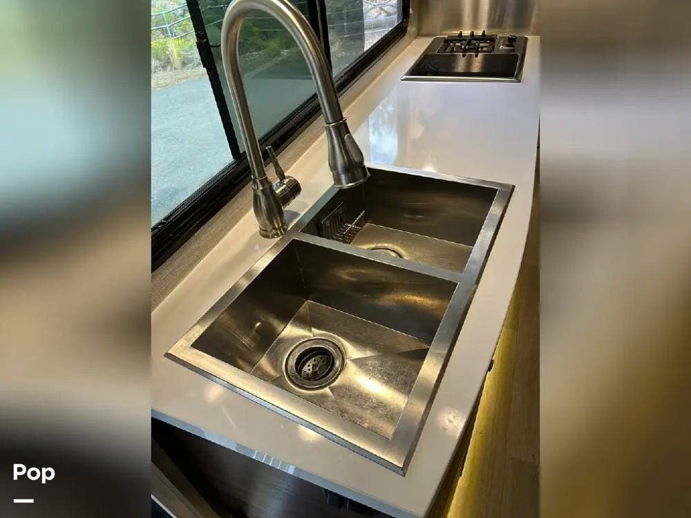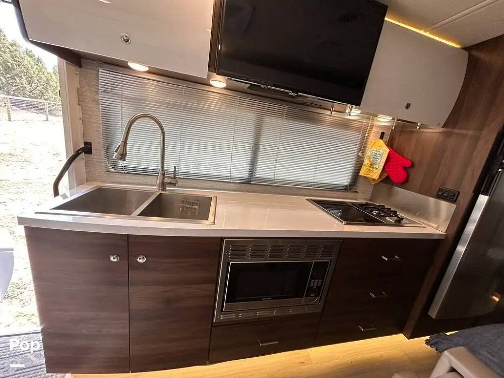 The kitchen area is well-equipped with a dual burner LP and induction cooktop, a convection microwave, and a spacious refrigerator.