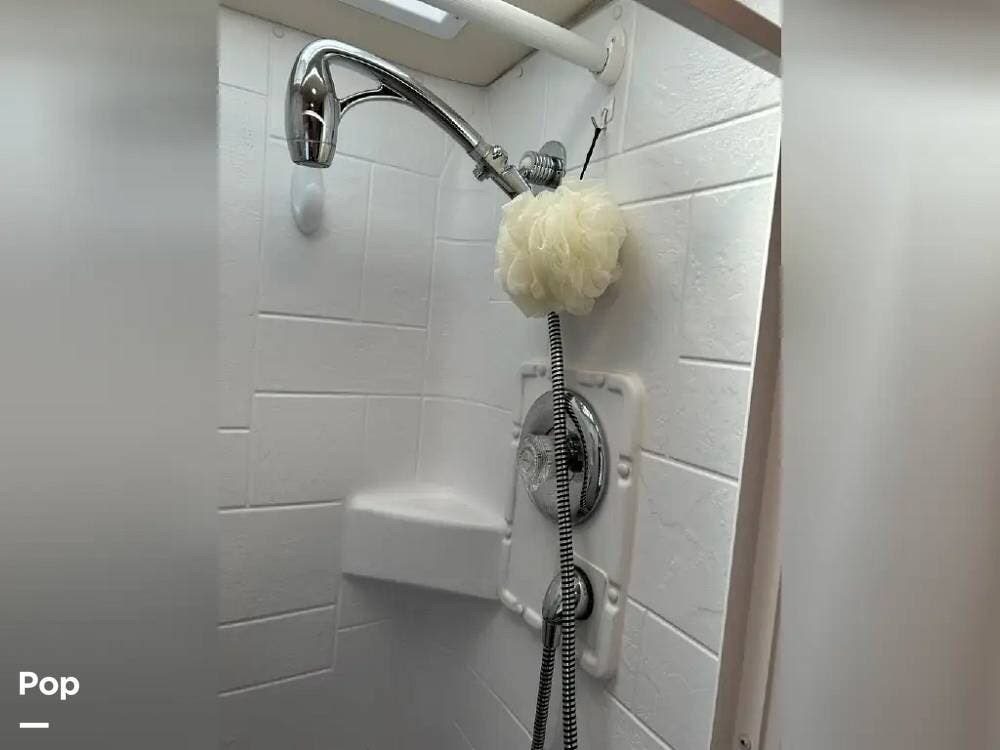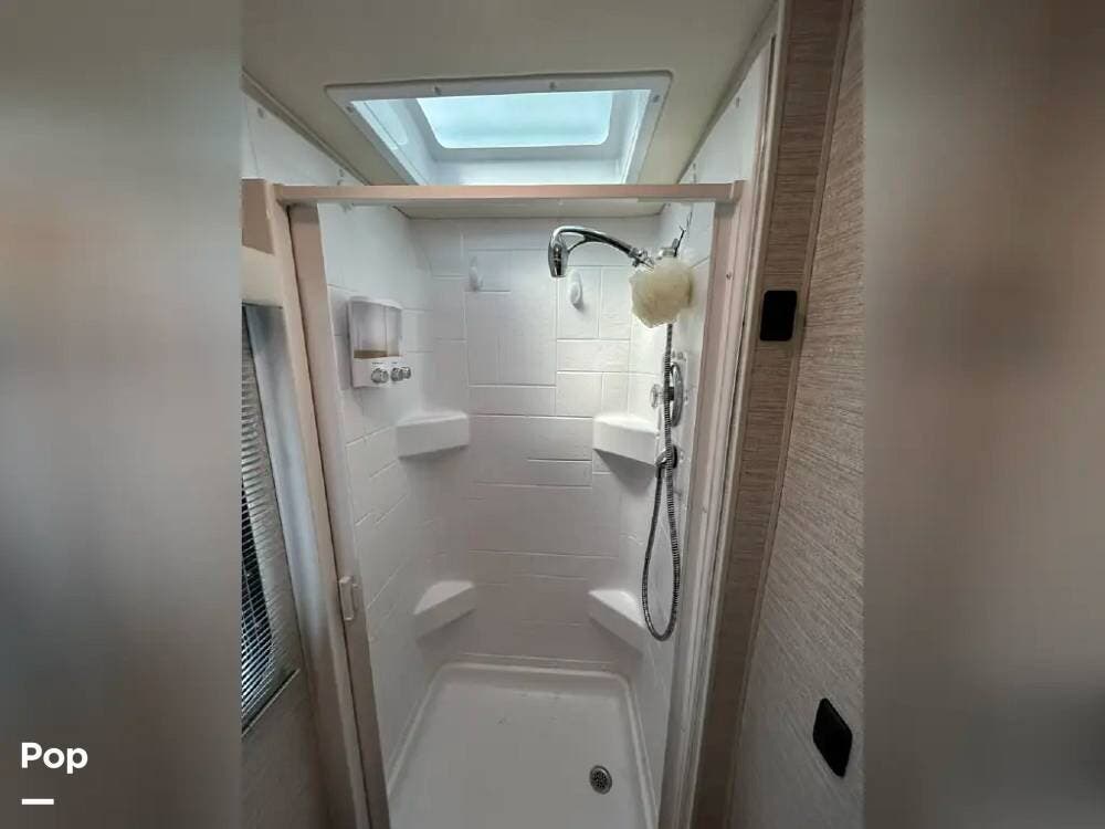 At the rear of the coach is a full bathroom that spans the width of the RV. It features a shower with a skylight, a toilet, a medicine cabinet, and a vanity sink.