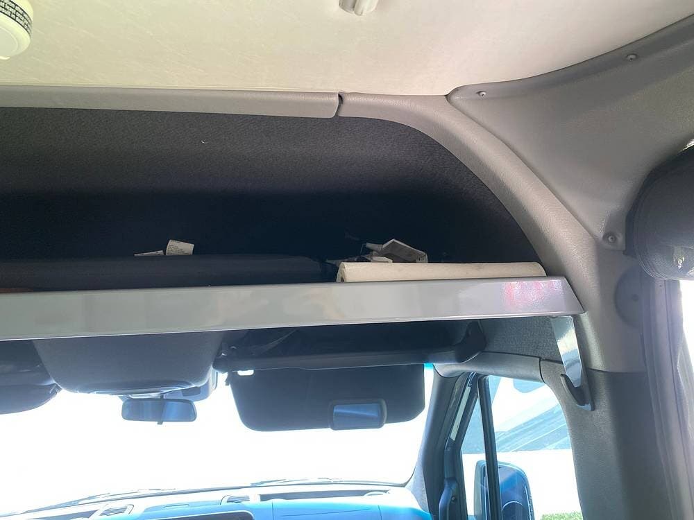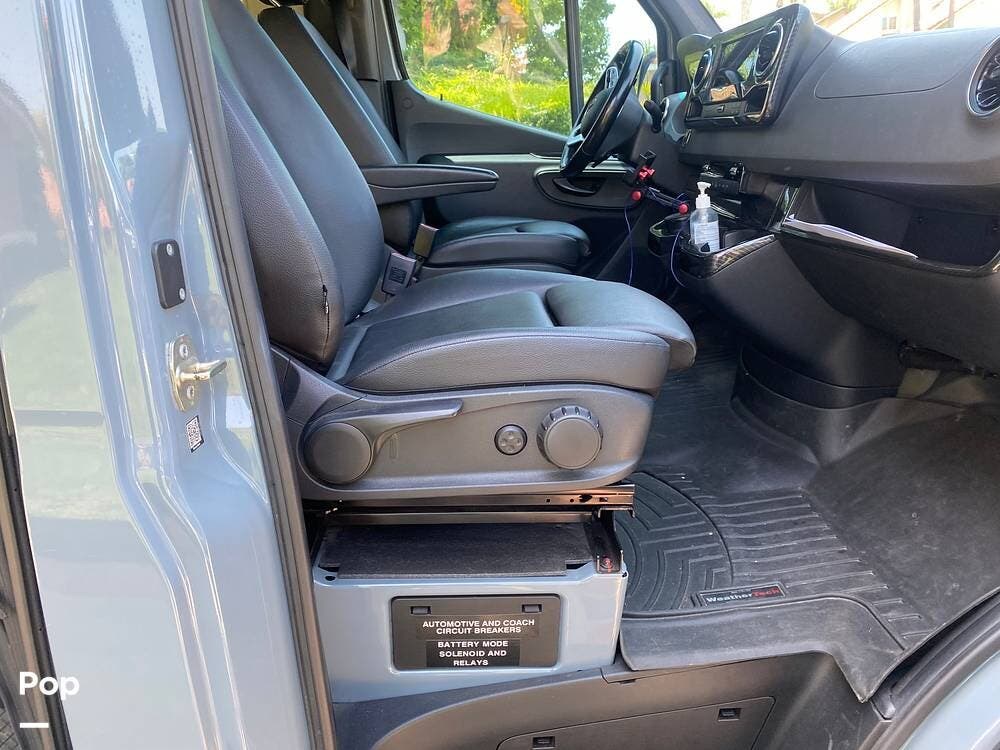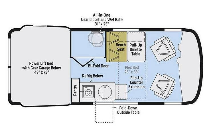 The functional interior design features a modern cabin with leather swivel driver and passenger seats, a compact wet bath (cassette-style toilet), and a unique 49" x79" power lift bed.