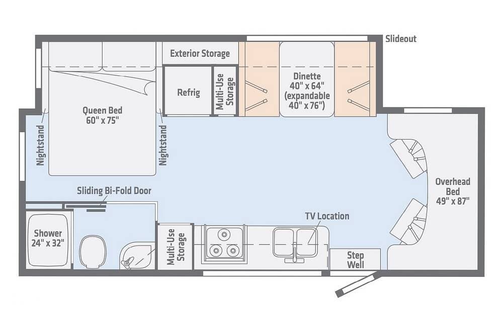 Comfort is king in this Vita! There is room for 6 to sleep, featuring a bed over the cab, a dinette sleeper, and a queen bed in the back. The cab seats swivel to create a comfortable social living area, and two booster cushions are available for added seat height.